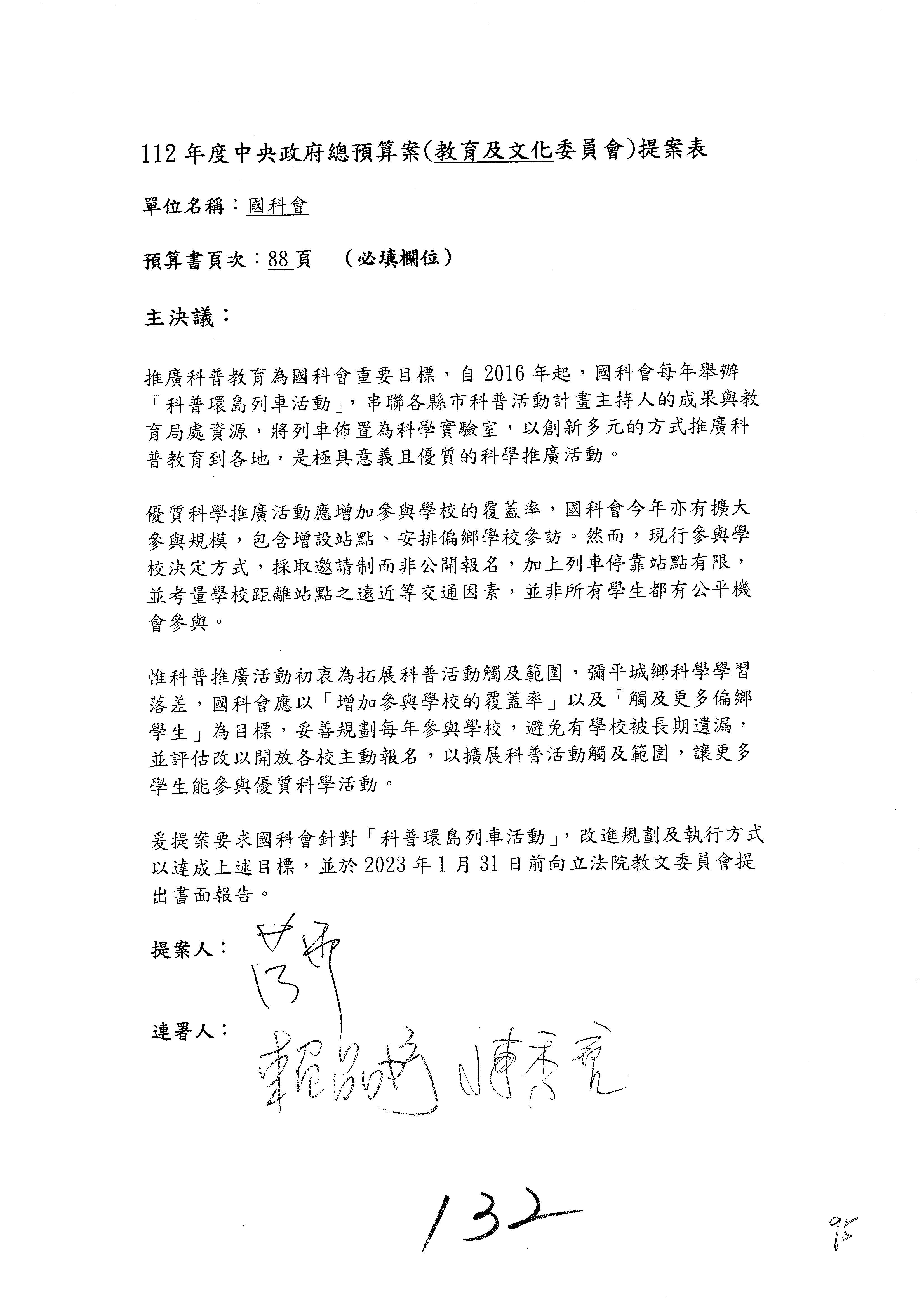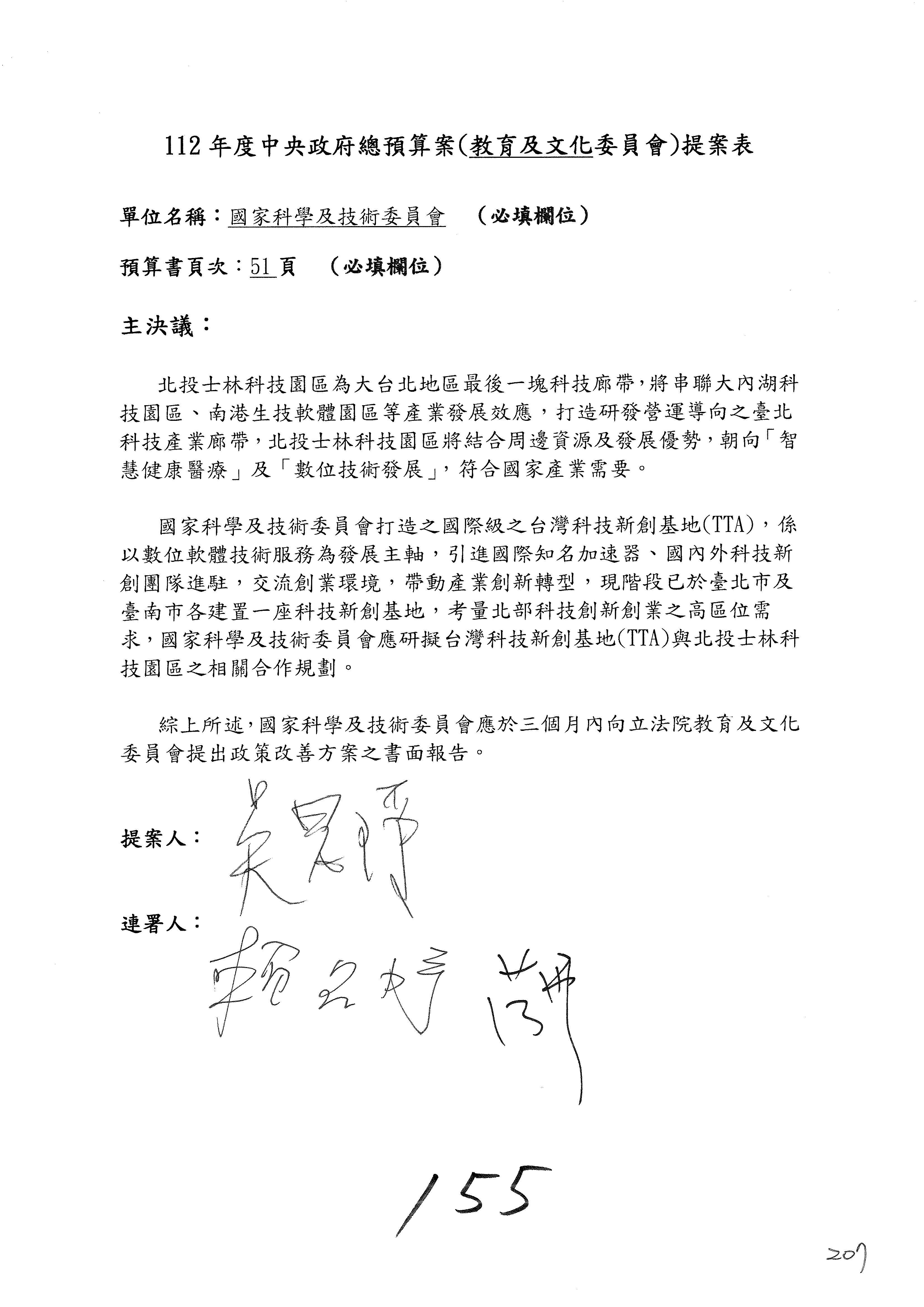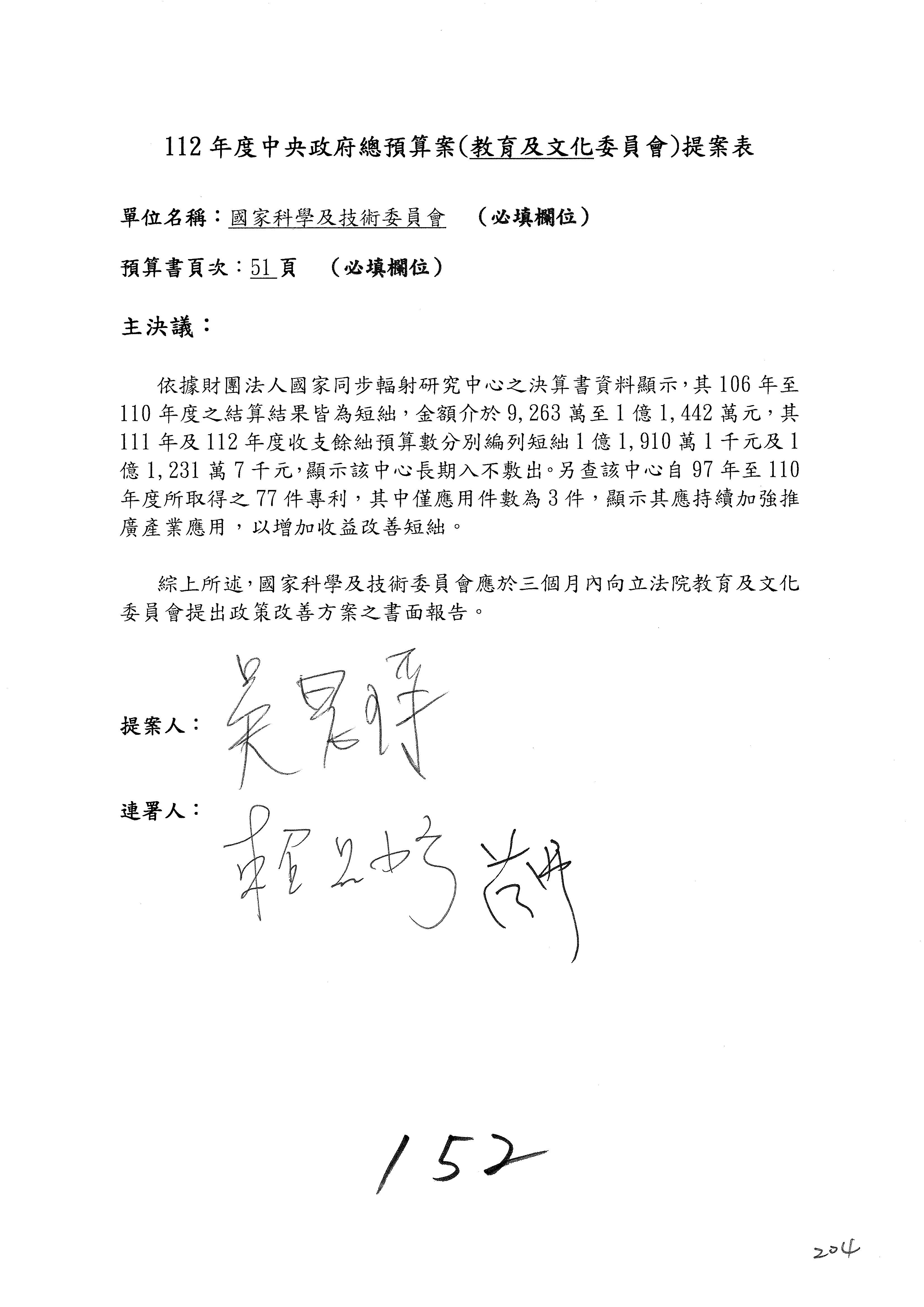 現在進行預算審查,請議事人員宣讀預算數及委員提案內容:國家科學及技術委員會及所屬單位預算案總計205案、國家科學技術發展基金附屬單位預算案17案、國家科學及技術委員會主管科學園區管理局作業基金附屬單位預算案5案、國家災害防救科技中心預算案3案,並進行討論與協商,討論時,如有新增或修正文字之主決議,請議事人員一併宣讀。