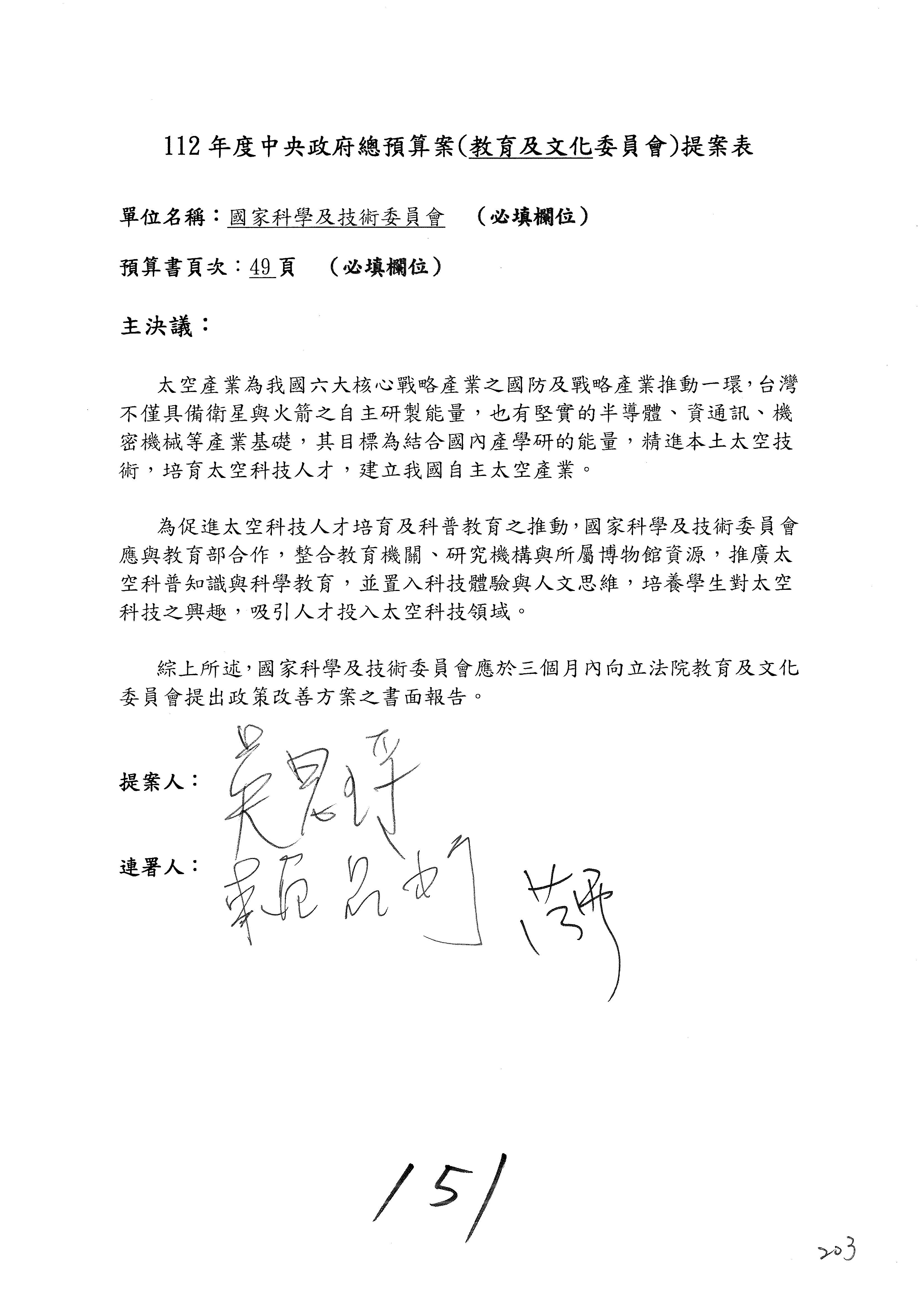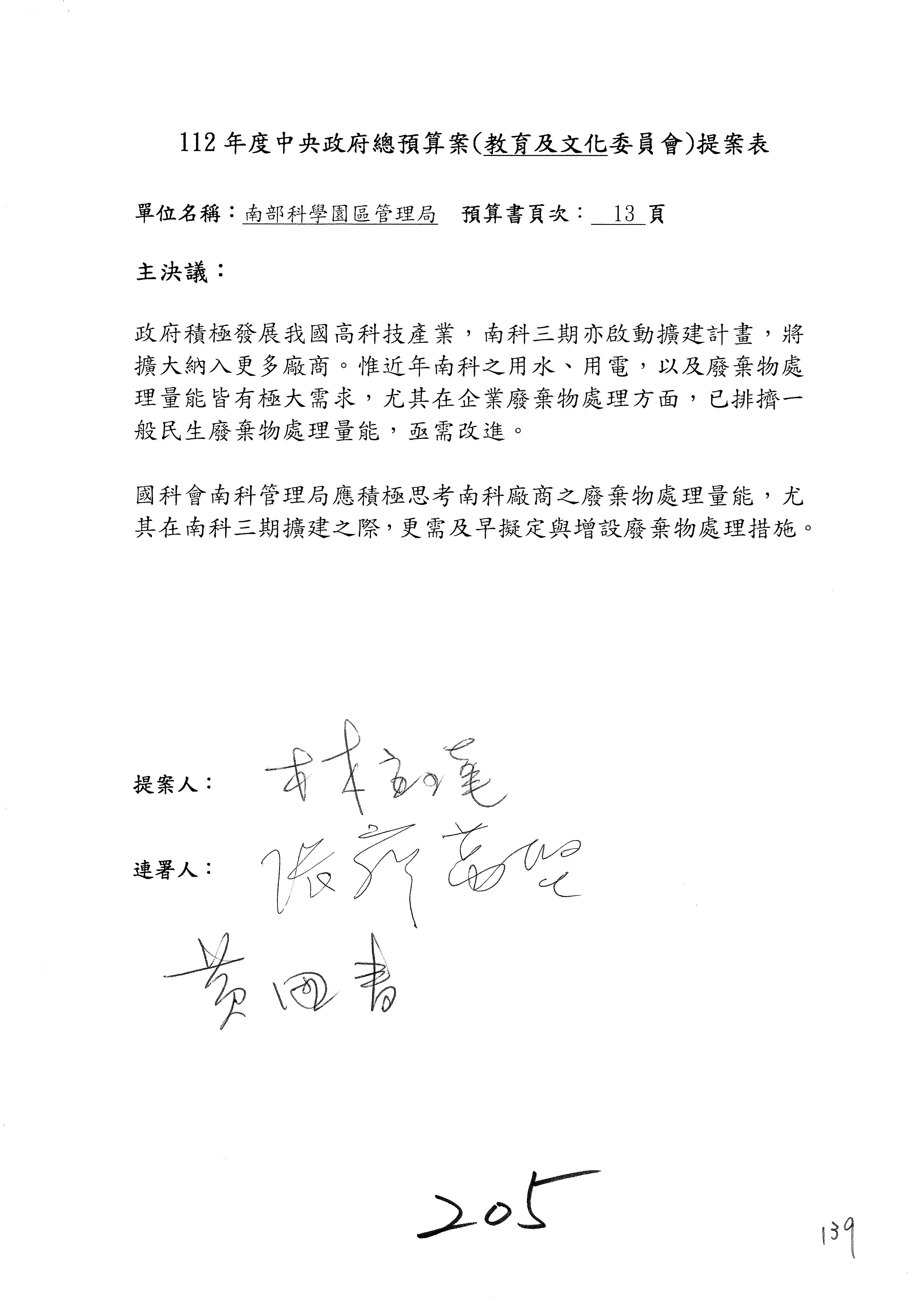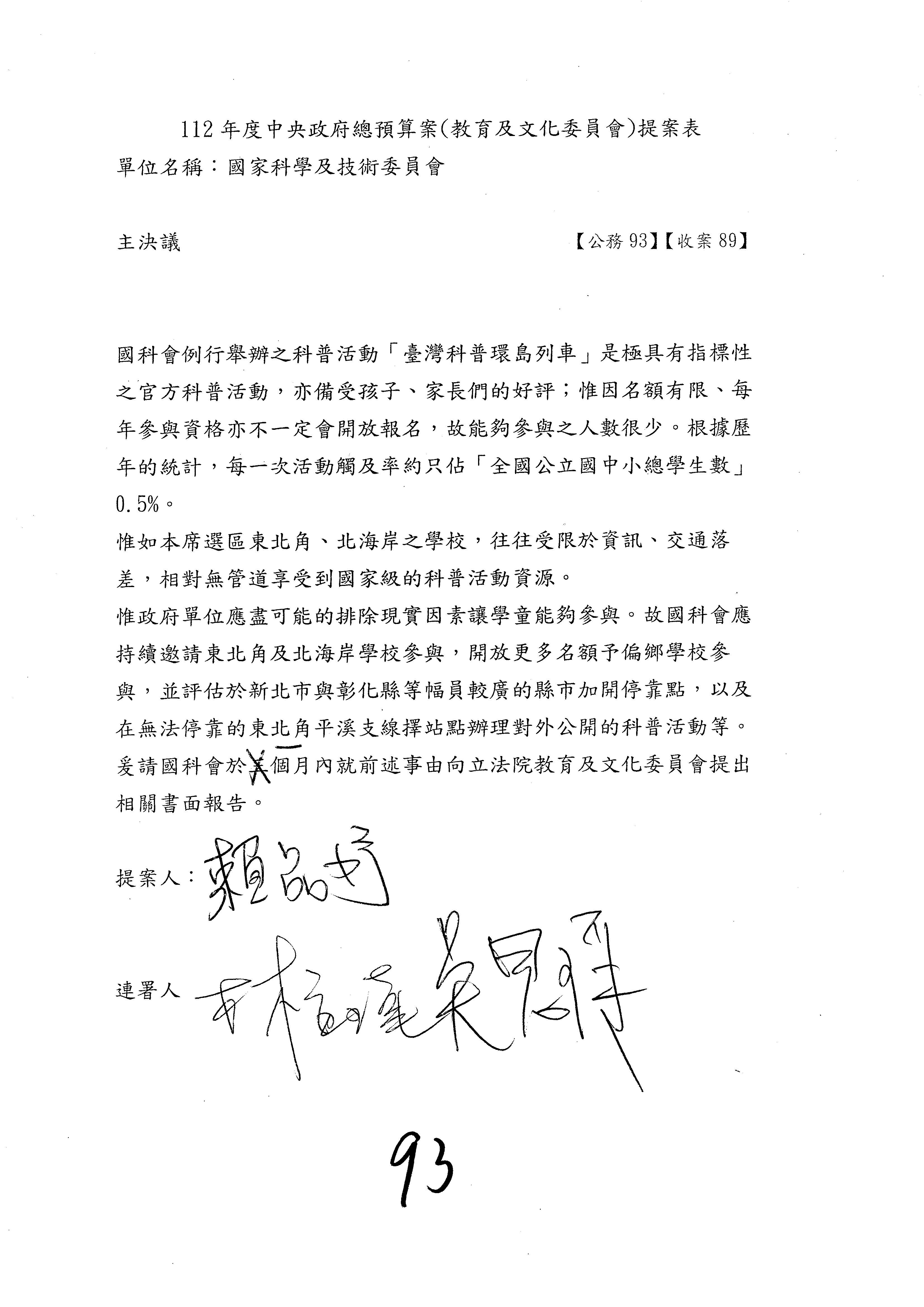 現在進行預算審查,請議事人員宣讀預算數及委員提案內容:國家科學及技術委員會及所屬單位預算案總計205案、國家科學技術發展基金附屬單位預算案17案、國家科學及技術委員會主管科學園區管理局作業基金附屬單位預算案5案、國家災害防救科技中心預算案3案,並進行討論與協商,討論時,如有新增或修正文字之主決議,請議事人員一併宣讀。