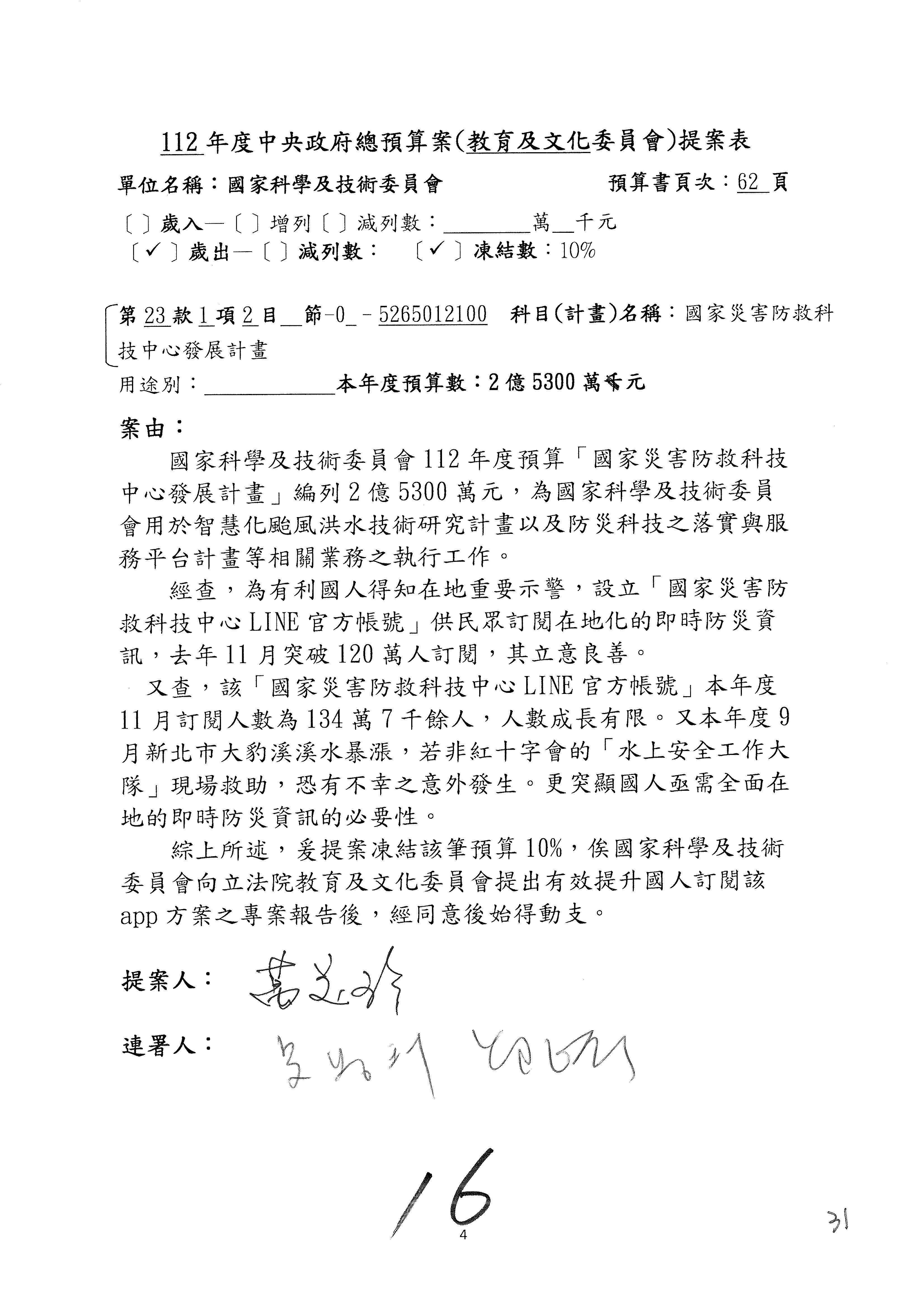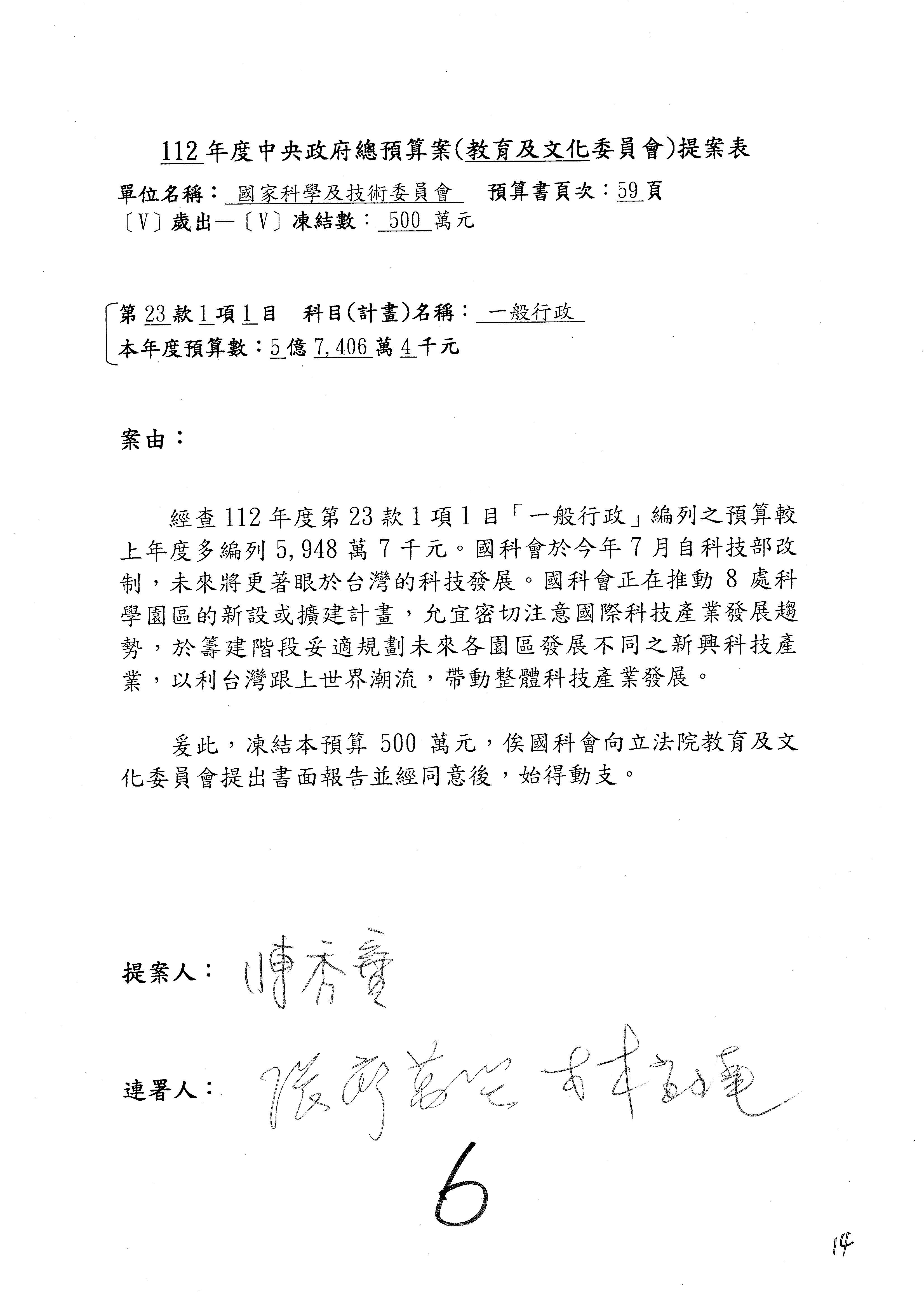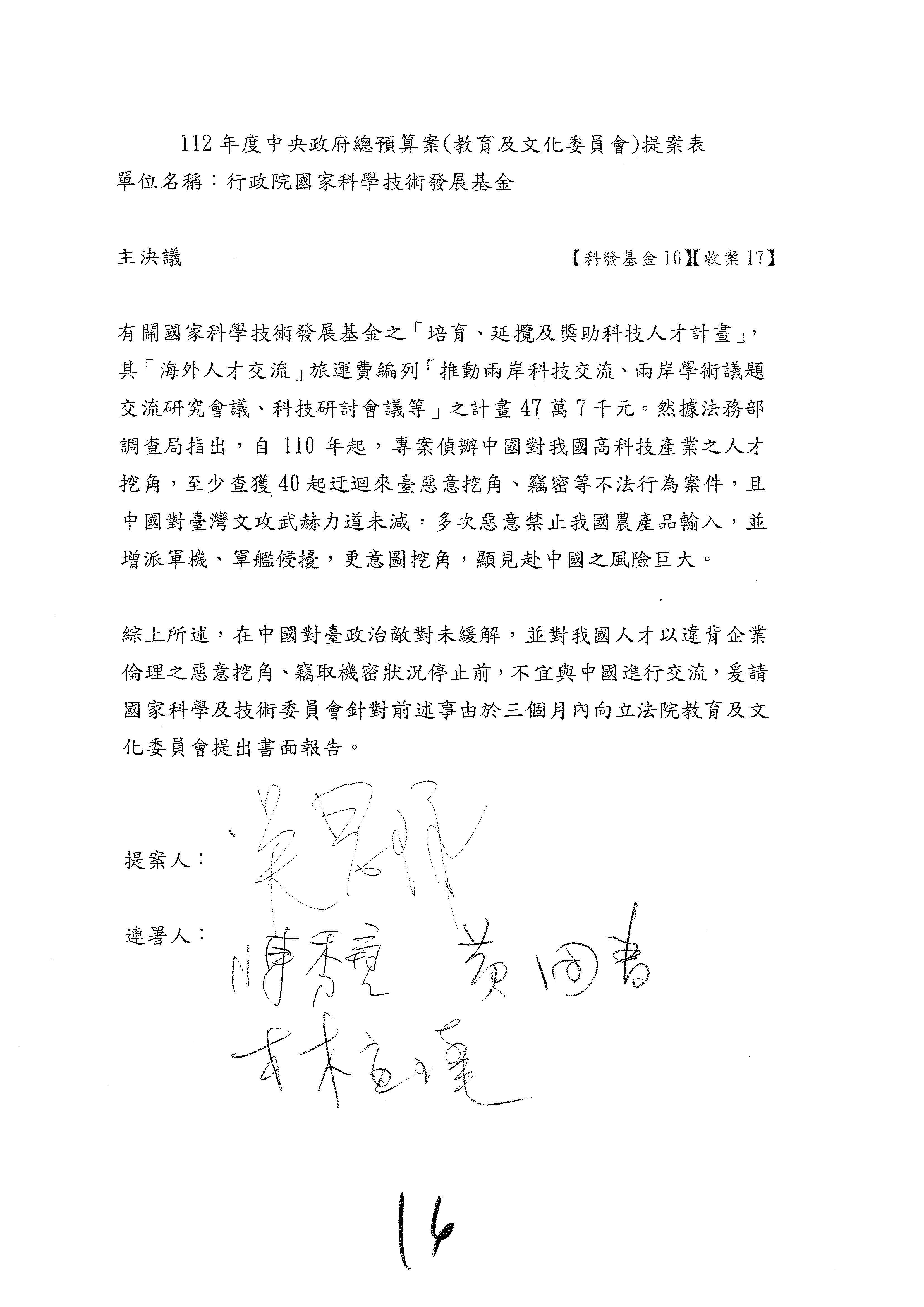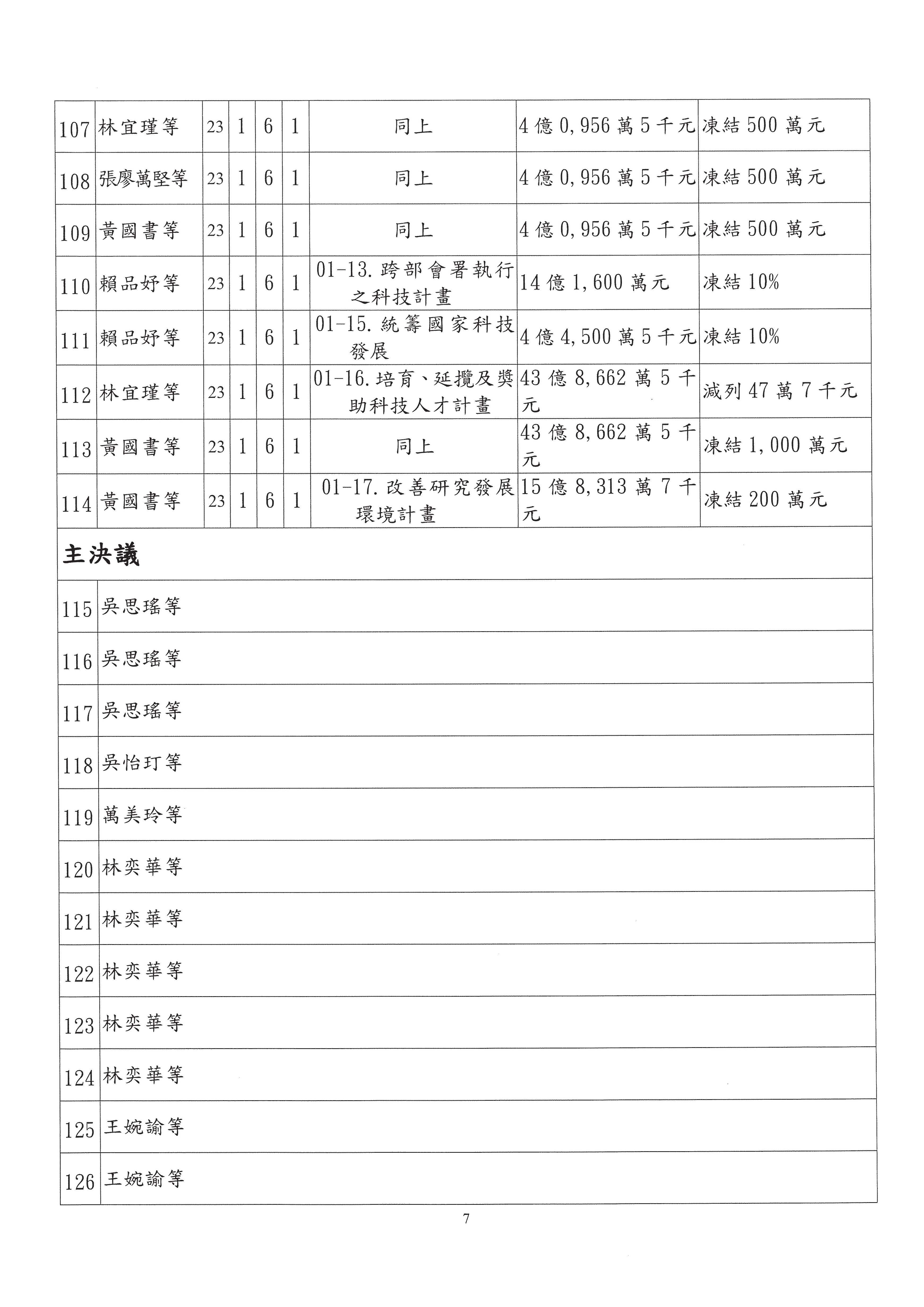 科發基金預算案:改主決議總共有第6案、第8案、第10案、第13案及第16案;第14案、第15案併為一案。