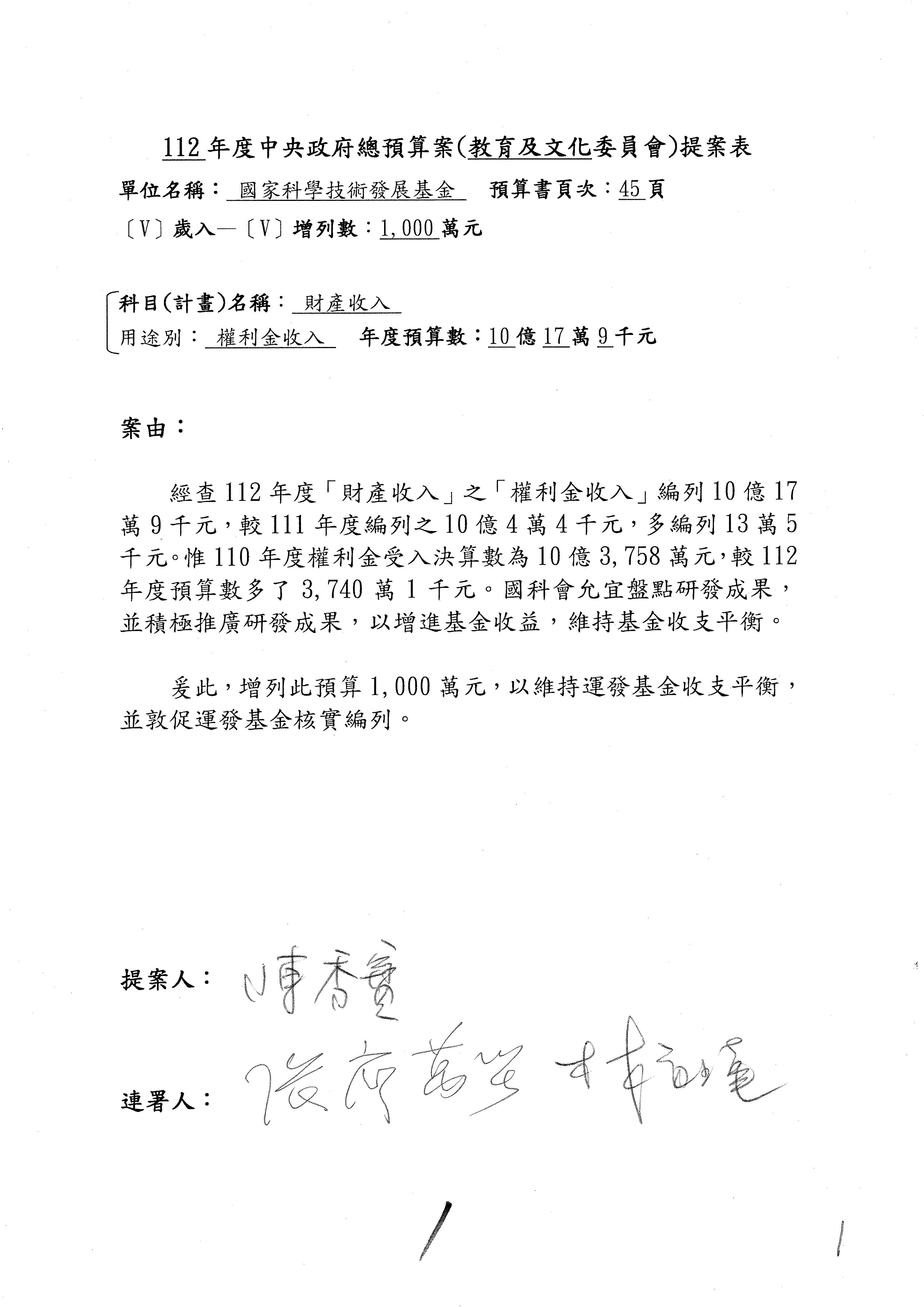 陳委員秀寳:針對基金來源,112年度財產收入中的權利金收入編列10億17萬9,000元,比111年度編列之10億4萬4,000元,多編列了13萬5,000元,但是110年度權利金收入的決算數是10億3,758萬,比112年度的預算多了3,740萬1,000元,所以針對權利金收入,既然110年度決算多了三千多萬元出來,表示權利金收入增列1,000萬元其實並不多,所以我覺得不要這麼保守,應該可以再增列,所以本席提議增列1,000萬元。