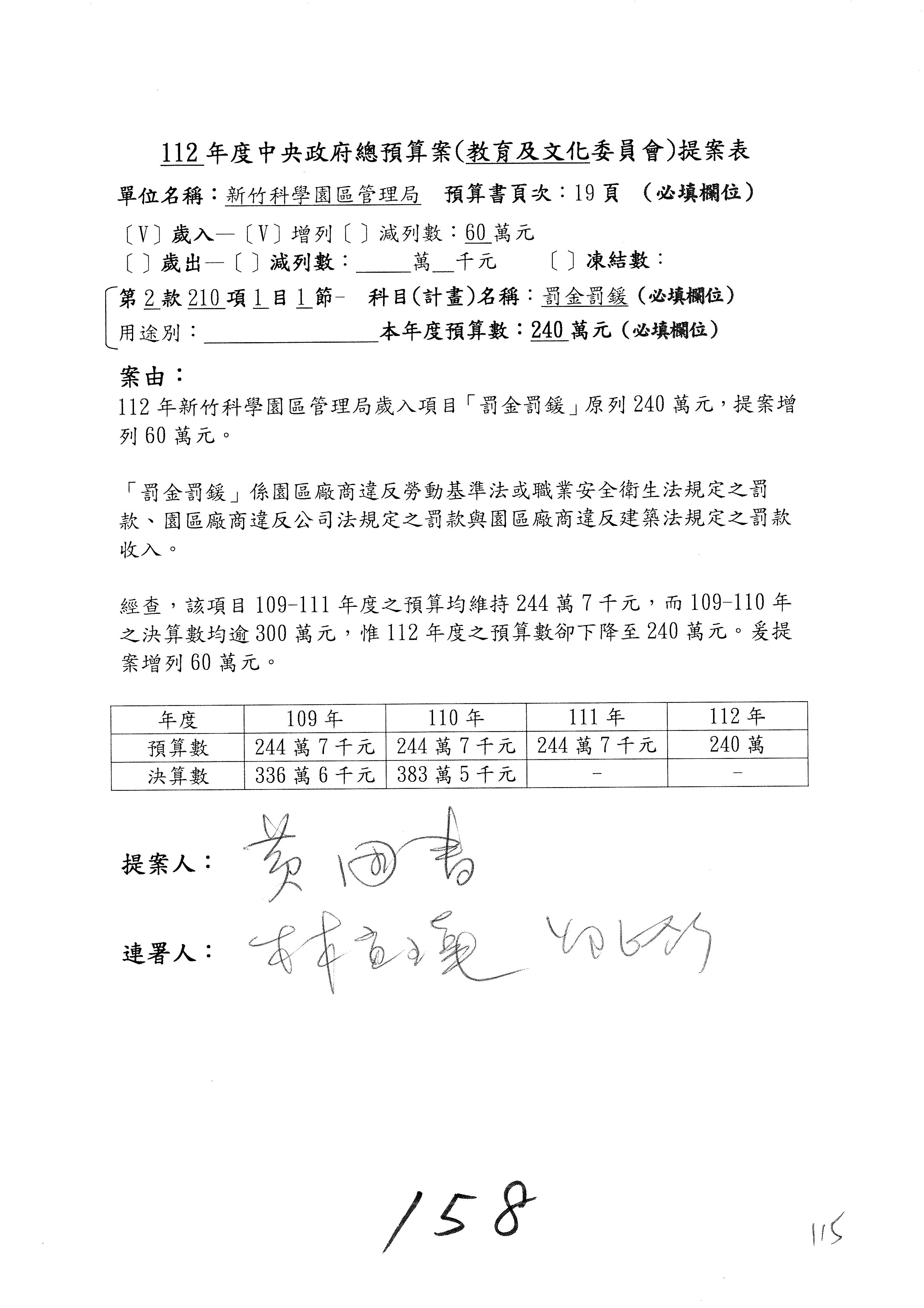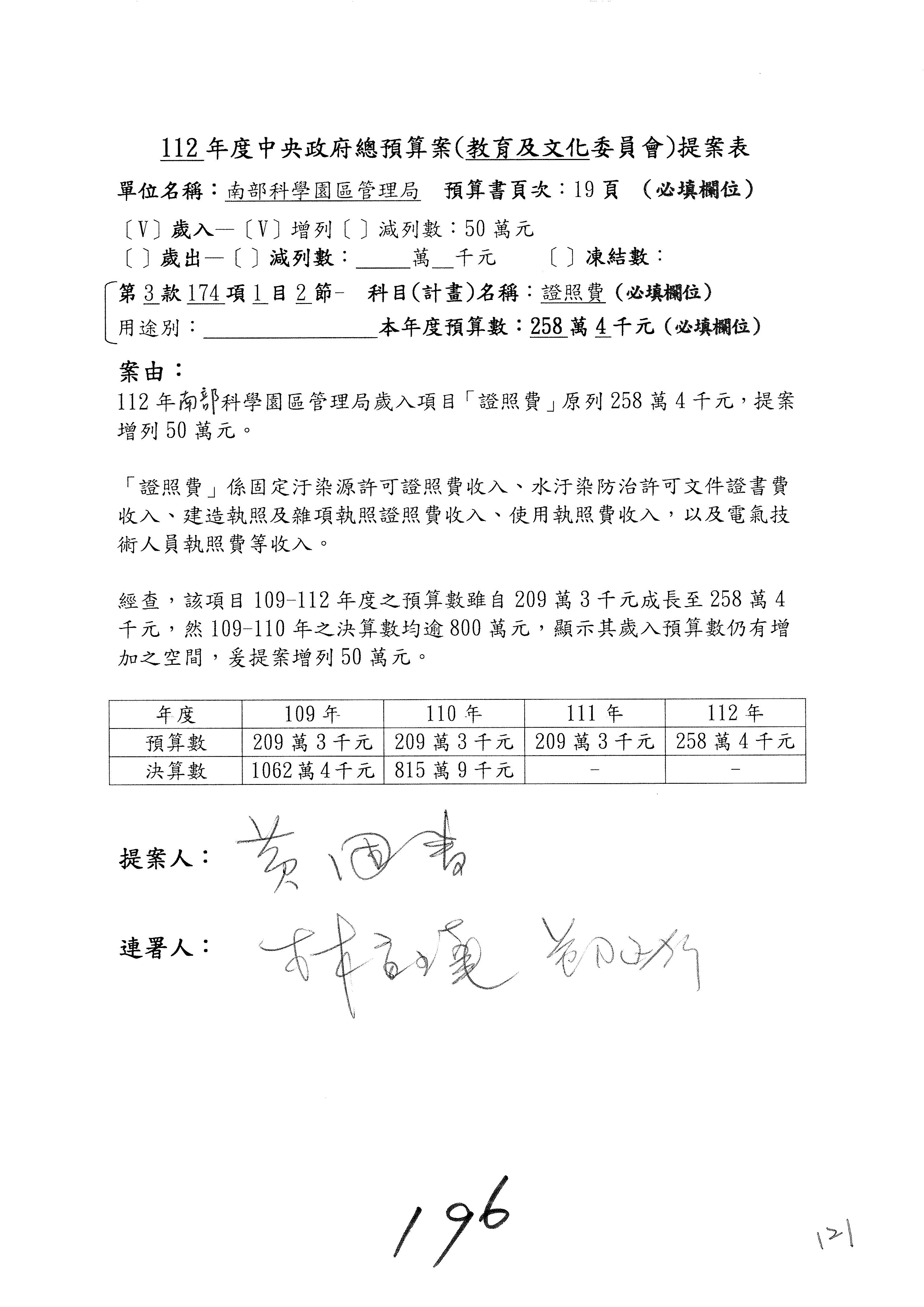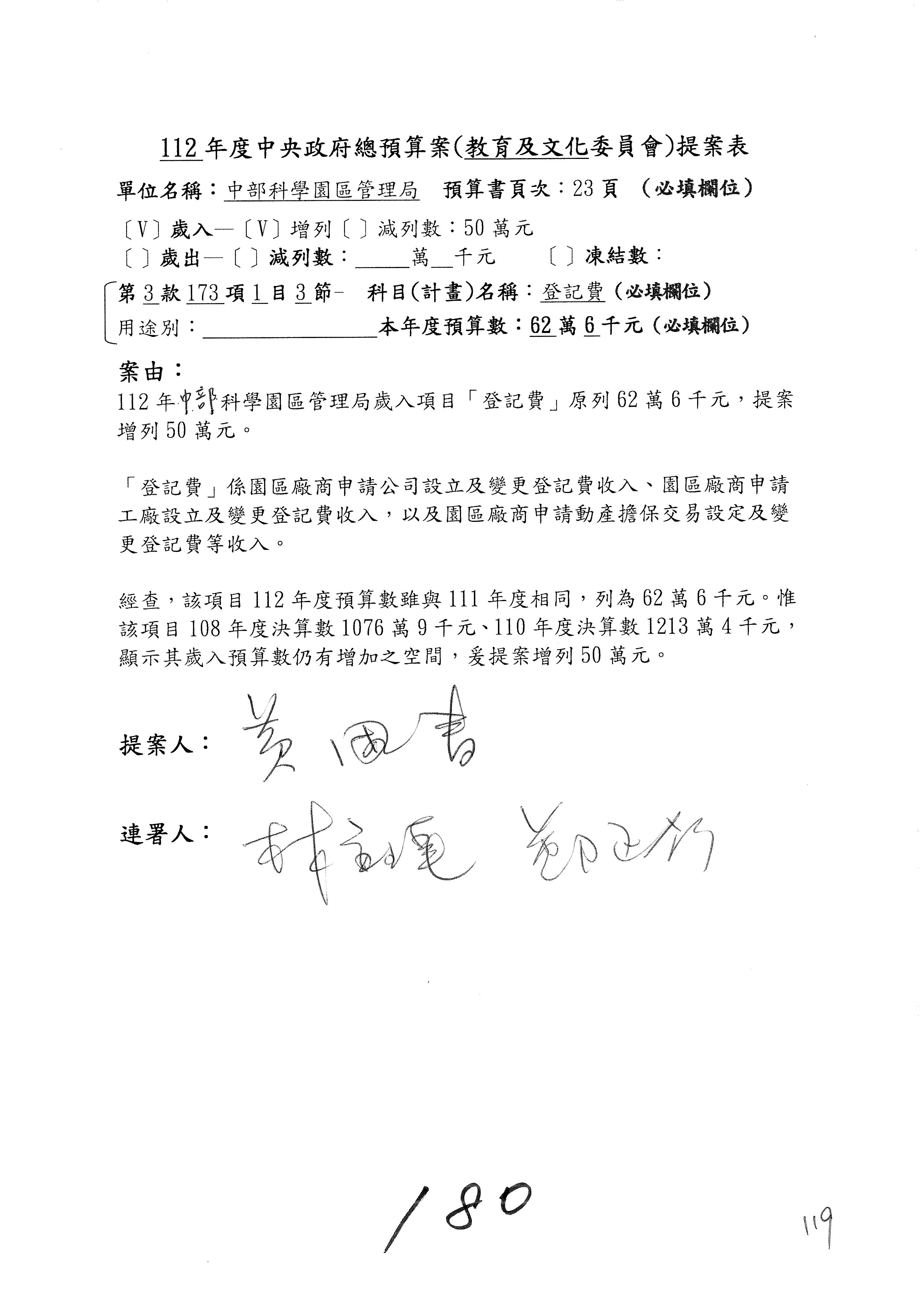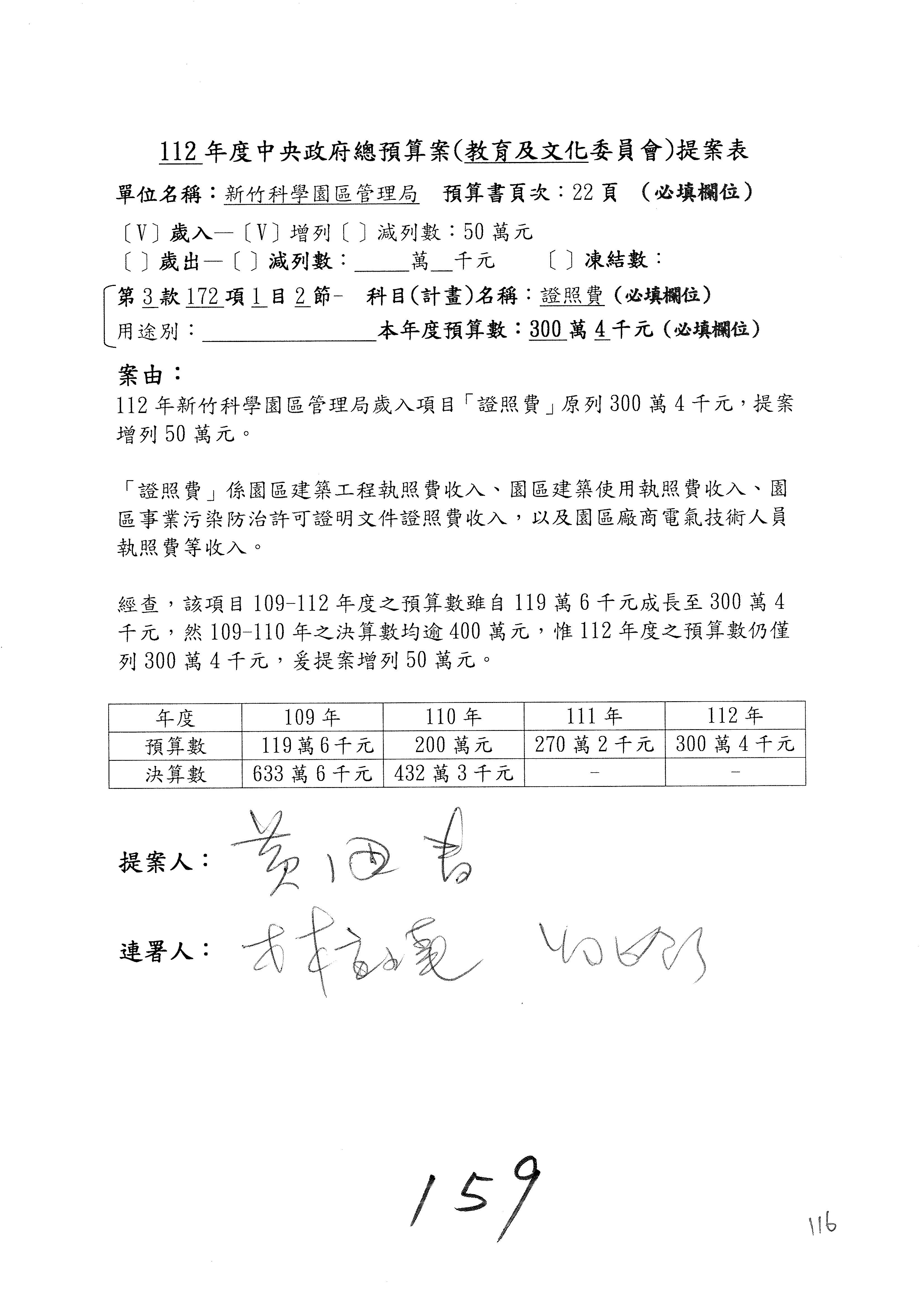 主席:好,租金及權利金收入就增列300萬元,黃國書委員也是很佛心,本來我以為吳主委覺得增列1億元也是可以的,結果你提議增列300萬元,而他就直接接受了。
