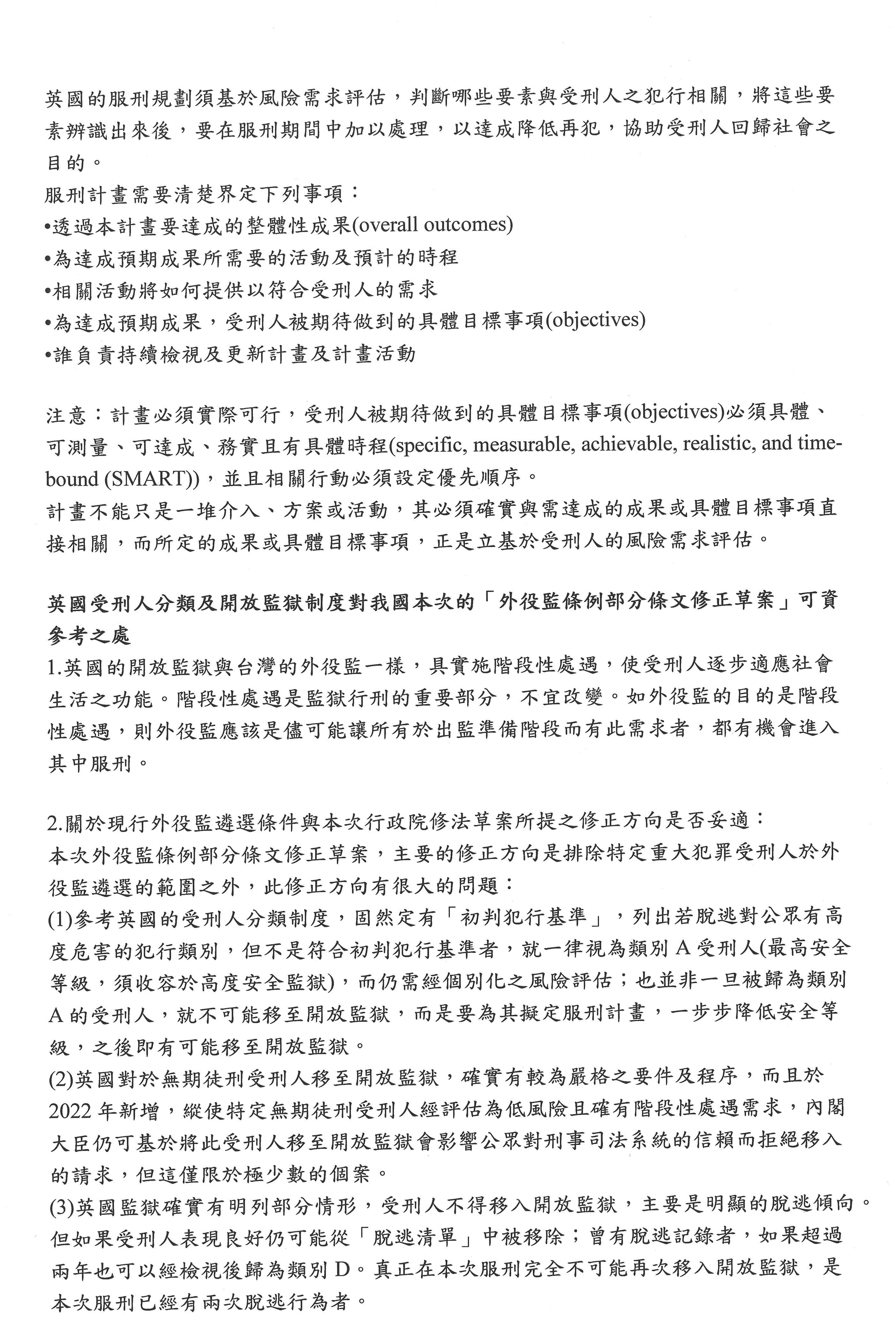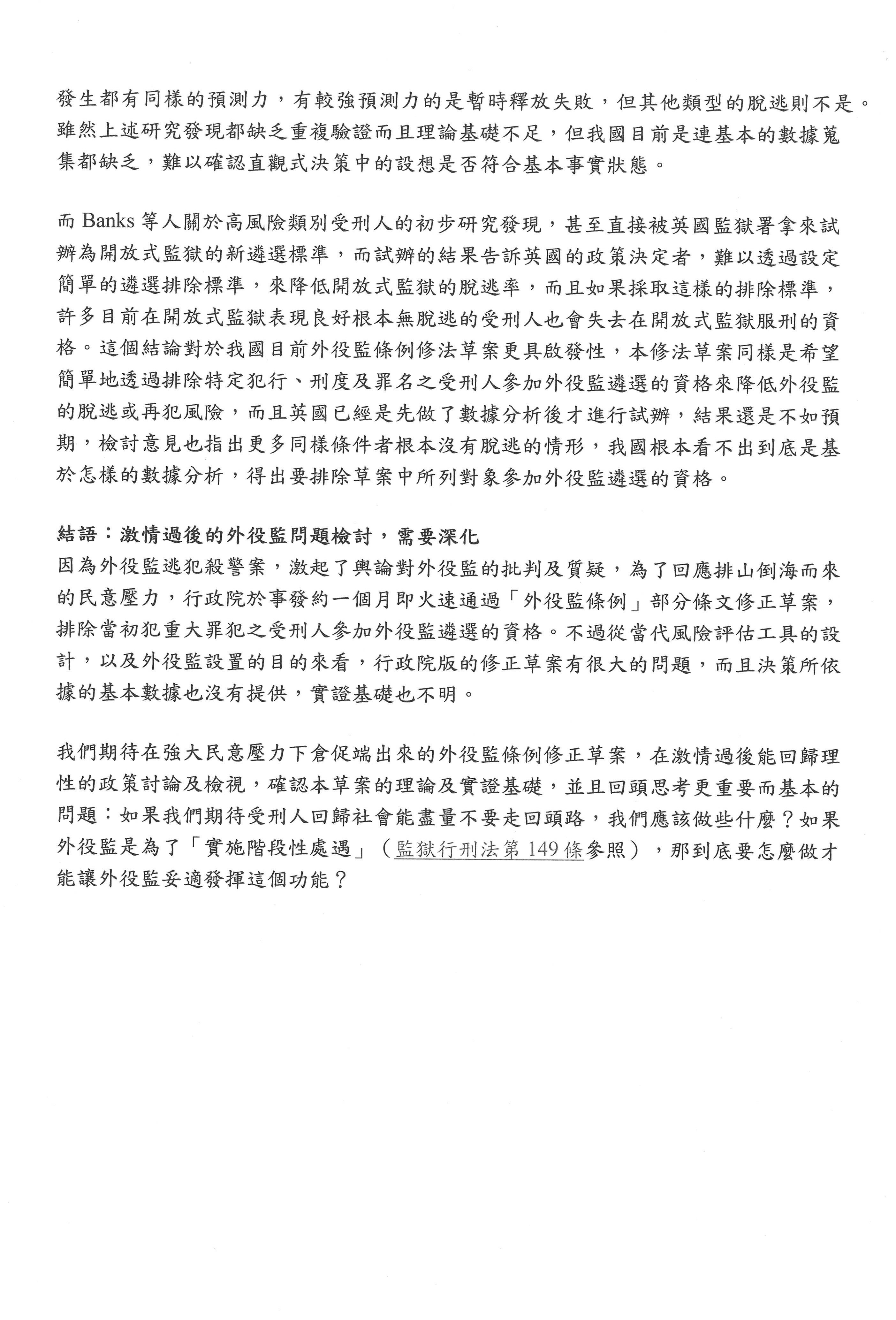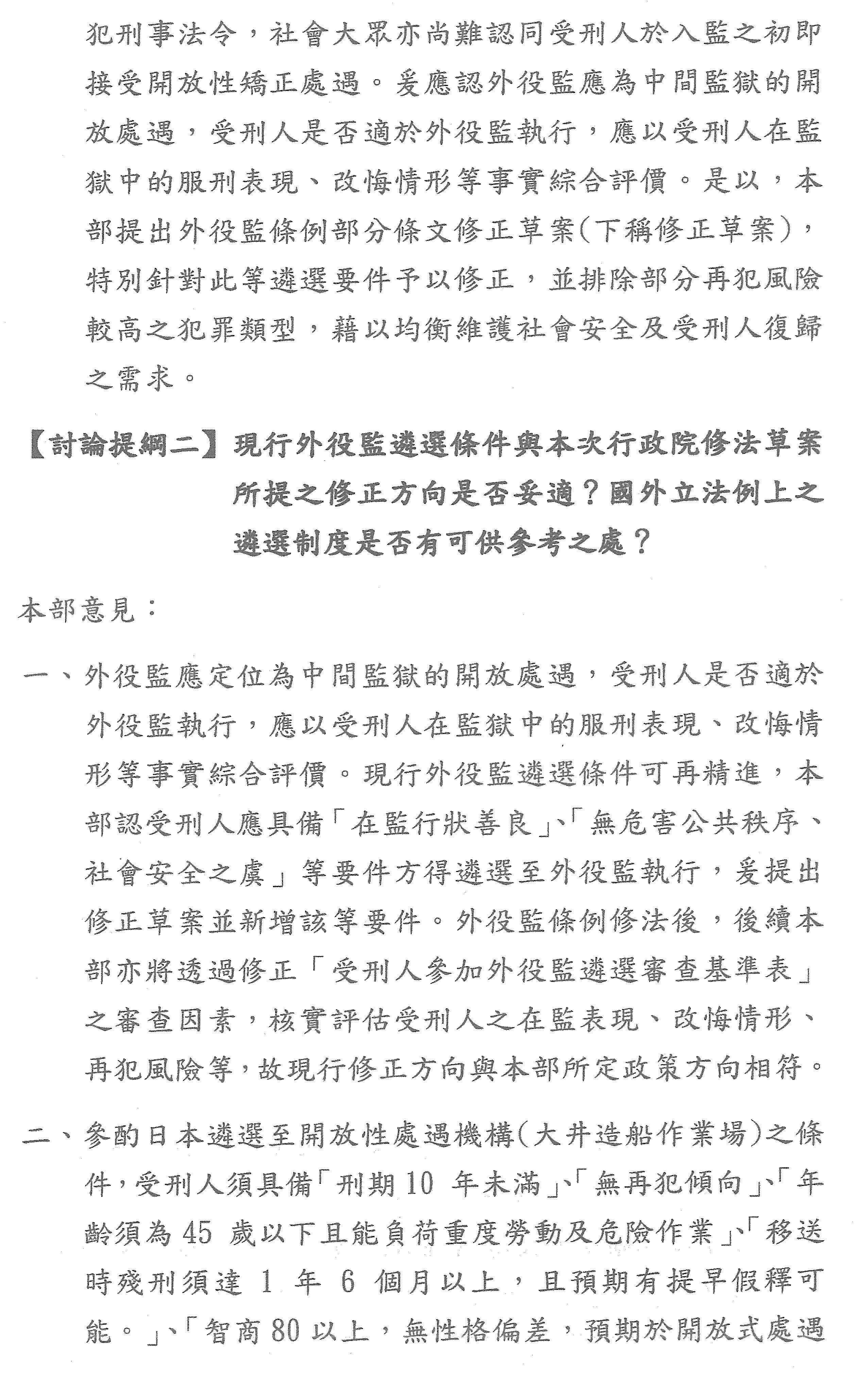 有關與我們這次草案比較相關的部分,就是我們剛剛講過,如果我們要依據前面有犯一個重大犯罪就完全排除,我覺得這是有問題的,這可以當作是一個初判的基準,但是還是要經過評估為具有高社會危害風險的,你才會說現在不能夠遴選。現在不能夠遴選,但經過處遇之後,其實還是要讓這些人有機會進到開放監獄。