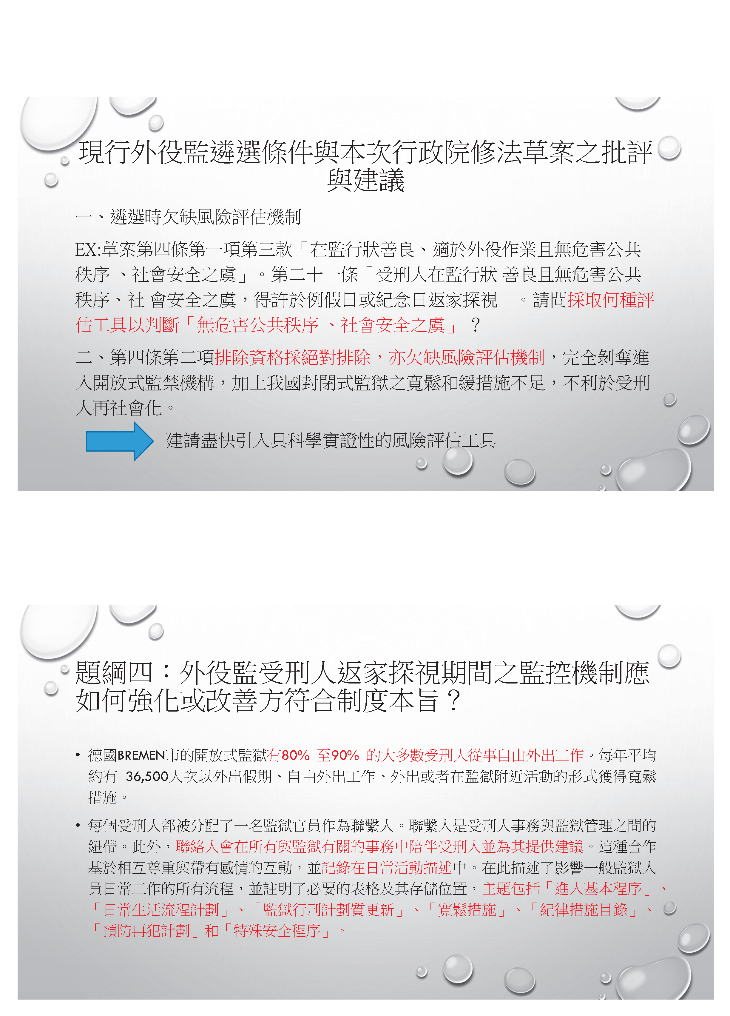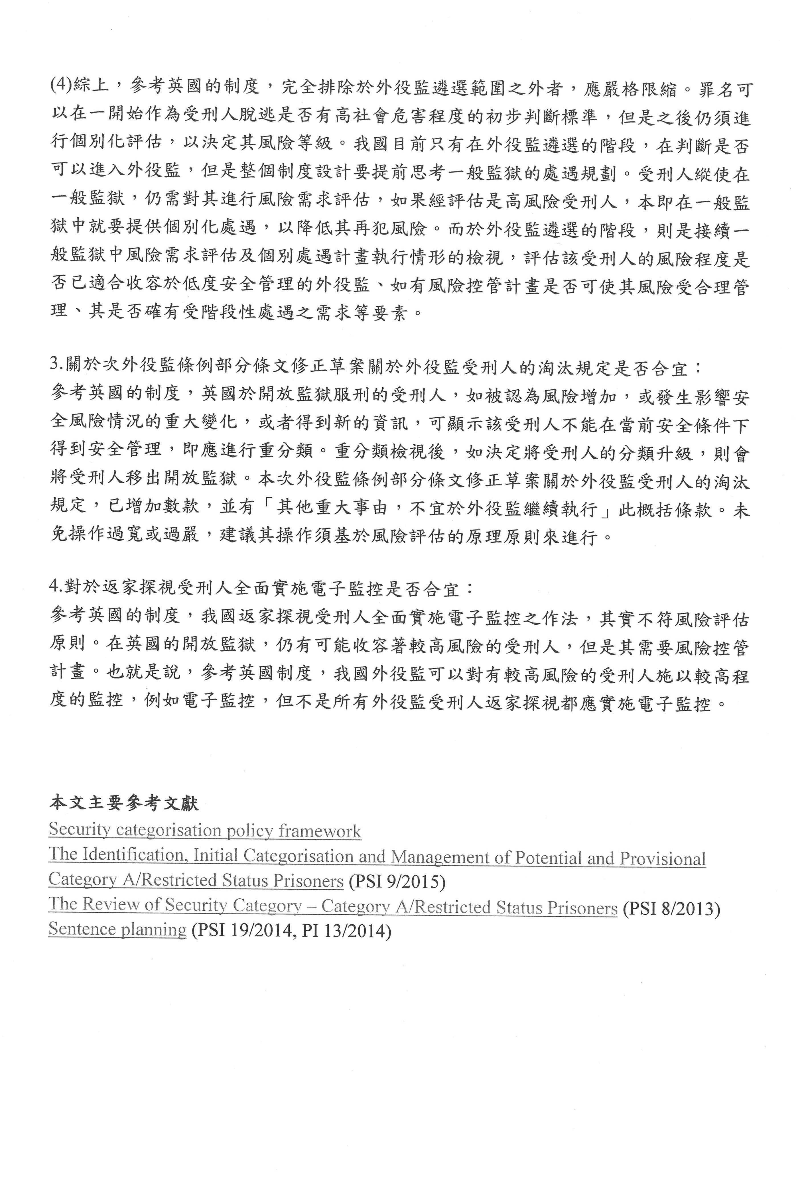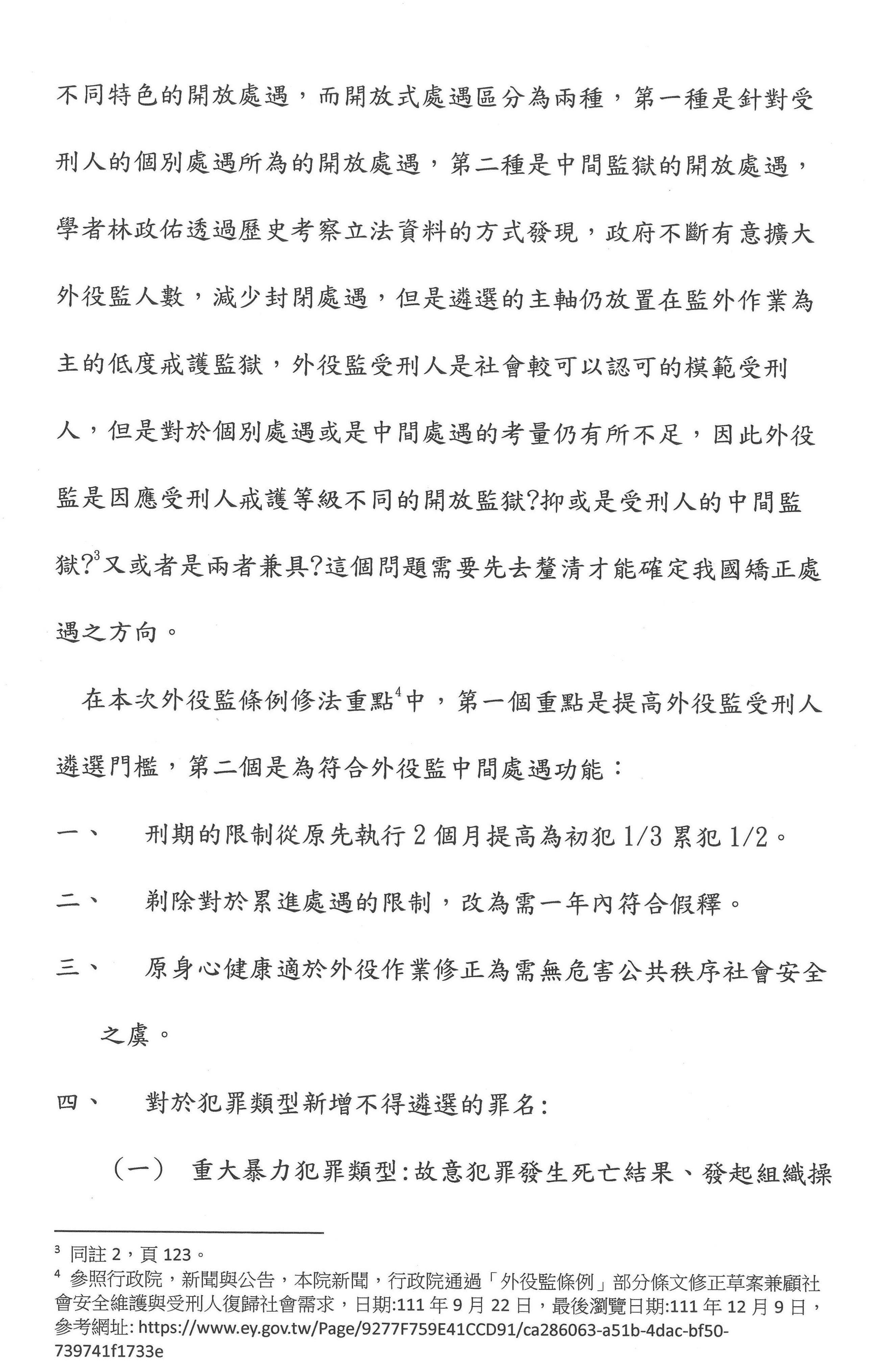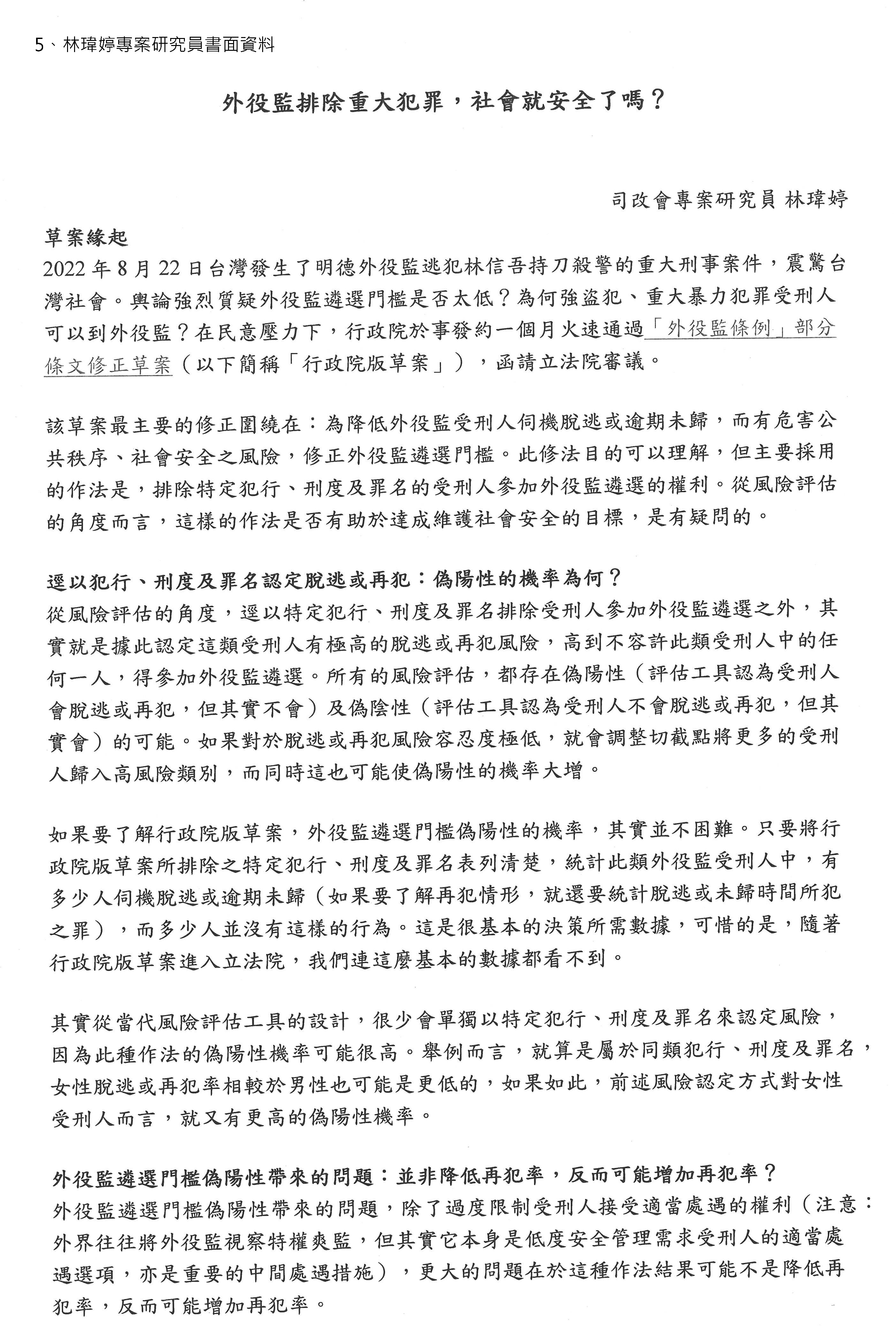 有關與我們這次草案比較相關的部分,就是我們剛剛講過,如果我們要依據前面有犯一個重大犯罪就完全排除,我覺得這是有問題的,這可以當作是一個初判的基準,但是還是要經過評估為具有高社會危害風險的,你才會說現在不能夠遴選。現在不能夠遴選,但經過處遇之後,其實還是要讓這些人有機會進到開放監獄。