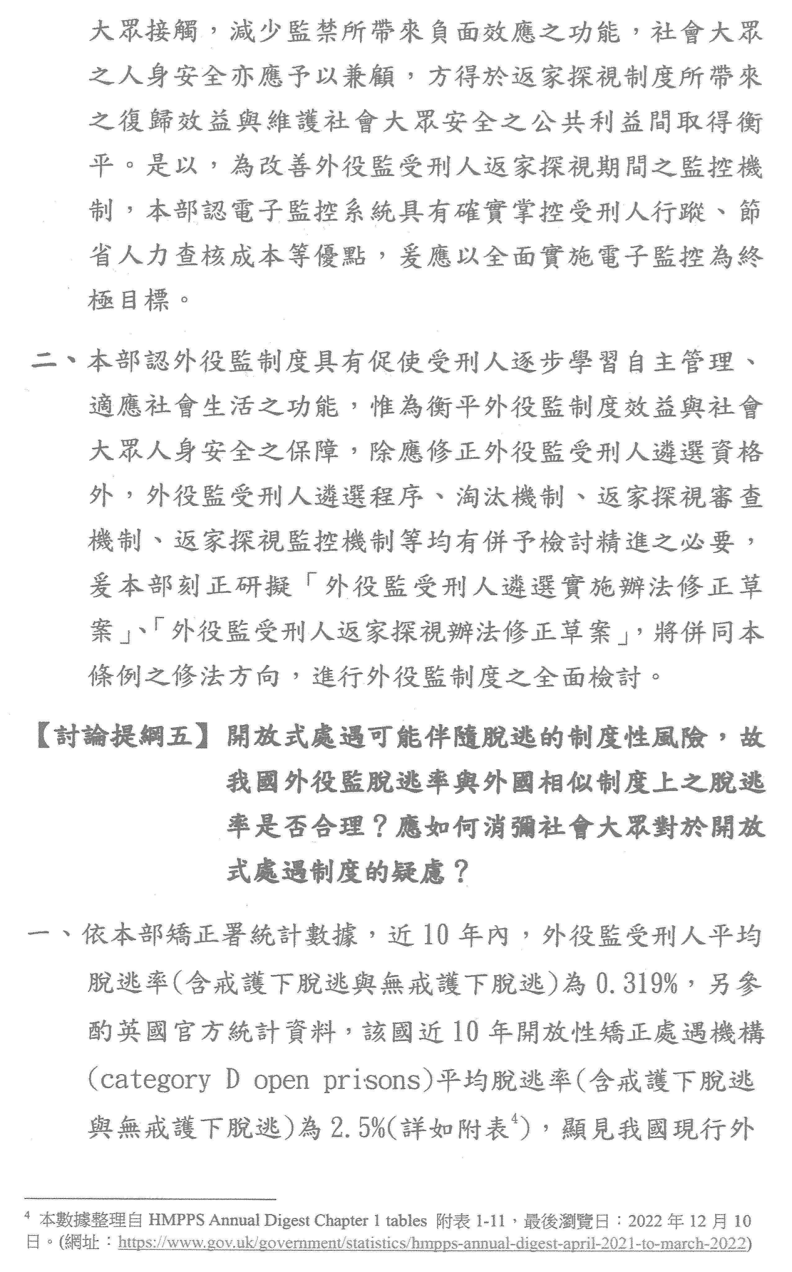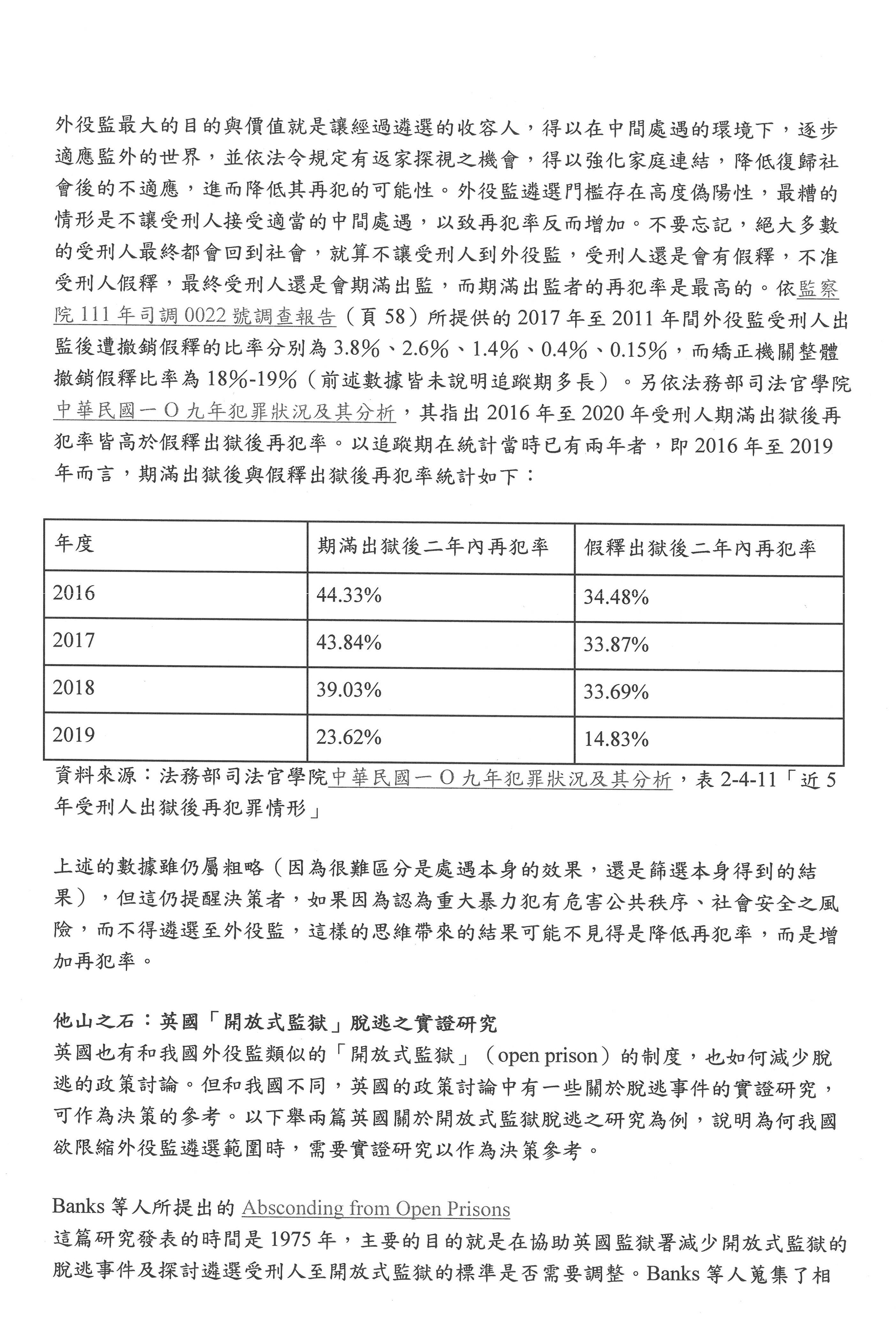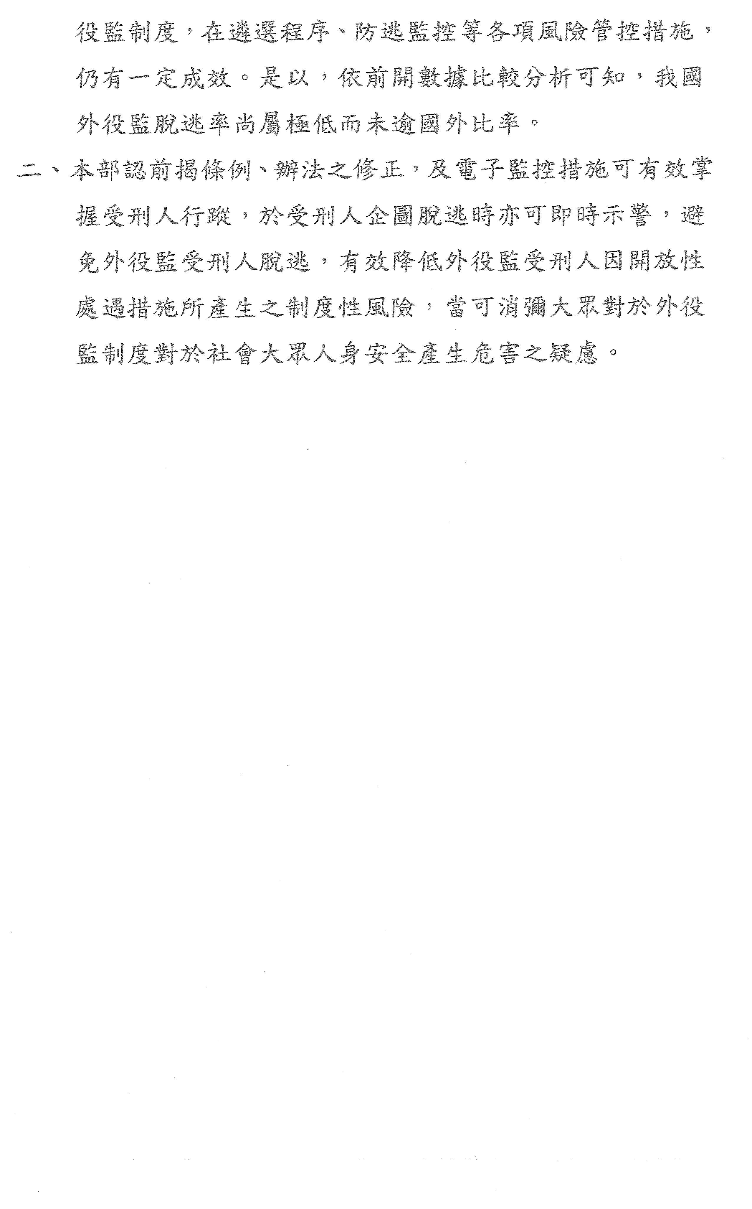 另外,風險對於處遇,當然有各種不同的,事實上外役監的脫逃,我們的報告裡面提到近10年來大概是0.319%,英國、日本的外役監脫逃比率比臺灣高,這一部分我們當然不以此為滿足,當然要以零脫逃為目標,所以我們現在要以鼓勵替代嚴格的管理,希望能透過修法,讓我們的外役監制度能夠更加的妥善,以上報告,敬請指教。