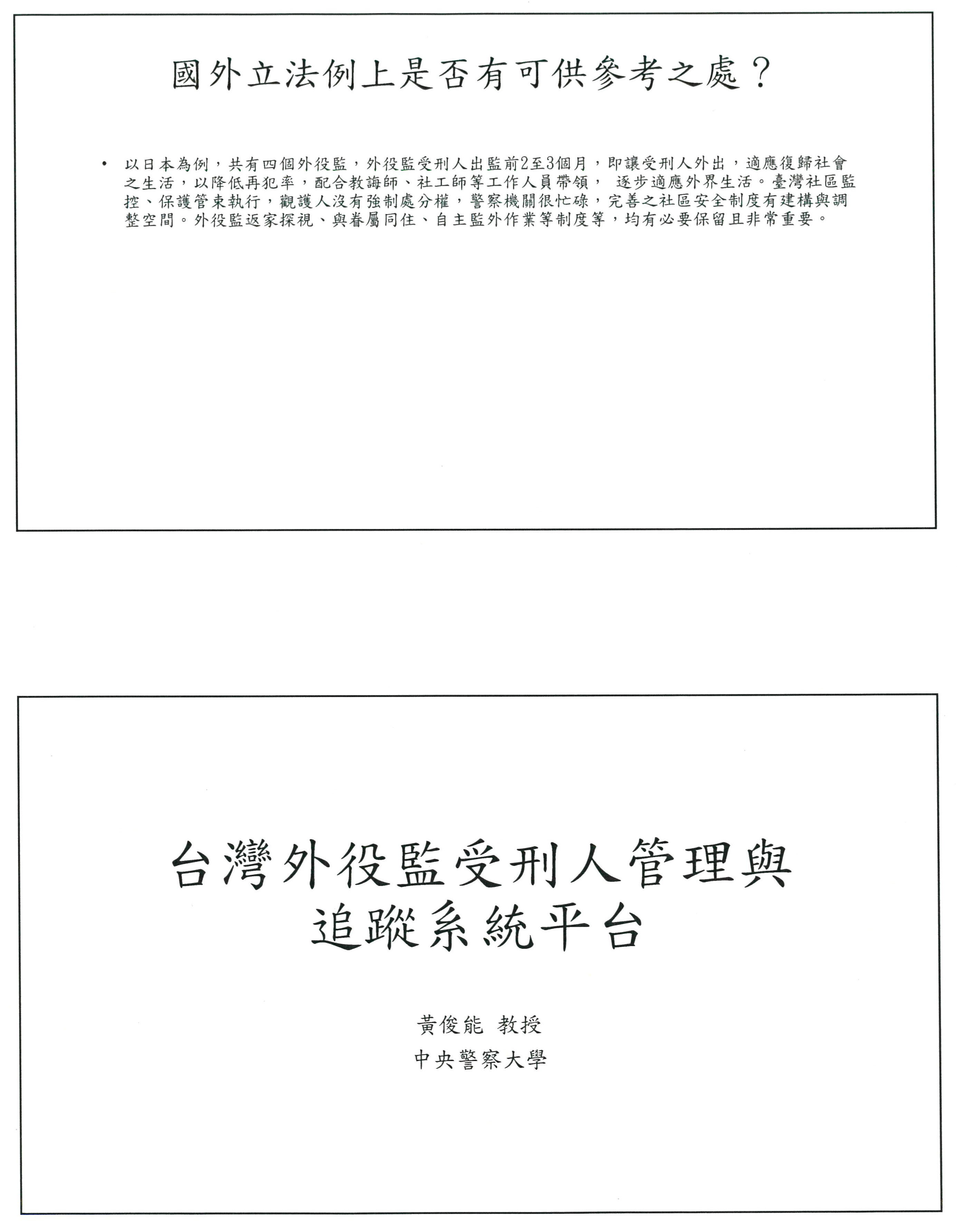 其次是加強有關機關的協力,前面幾位先進都已提到,我這邊就不再贅述,亦即透過多機關的協力以掌握受刑人的狀況。我覺得對於掌握外出受刑人的狀況,這個有其必要。