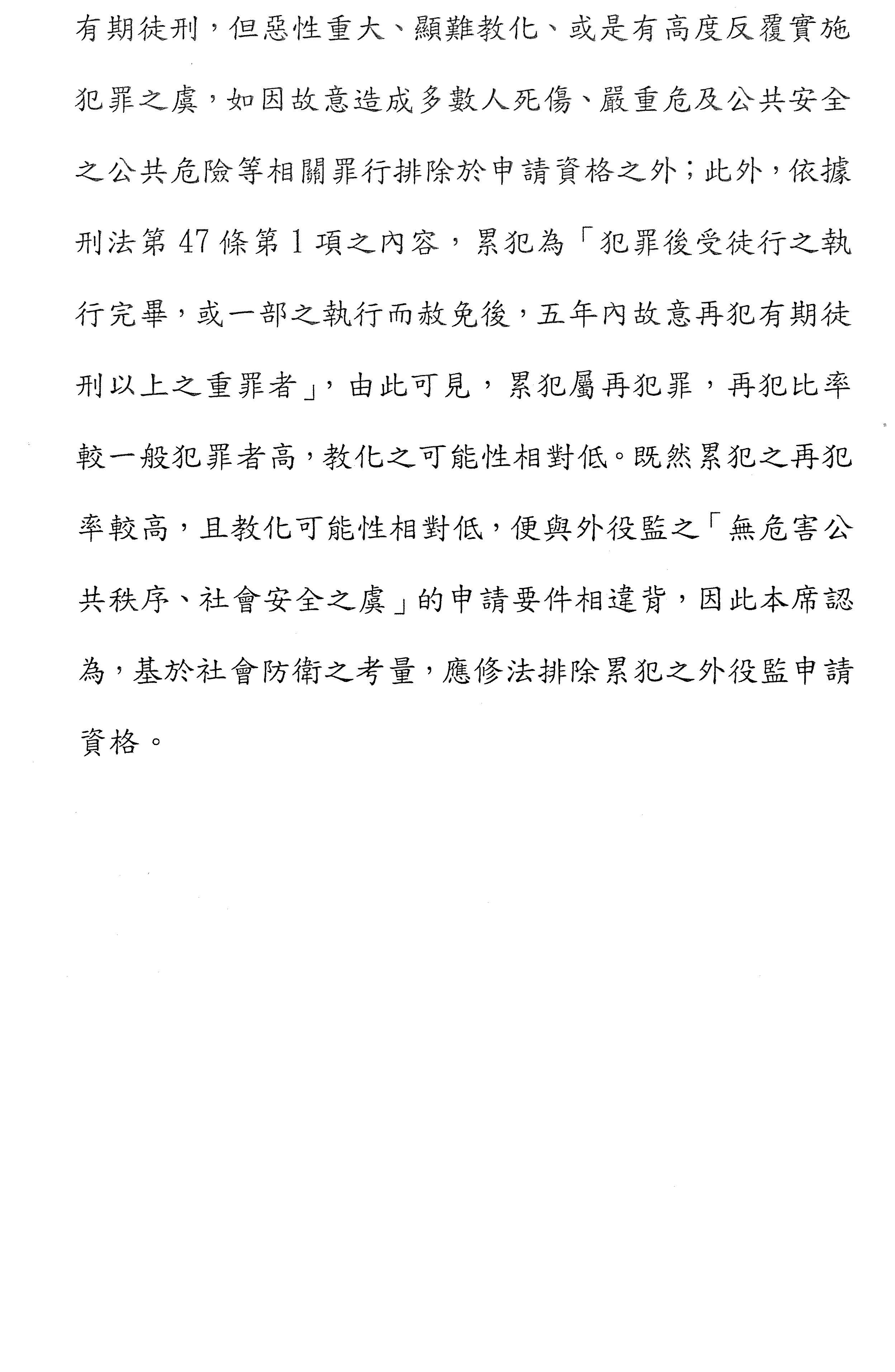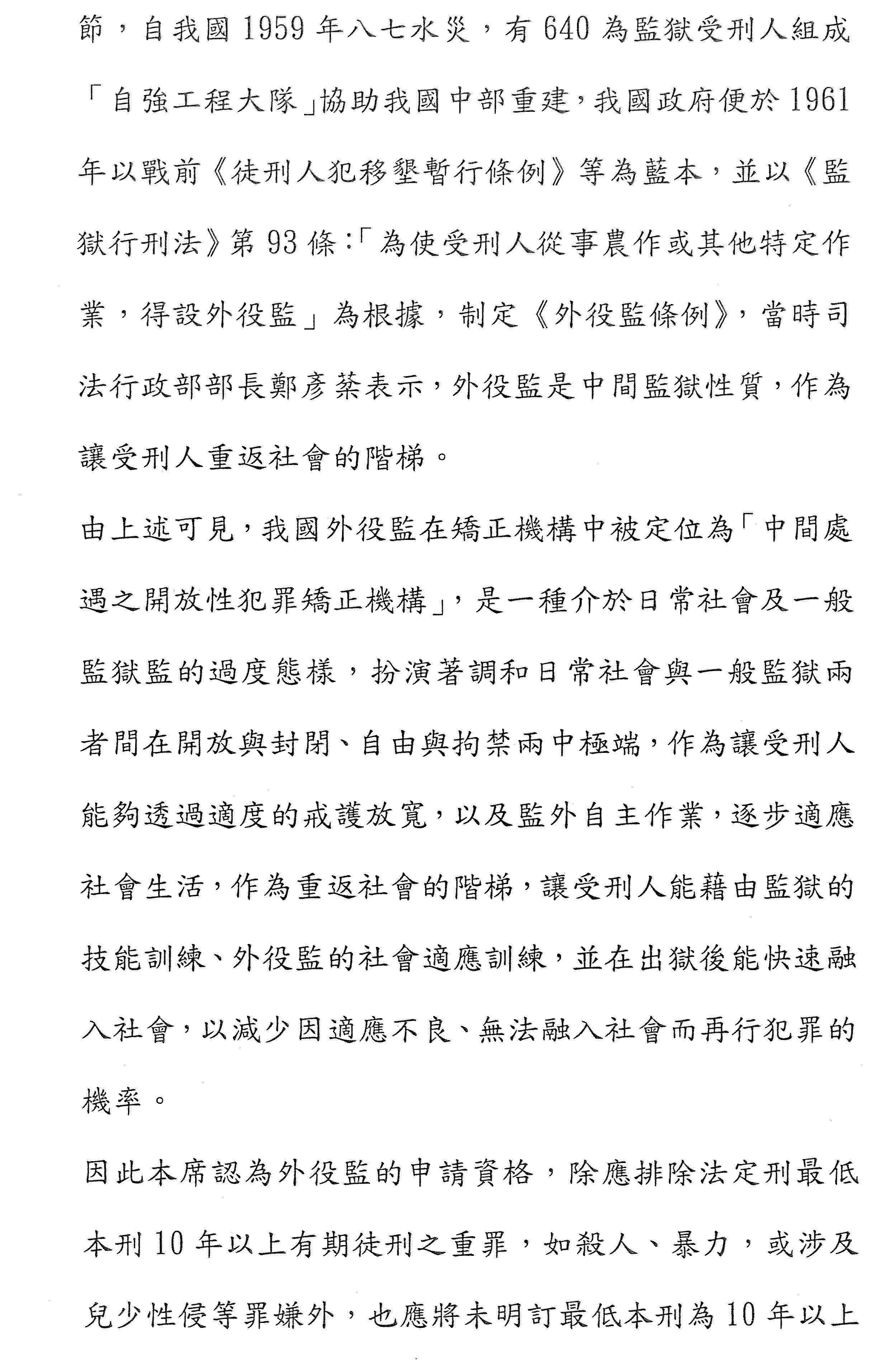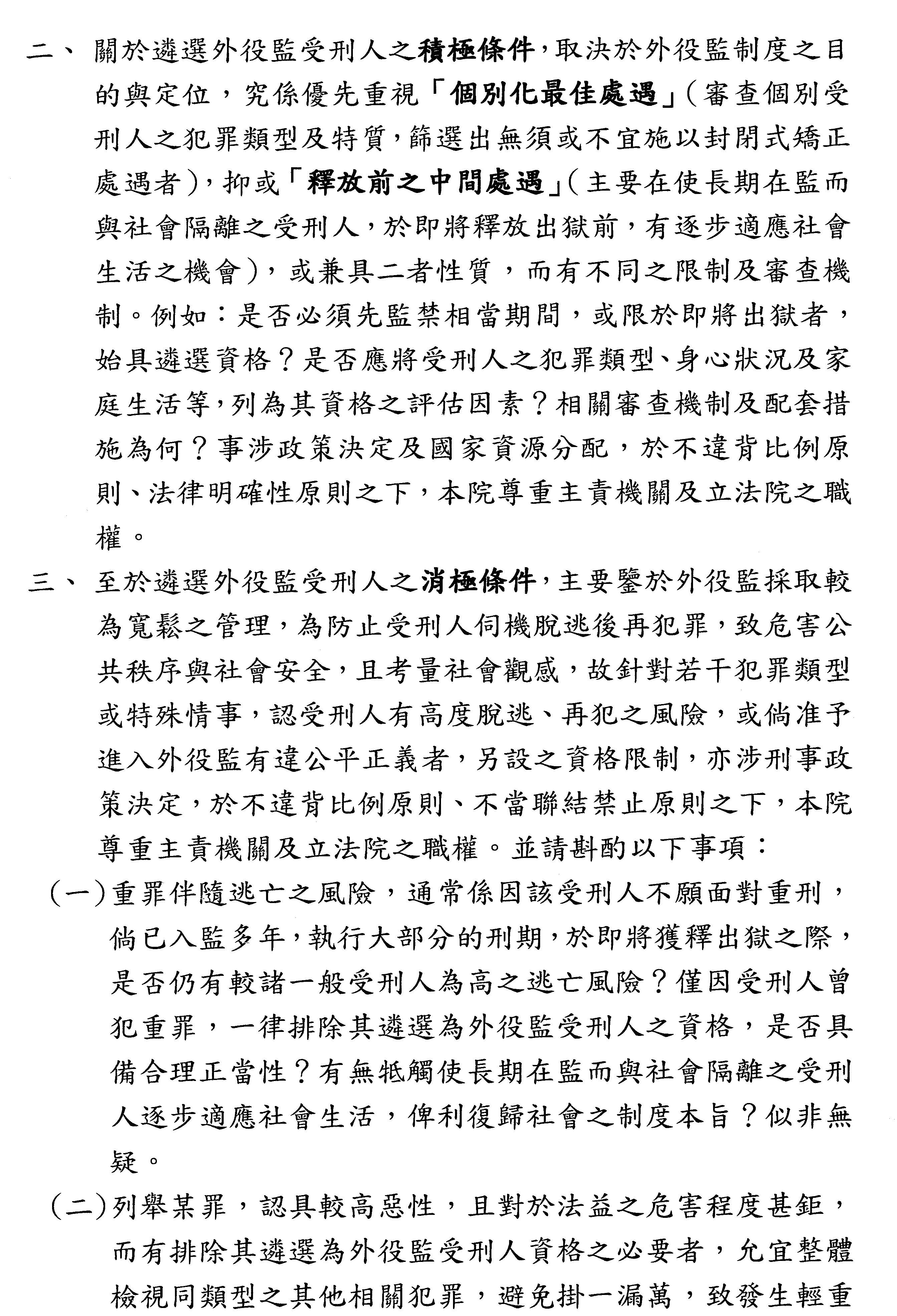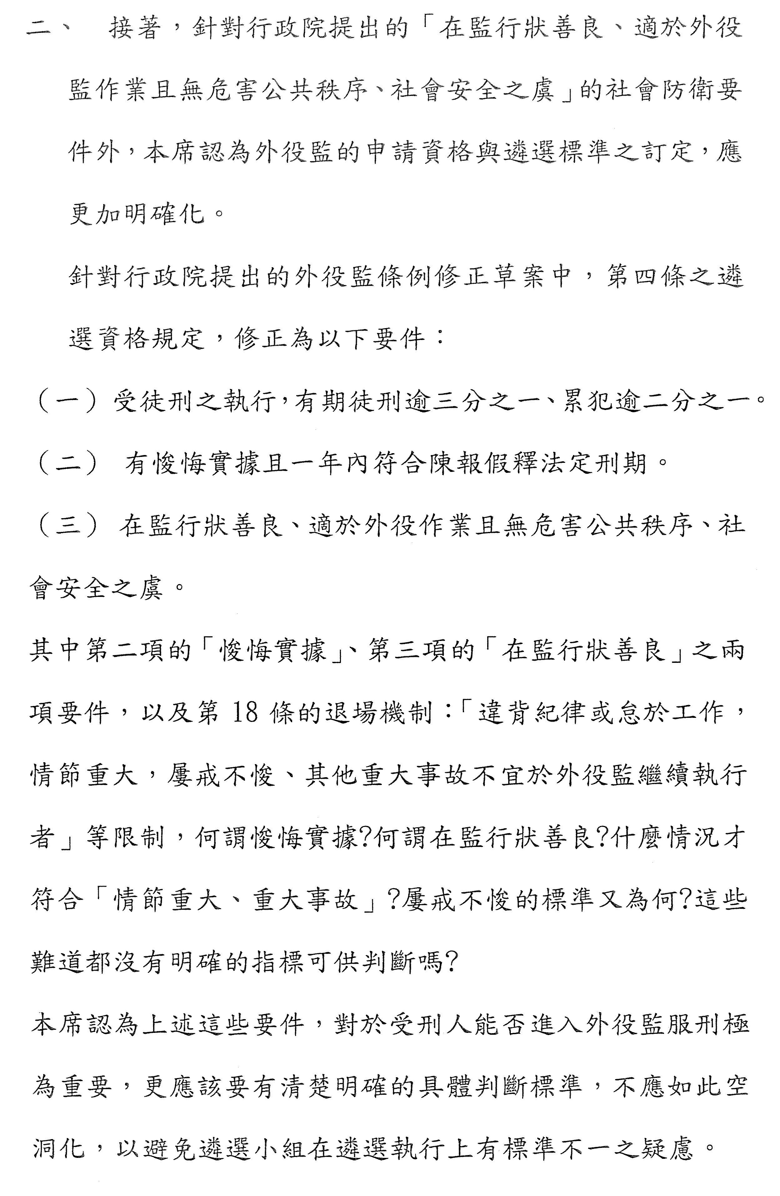 另外是關於第四條外役監的消極排除條件,它和外役監本身性質之間的正當連結到底是什麼,這部分也沒有講清楚,我覺得這個也是關鍵。