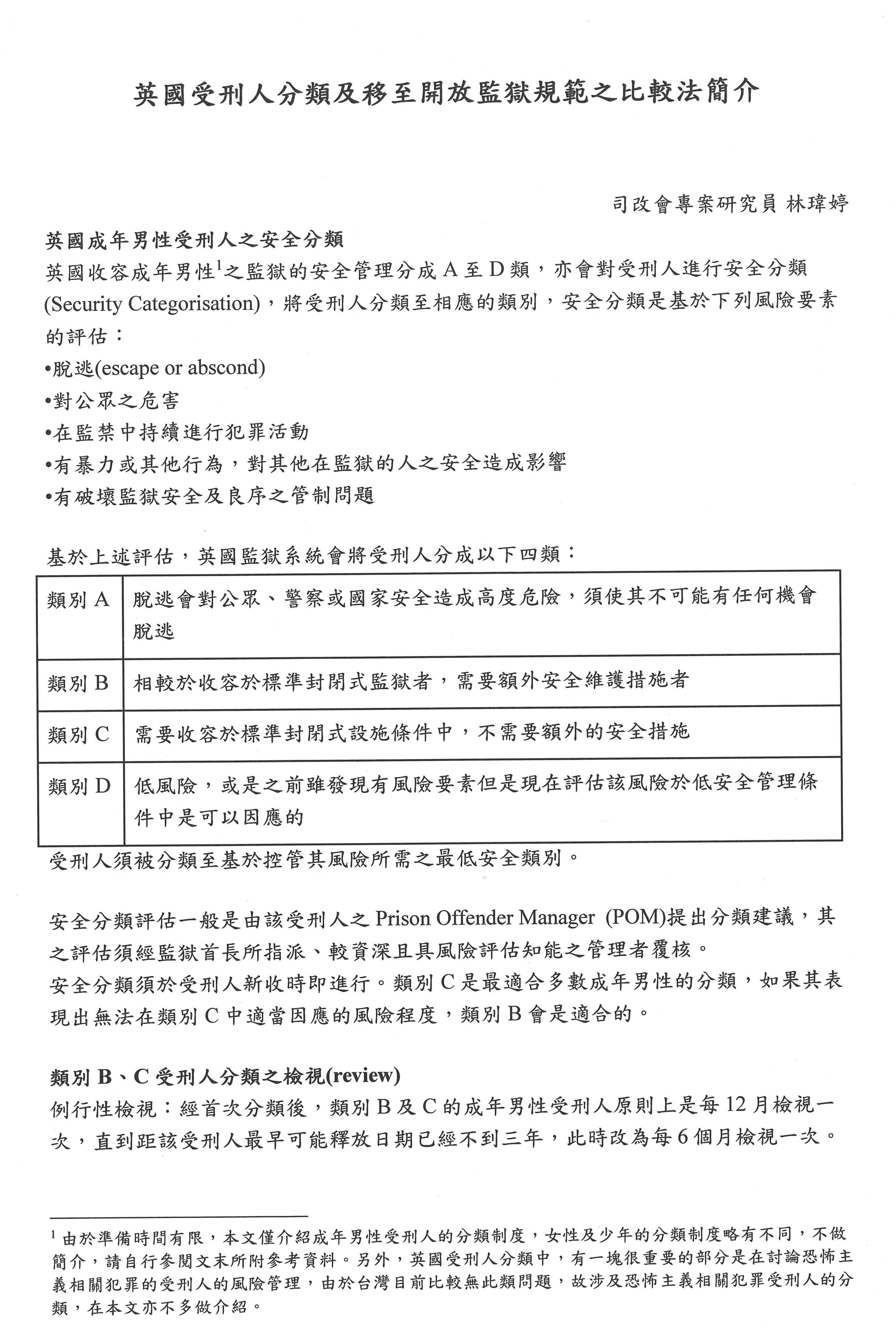 林瑋婷專案研究員:大家好!我今天主要報告的是英國受刑人分類及開放監獄的制度比較,因為這次公聽會主要提綱是希望我們找比較法,所以我找了英國的部分,提供大家參考。