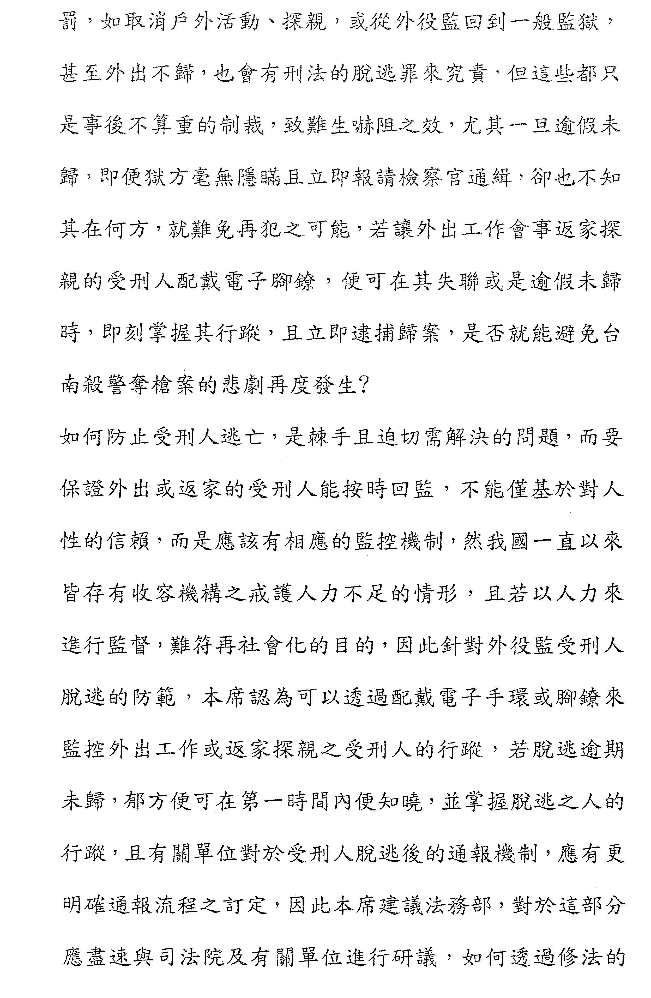 另外,第二十一條第三項規定,得以請假返家探視的部分,本意為了是使受刑人可以接觸外界來提高復歸社會的機率,但是善意的制度卻遭惡意的受刑人利用,趁機脫逃,考量惡意逃脫者有其特別惡性及自制力薄弱,且事後過度浪費社會資源,犯罪情節重大,對其逃脫的罪名加重刑期的二分之一,以增加嚇阻力。本次修正,本席認為應該要有效杜絕類似的逃脫殺警案件再次發生,以提升社會治安的穩定性,完善我國的社會安全網,才符合國人的期待,敬請大家給予支持,謝謝。
