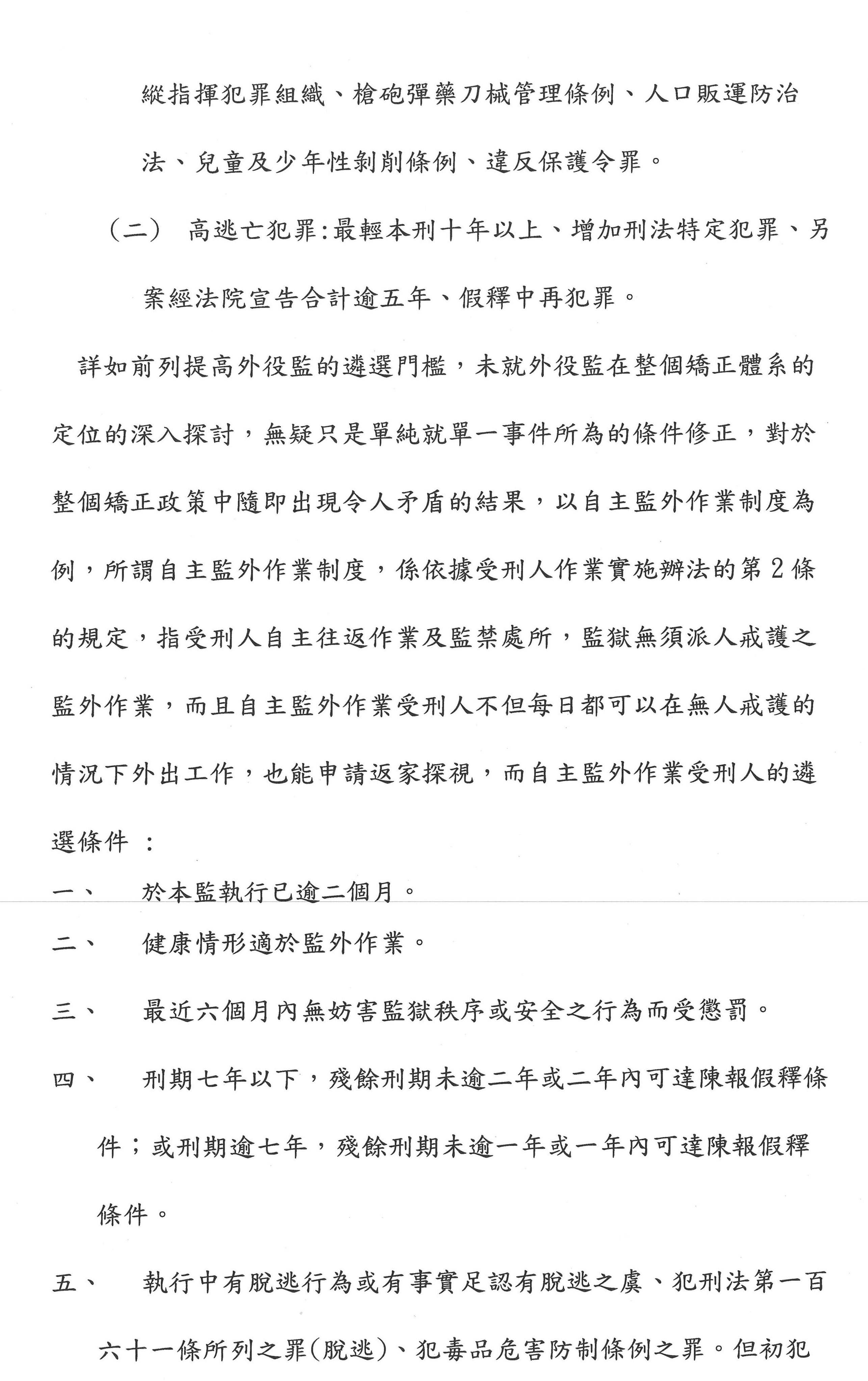 其實我們所想的是,重大暴力犯罪之外又加上本刑10年以上的條件,我認為是有點疊床架屋,因為你已經把性侵害、家暴、毒品罪,還有重大暴力犯罪都排除,你再加一個10年的條件,等於讓長刑期的人在監獄裡面根本沒有機會。服10年以上長刑期的受刑人最重要的問題,就是面對孤獨、死亡還有重大疾病;他根本沒有被放出來的機會,甚至有輕生的念頭的時候,可能產生很多戒護事故。如果你以這樣的高標來看的話,這樣設計其實已經有影響長刑期受刑人人性尊嚴的可能性。剛才提到外役監其實已經增加外部遴選委員,我們不要把這些條文定得那麼多、那麼死。我贊成排除重大暴力犯罪─性剝削、組織犯罪、兒童的、人口販運的,OK,但是對於增加10年以上的條件,我們再斟酌一下,我認為這樣可以結合防衛社會以及社會復歸的可能性。法務部署裡面儘量做這樣的安排,但是我們如果疊床架屋,把這麼多類型、刑期都加進來的話,其實你是讓一些長刑期的人放棄可以復歸社會的一絲希望。我不希望有一個單一的非典型事件造成修法越趨嚴格,走向零容忍,甚至是沒有教育或處遇的可能性,讓受刑人看不到希望,這也是負面的。