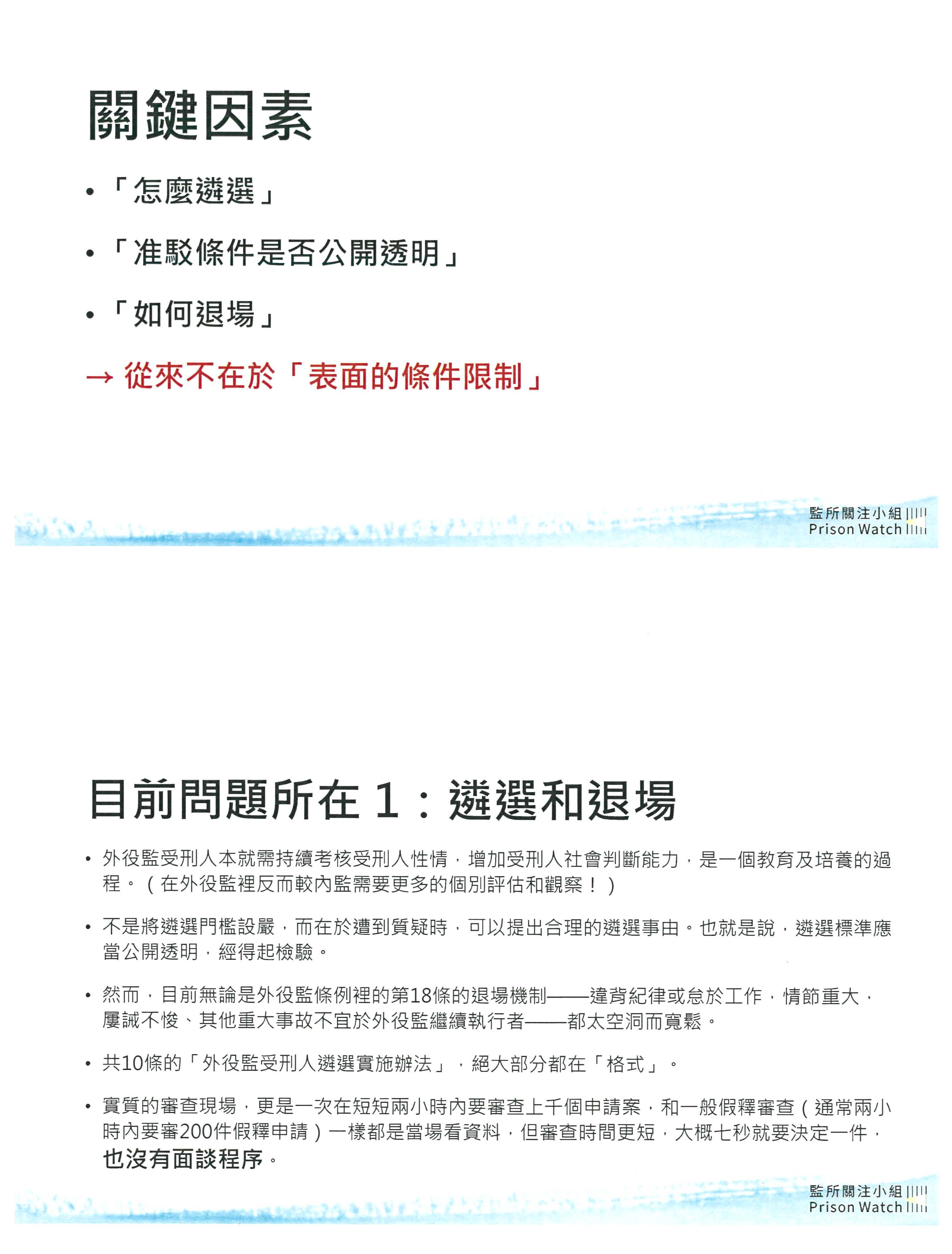 現在我們已經有監外自主作業,其實我覺得還比外役監來得實際,因為再怎麼樣,你都是在同樣一個監獄的環境裡面,然後外出工作,這比另外設置一個外役監,做這些農作實際得多。再來,我們看到實質要件裡面,我們會說要評估他的在監表現,無危害公共秩序、社會安全之虞,你在監獄裡面機構化的管理,其實每一個人都配合啊!他只要不在監獄裡面做違規的行為,大家都符合,這樣到底你遴選的要件要怎麼去評估?各個監獄的管教人員、教誨師,每天都淹沒在龐雜的行政事務上面,如果說以現在其他的比如說心理師或者社工,這樣薄弱的人力,你真的有辦法做到好的評估嗎?我覺得大家都是存疑的。這樣還不如以他的家庭支持做為首要的評估重點,比如說他跟家人的聯絡,還有接見的時候跟家人的互動來看,因為大家都知道家人不離不棄才是收容人可以安心服刑進而改變的一個「心錨」。