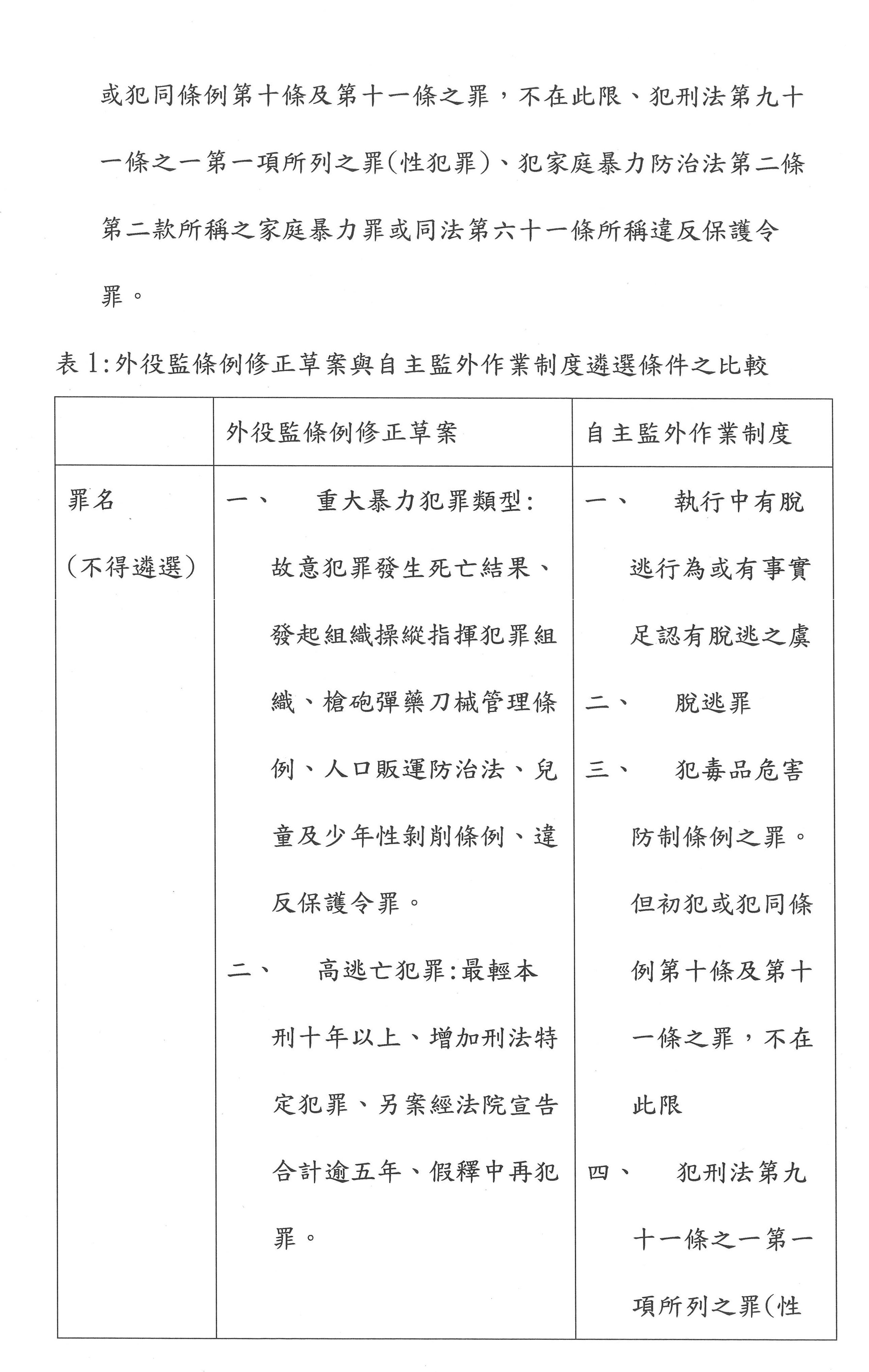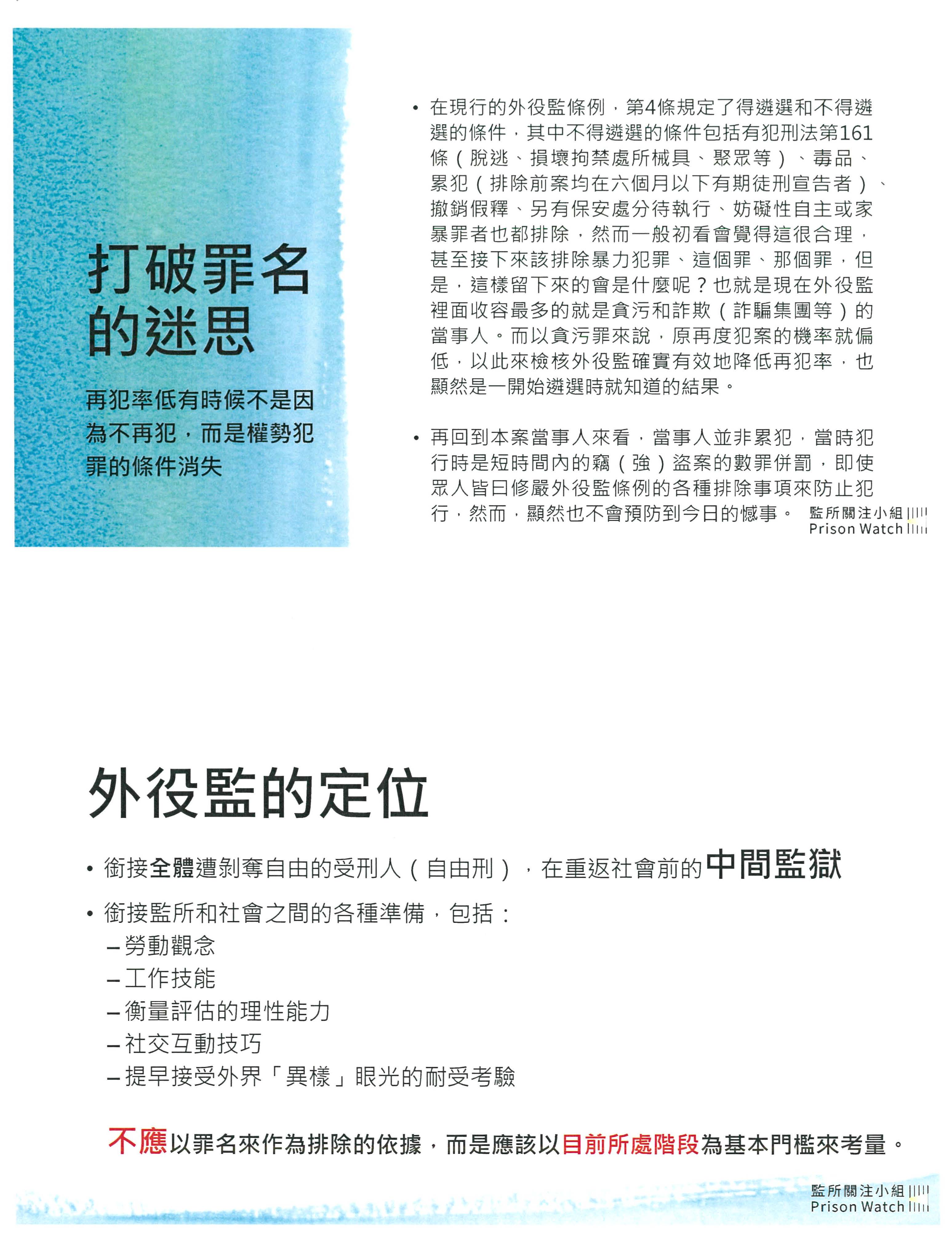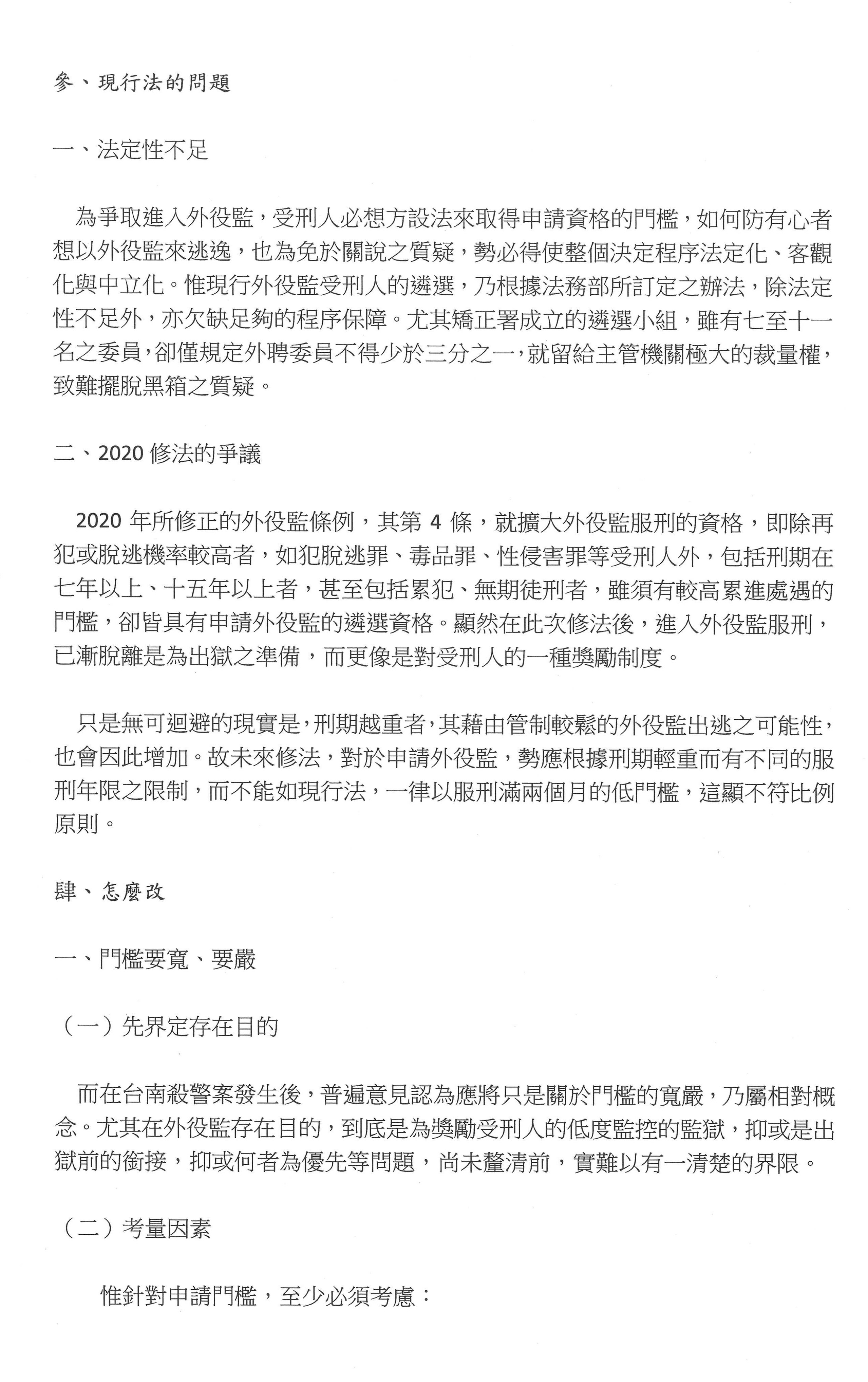 再來就是,我們看到草案裡面有形式要件「有期徒刑執行逾三分之一、累犯逾二分之一,且一年內符合可提報假釋之刑期」等條件,我坦白講,這個東西對收容人的誘因並不大,他都準備要出去了,剩下一年的時間,還要重新去一個新的地方、去適應一個新的環境,甚至適應新的管教人員,對他們來說他寧可不去。所以這樣的意義到底是什麼?接著,如果我們以特定犯罪作為排除條件,比如說故意犯罪致死、十年以上重罪、妨害公務至重傷、脫逃、強盜、加重詐欺、擄人勒贖等這種重大暴力犯罪,以及犯組織犯罪防制條例、槍砲彈藥刀械管制條例、兒少性剝削防制條例、性侵害犯罪防治條例、家庭暴力防治法、毒品危害防制條例、人口販運防制法等。坦白講,這些如果全部作排除,外役監其實就等同於白領犯罪或者是公務人員貪瀆專監,這樣外役監就喪失了作為中途監獄接軌社會的功能,還不如全面廢止,改為一般監獄來得實際。