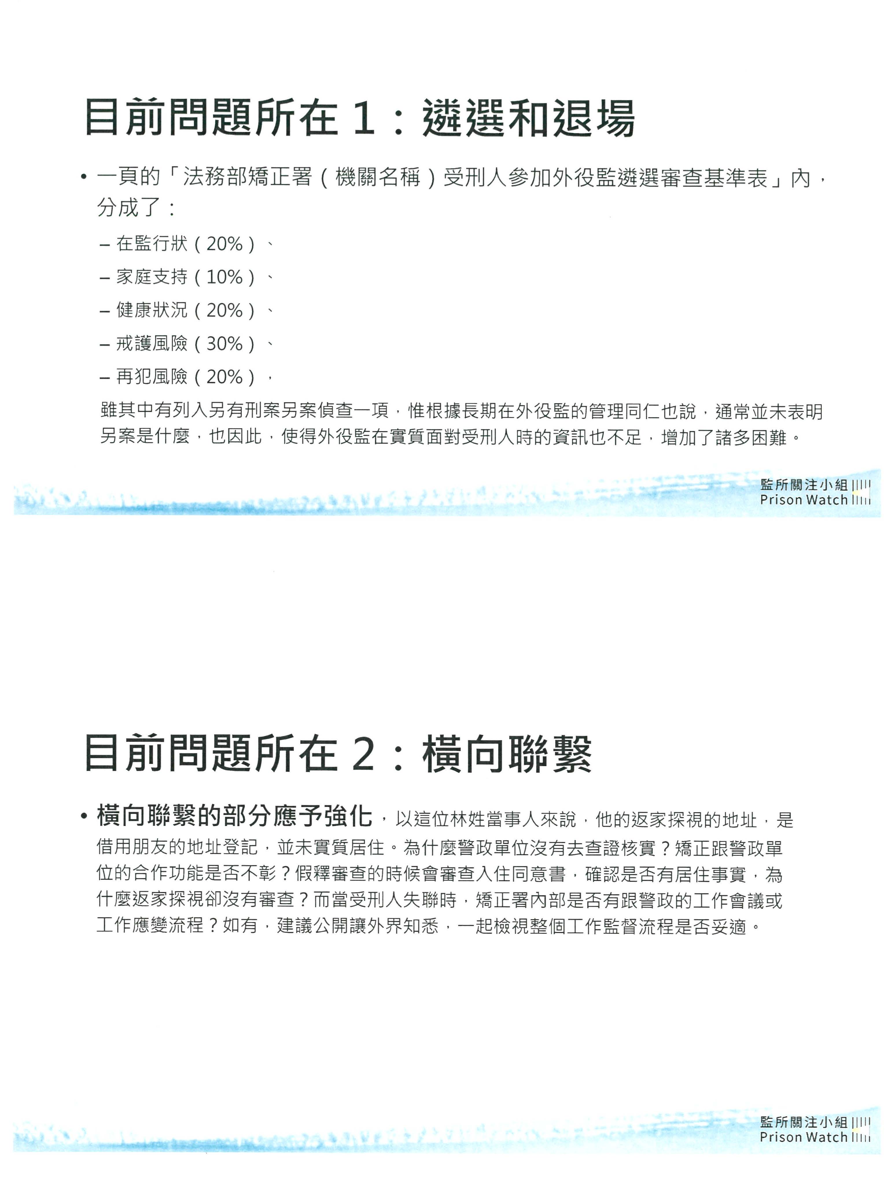 再來,有關於返家探視管理的部分,我們建議是不是目前外出的制度可以有一個循序漸進的方式來進行?我們目前全部都是以40小時加交通時間,有沒有可能用20小時的方式,然後循序漸進?可以讓收容人比較珍惜返家探視的機會,也讓機關更有一些觀察的彈性空間。另外,我們談到管理的部分,常常現在都透過警察或相關的司法單位做一些監控,可是我覺得外役監的收容人他返家探視也算是一種提早復歸社會的過程,所以有沒有可能透過跟村里長、里幹事或是更生保護或是社區復歸的相關資源,例如說家庭教育中心、心衛中心等等,用比較柔性的方式去做一些輔導與協助,也可以去加強一些監控的效果?其他的部分,請大家再自行參考。