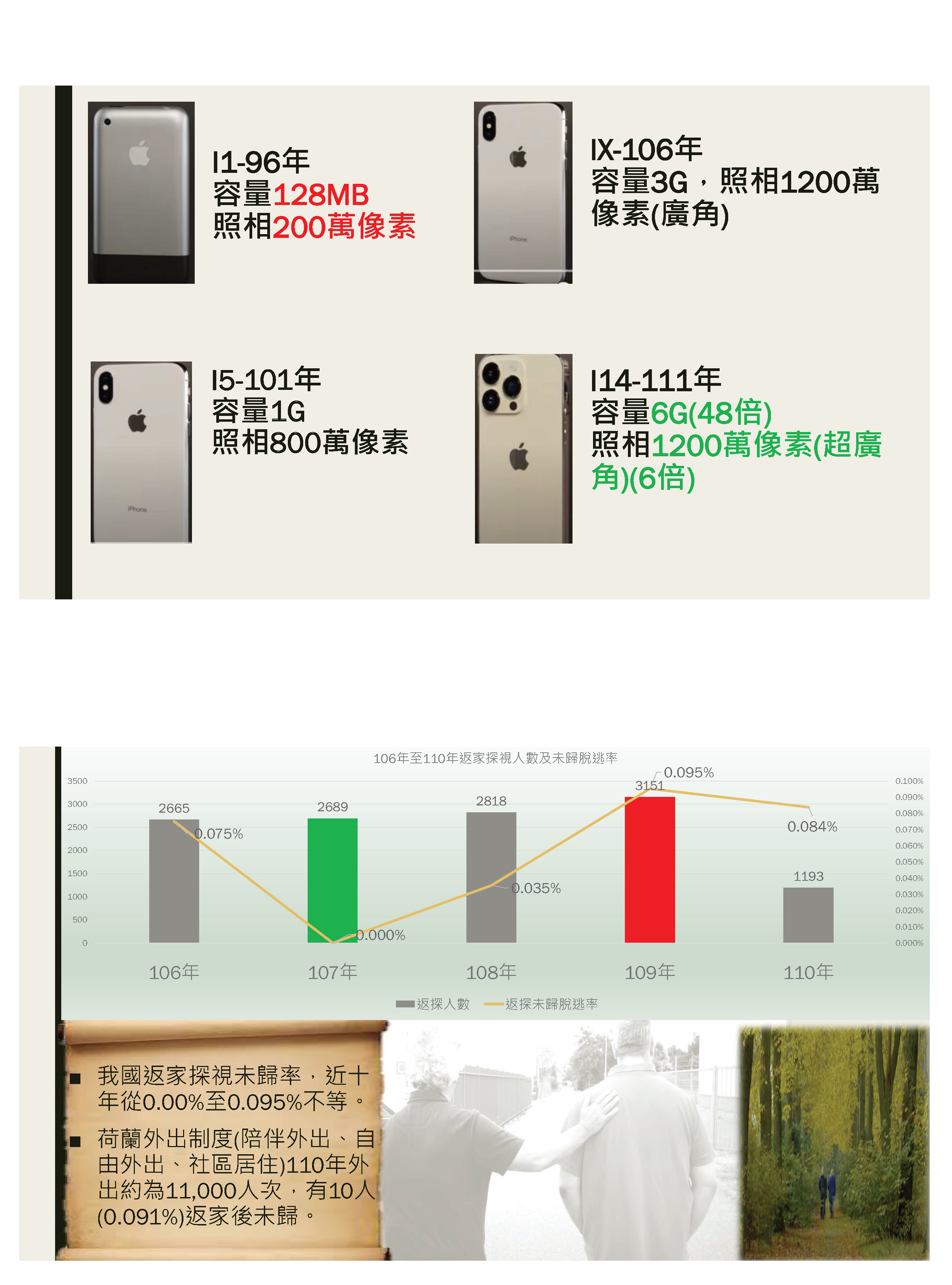 另外提到一個資料,大家也比較關心的,即返家探視的部分,還有返家探視未歸以脫逃論罪的一個情況。我統計某一個外役監的資料,為避免給此監獄壓力,我就不說了。106年到110年返家探視的人次,依次是2,665、2,689、2,818、3,151及1,193。除了110年因為疫情關係,人數比較少以外,各年大概都在3,000人上下。各年返家未歸以脫逃論罪的人數,分別是從0人到3人,比例是從0%到0.095%。我提供一個荷蘭的資料,荷蘭的機構性處遇也有類似的外出制度,他們110年的外出有1萬1,000人次,有10人返家後未歸,大約是0.091%。我們以這個數字來看的話,大概只有109年的0.095%略高以外,其他年度都是低於這個數字。其次,荷蘭的外出制度比較特別,即有陪伴外出、自由外出及社區居住的三種情況。各位看到兩張照片裡都有一個人陪著另外一個,一個是該機構的輔導員,而另外一個是個案。假如我們將這種陪伴外出制度再扣掉分母的話,比例可能應該會更高一些。