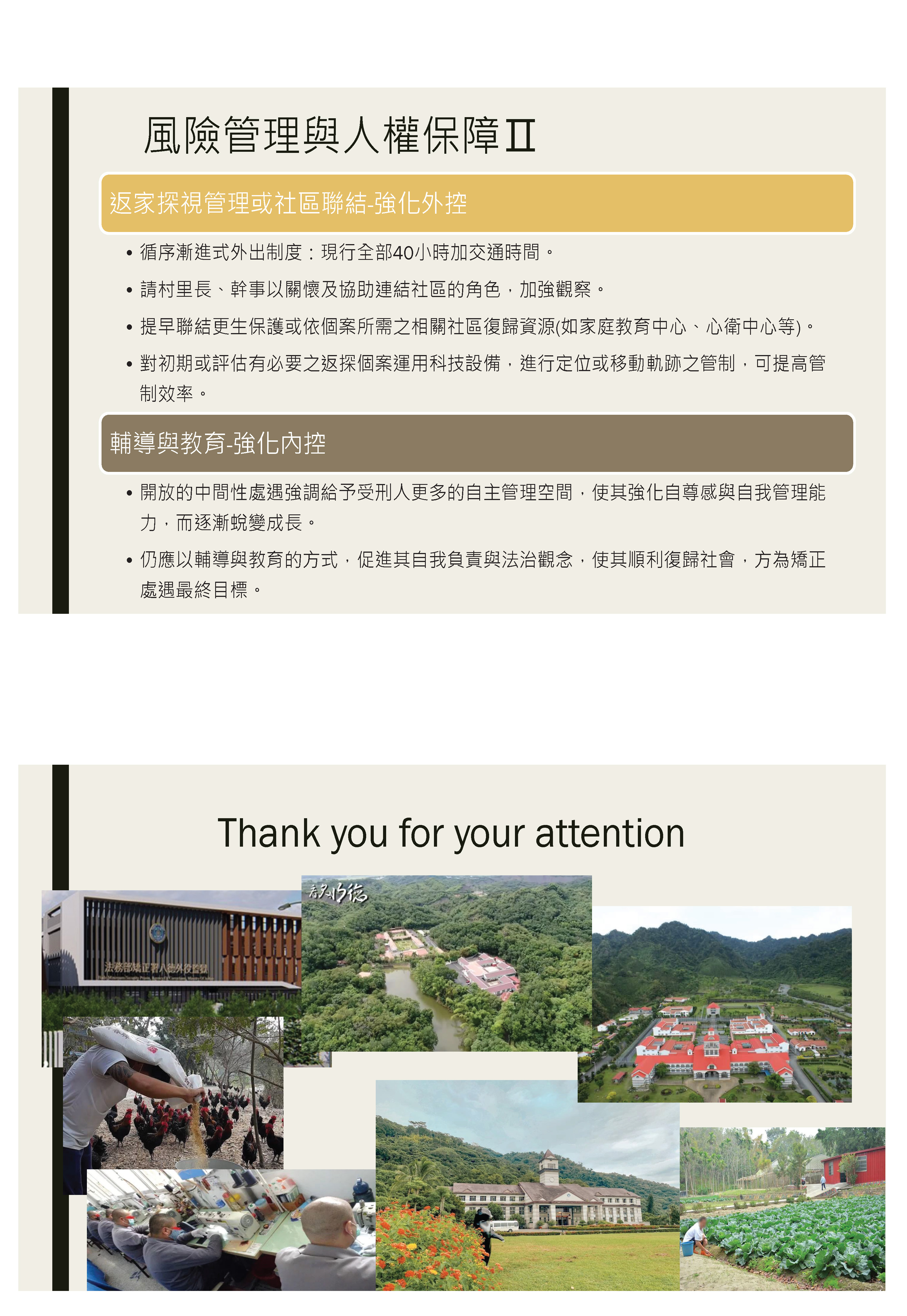 最後,我這邊要再強調的是,各位看到這上面的照片都是外役監的環境,還有外役監收容作業的情況,其實矯正機關一直很努力地在營造良好的矯正環境和處遇措施來協助收容人復歸社會,不過矯正機關也需要社會各界的支持,他們才有信心繼續去推動跟深化這些具有行刑社會化理念的矯正工作,以上。