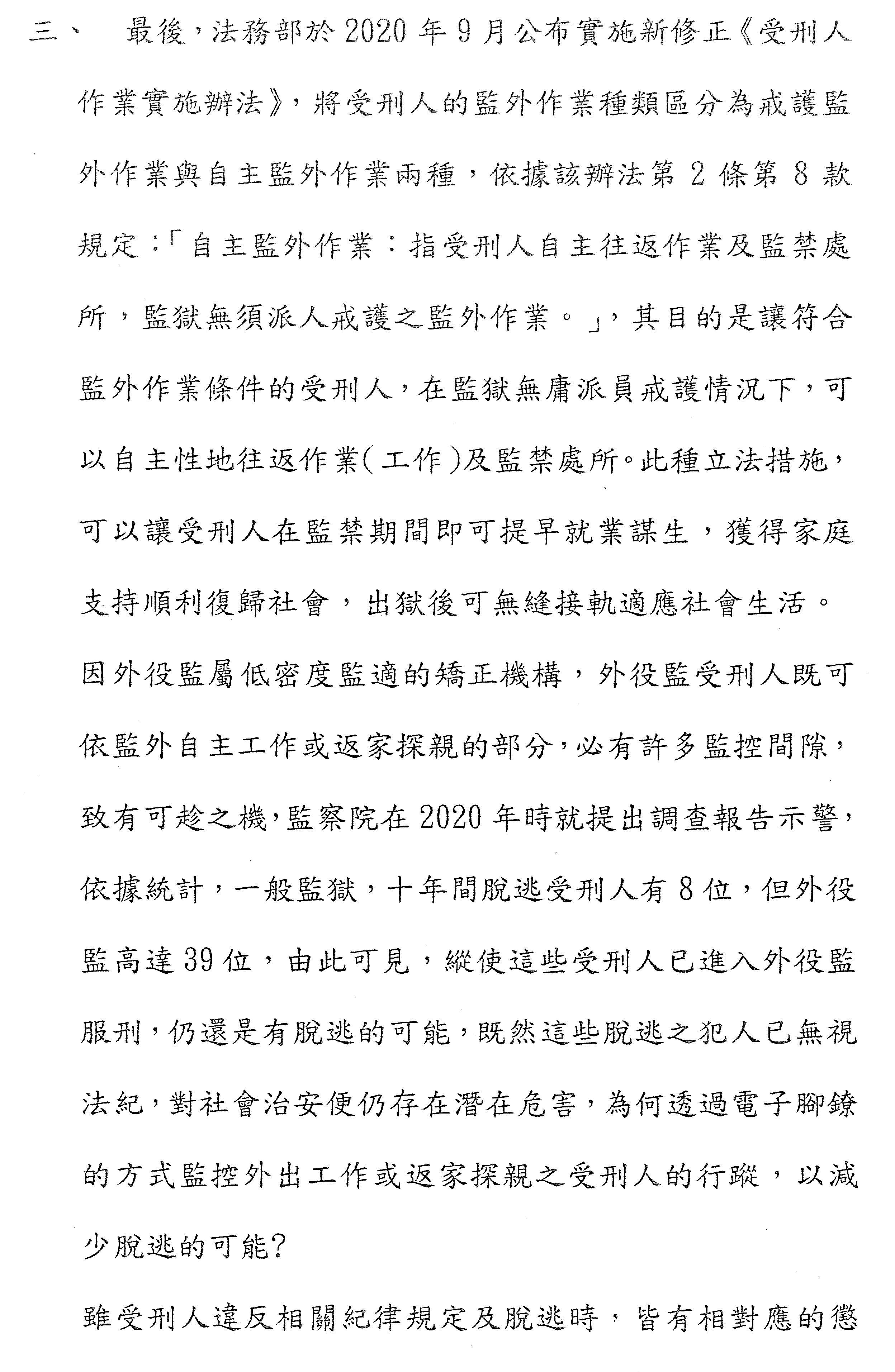 這次修法這麼快,可是監察院並不是沒有對外役監提出過任何建議,監察院在2000年12月、2020年、2021年、2022年都分別公布一次的調查報告,這些調查報告都非常地仔細。監察院或許只對官員能夠有一些效果,但是它會有很強的詢問或是資料蒐整的工作。如果大家願意回去看看的話,也可以看。