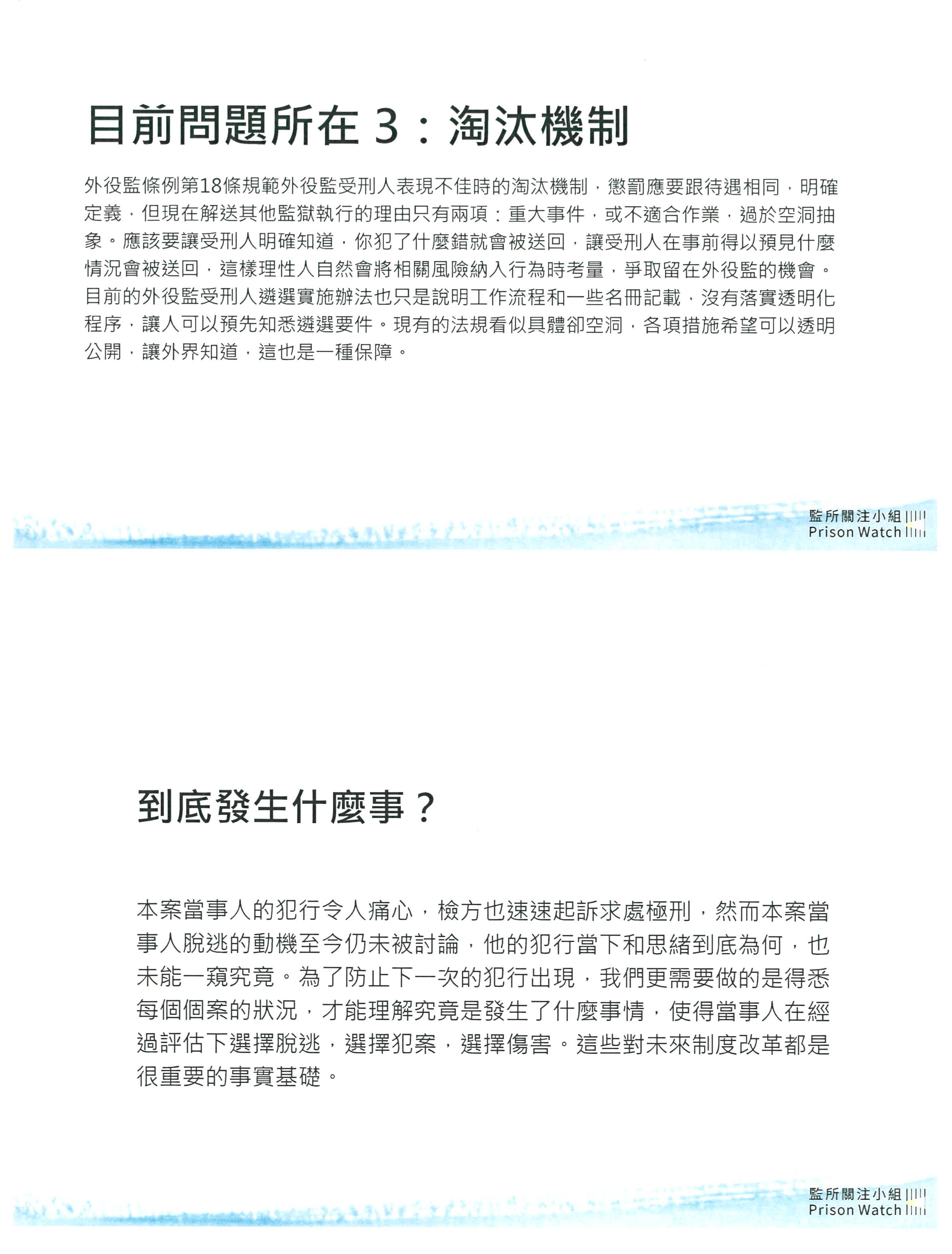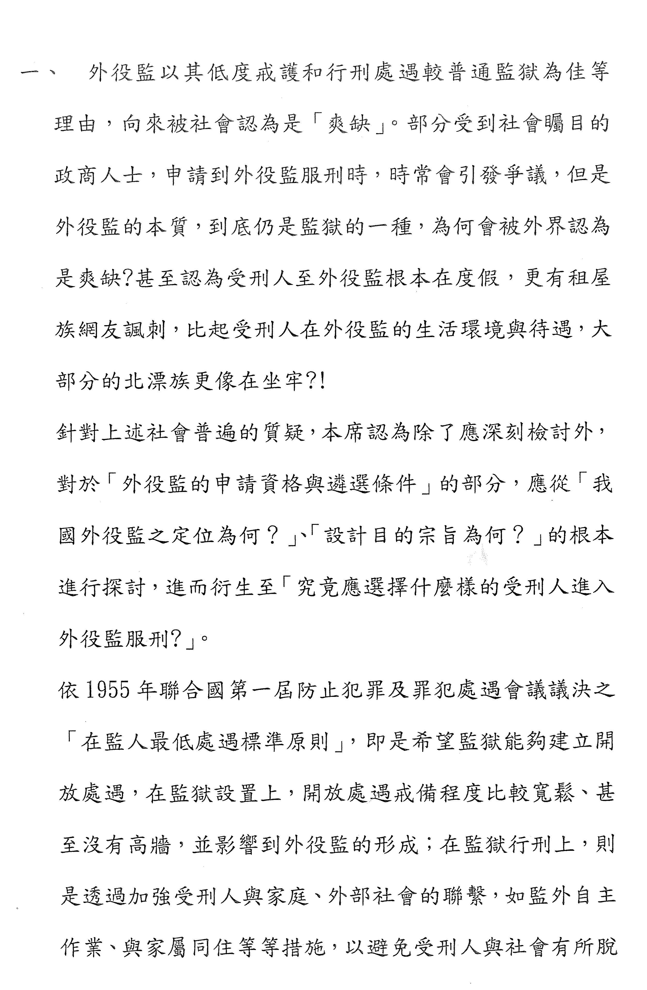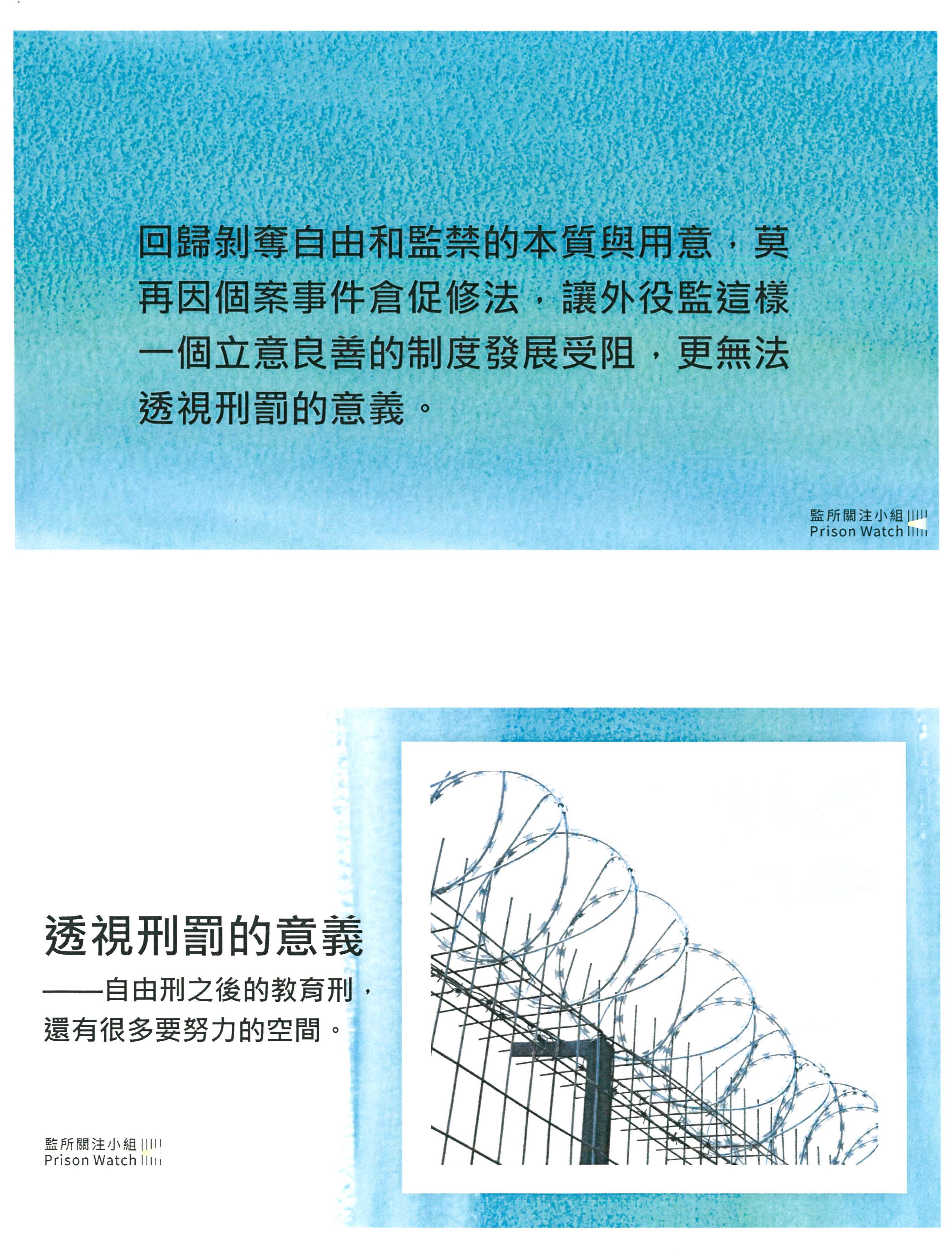 另外我覺得大家也趁這個機會順便一起關注,外役監是一個中間性處遇的好場所,但是其他絕大多數的受刑人都不會進外役監,都在一般監獄裡面,這樣一來他們的中間性處遇要如何實施?就算在一般的監獄中,如何給予相當於適應社會生活中間性的待遇?這個其實應該一併評估,這樣子大家就不會覺得,進外役監是種天大的特權。現在之所以會變成天大的特權,是因為一般監獄裡面的處遇措施跟外役監差太多了。但是如果在一般監獄裡面也普遍的提升,讓他們有很多種比較彈性及適應日後社會生活的一些作法的話,也許大家標準拉齊以後,就不會感覺到這麼大的懸殊。