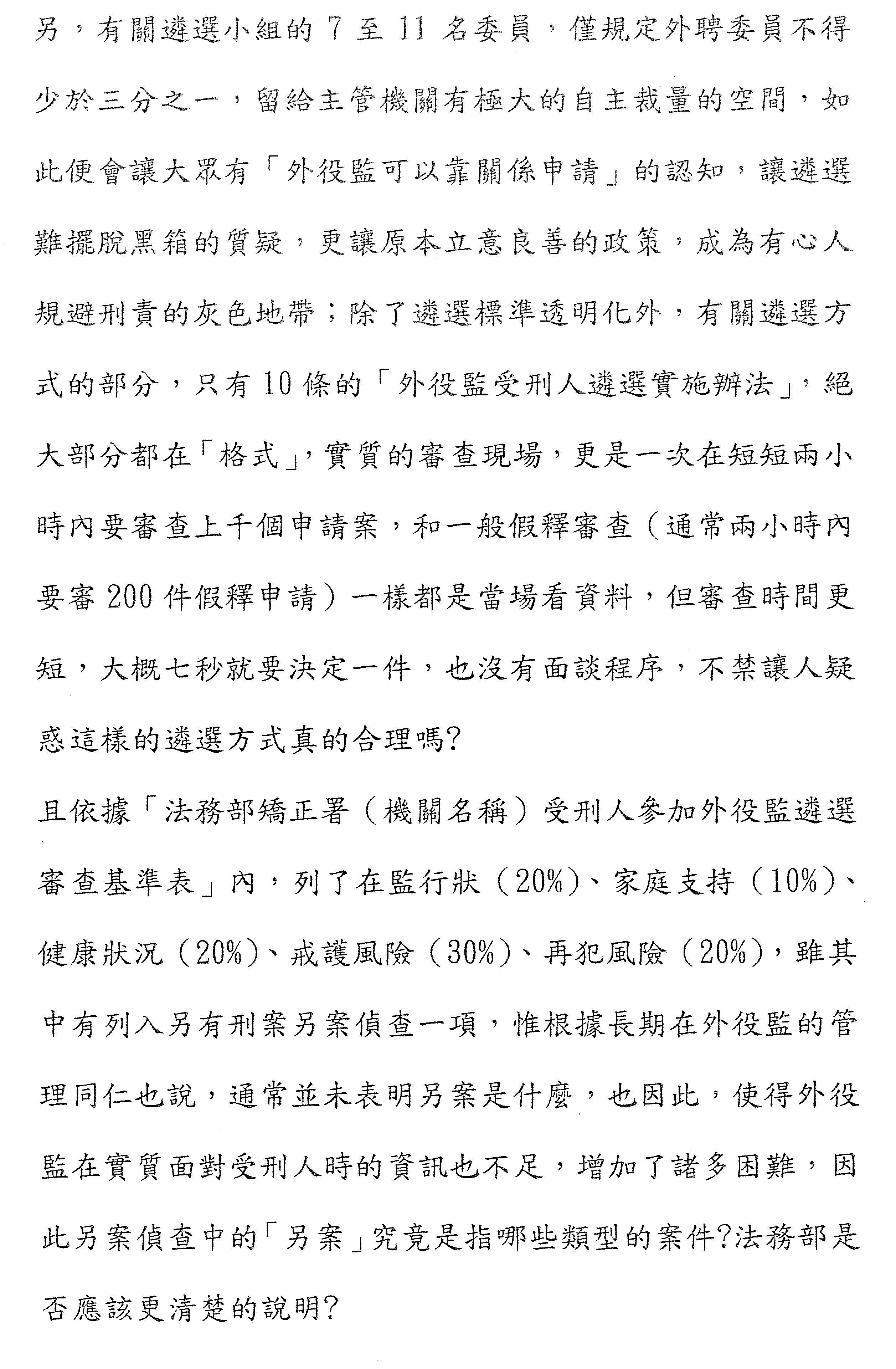 另外,我們當然也知道,很多技術上的細節,比如如何遴選,其實我們司法及法制委員會在這個會期已經安排好幾次專案來談這件事,當時我來質詢的時候也談過,包括現在很多的遴選機制,看起來確實非常的粗糙,比如在初審的時候就只是用一張評分表就決定了一個結果,但是這個評分表到底是誰來評,不管是典獄長或是內部人士,他們到底有沒有這方面的專業,老實說,我們也都很懷疑,就算在複審時有專業人士參與,但還是按照一開始初審的方式,就是用那樣一個表格來處理,總之,這些過程也沒有一個很有效的方式來做所謂品質上的把關等等,所以這當然也凸顯了在制度上、在執行上的風險或問題,本席認為,這確實也應該再予以精進。