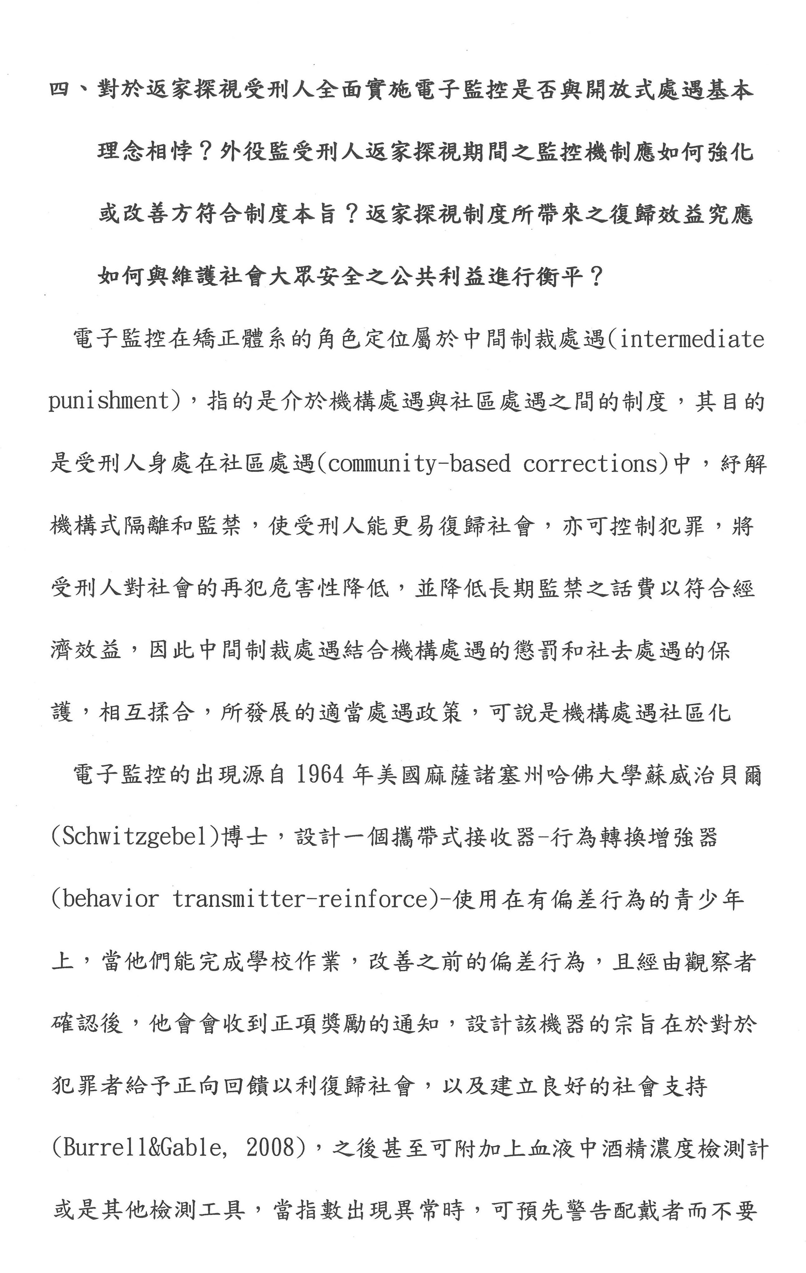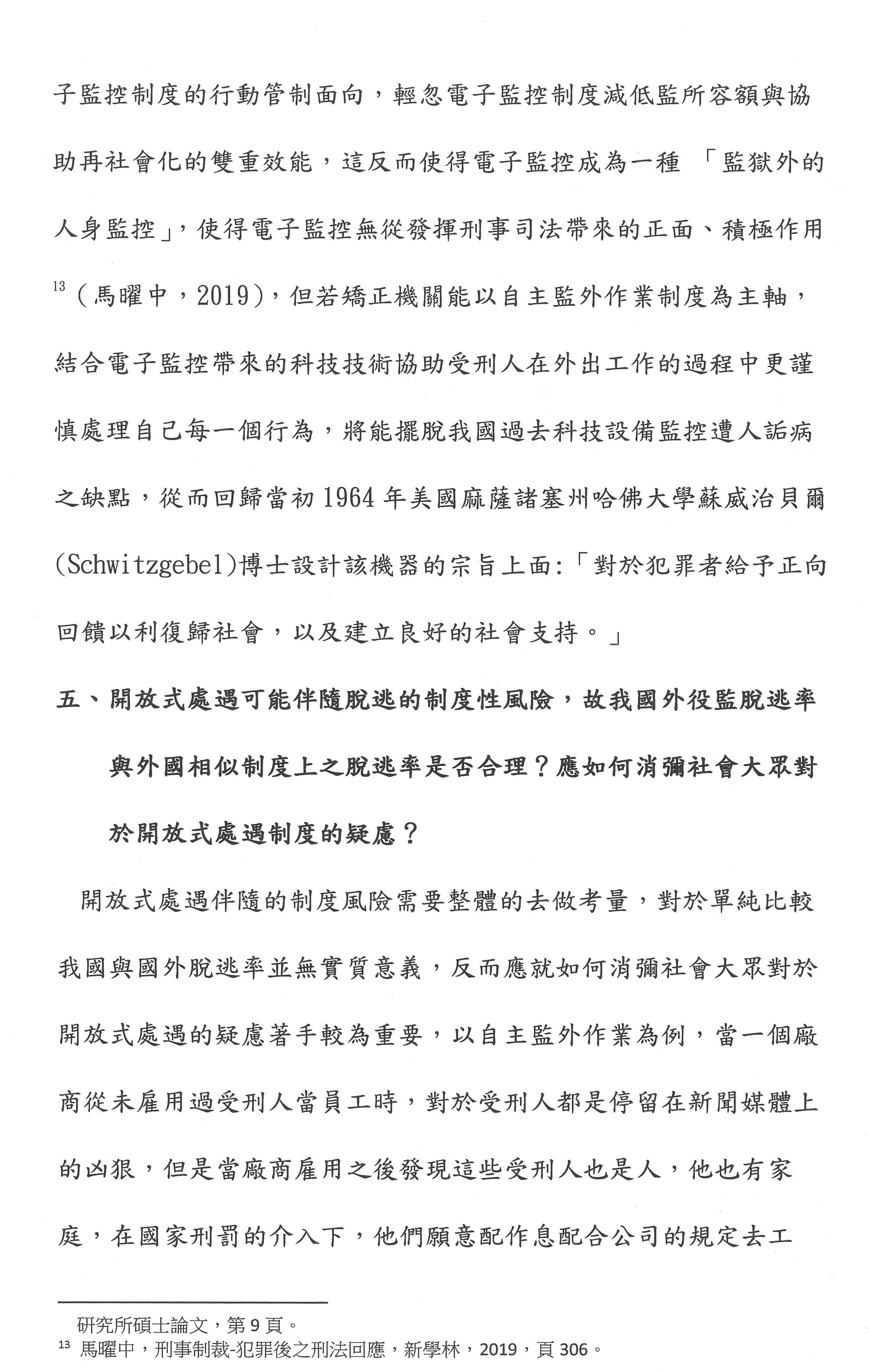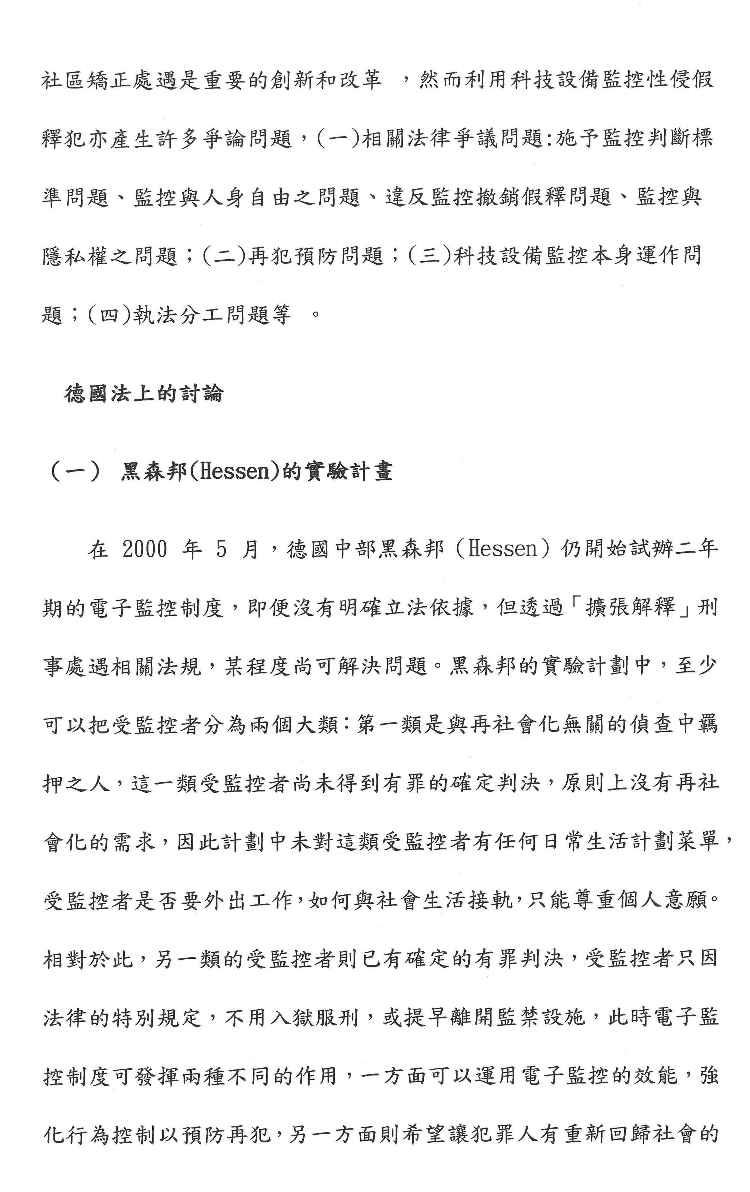 其次,要不要電子監控?依目前臺灣的刑事政策,電子監控只適用於性犯罪者的刑後治療,但是在國外,德國符騰堡裡面用了很多。它是美國設計出來的,他們很多是用在違反保護令,或者緩刑交付保護管束、假釋交付保護管束的人。雖然我們用電子腳鐐進行電子監控,但是第一個,我們可以設計,想想看自由刑易服居家監禁,這部分我們可以用易服的方式取代;第二個,用於釋放前的準備階段,包含假釋交付保護管束的人;第三個就是在開放式機構的人離開監所的時候,我們可不可以用GPS的電子監控系統?如果這三種可以使用的話,就能夠讓監獄不要處於這麼擁擠的狀態。我們剛才所講的開放性監獄其實就是在第三種。我認為電子腳鐐是一種監控的性質,但是在國外成功的方案都是監控加輔導、諮商。剛才有委員提到我們要設計一些心理師、社工師這個部分,我們不是把它框在腳上而已,雖然我們的科技很發達,我們的台積電很厲害,但是我們不是把人當作一個課題在監控而已,我們要給他一個心理的治療。