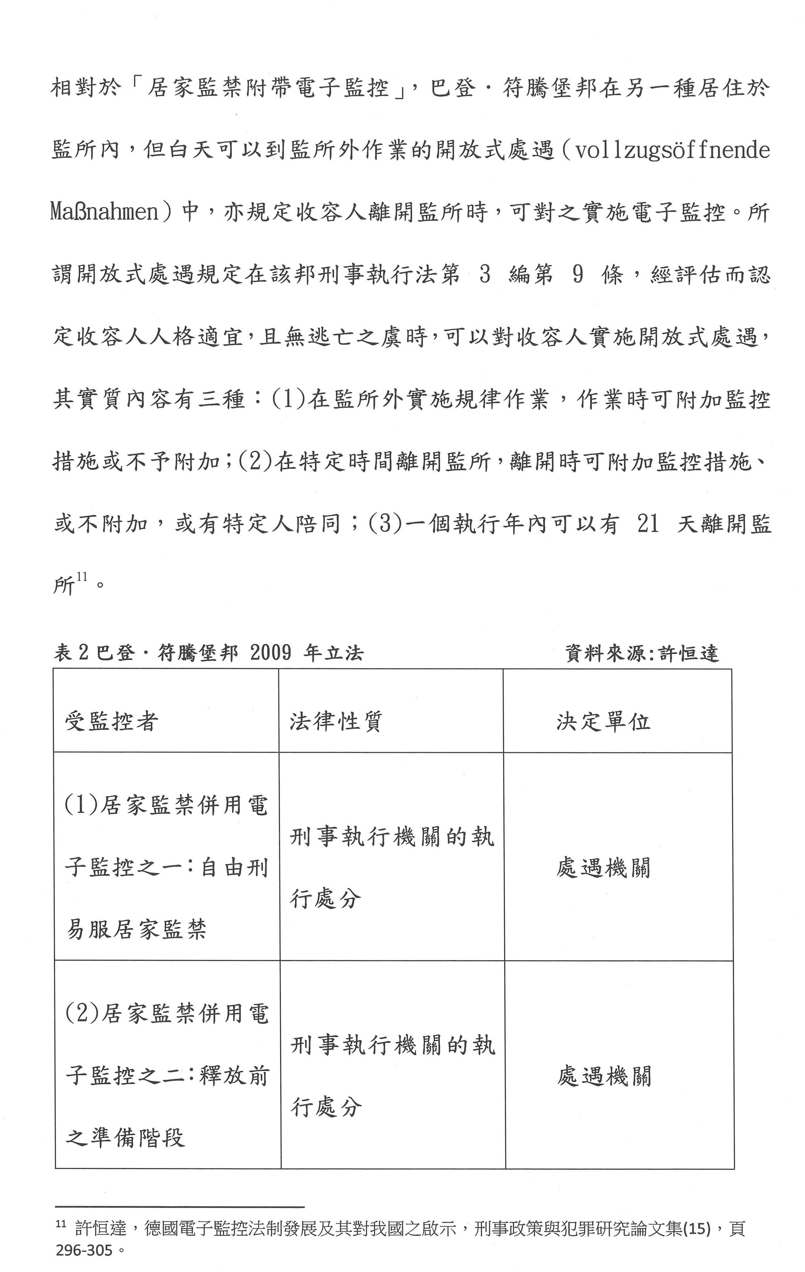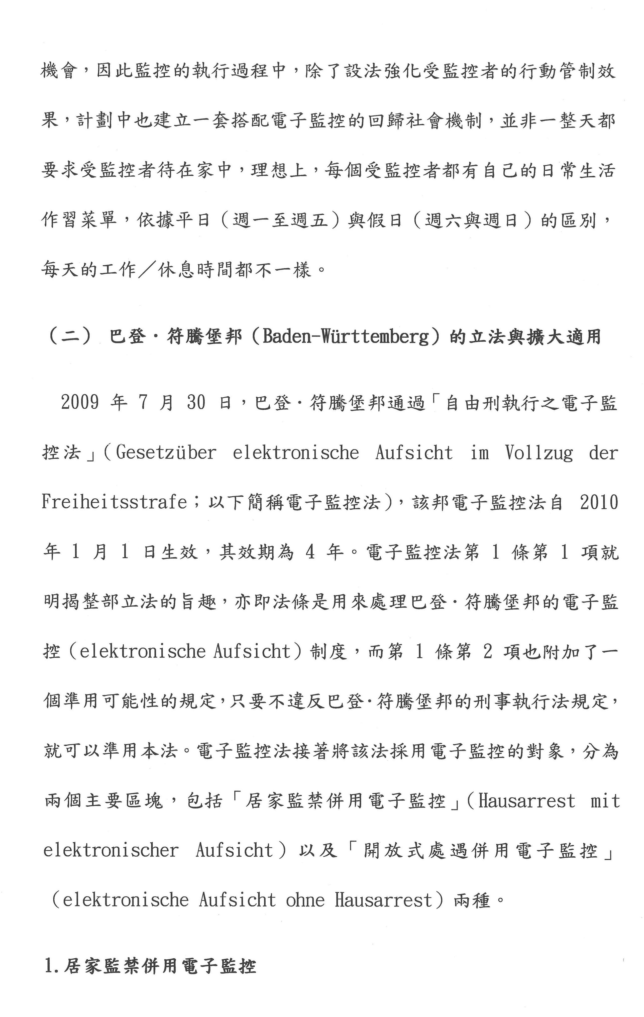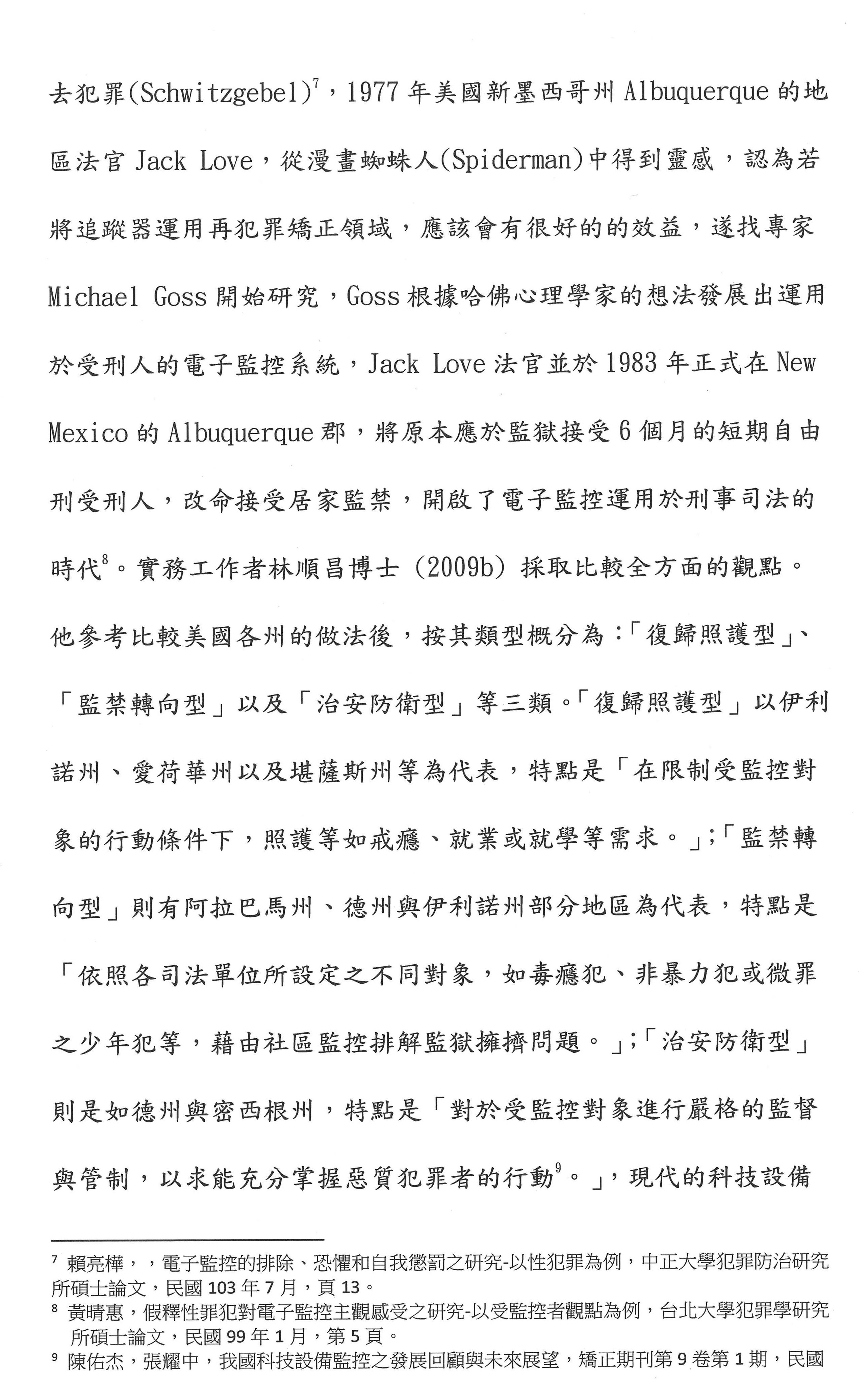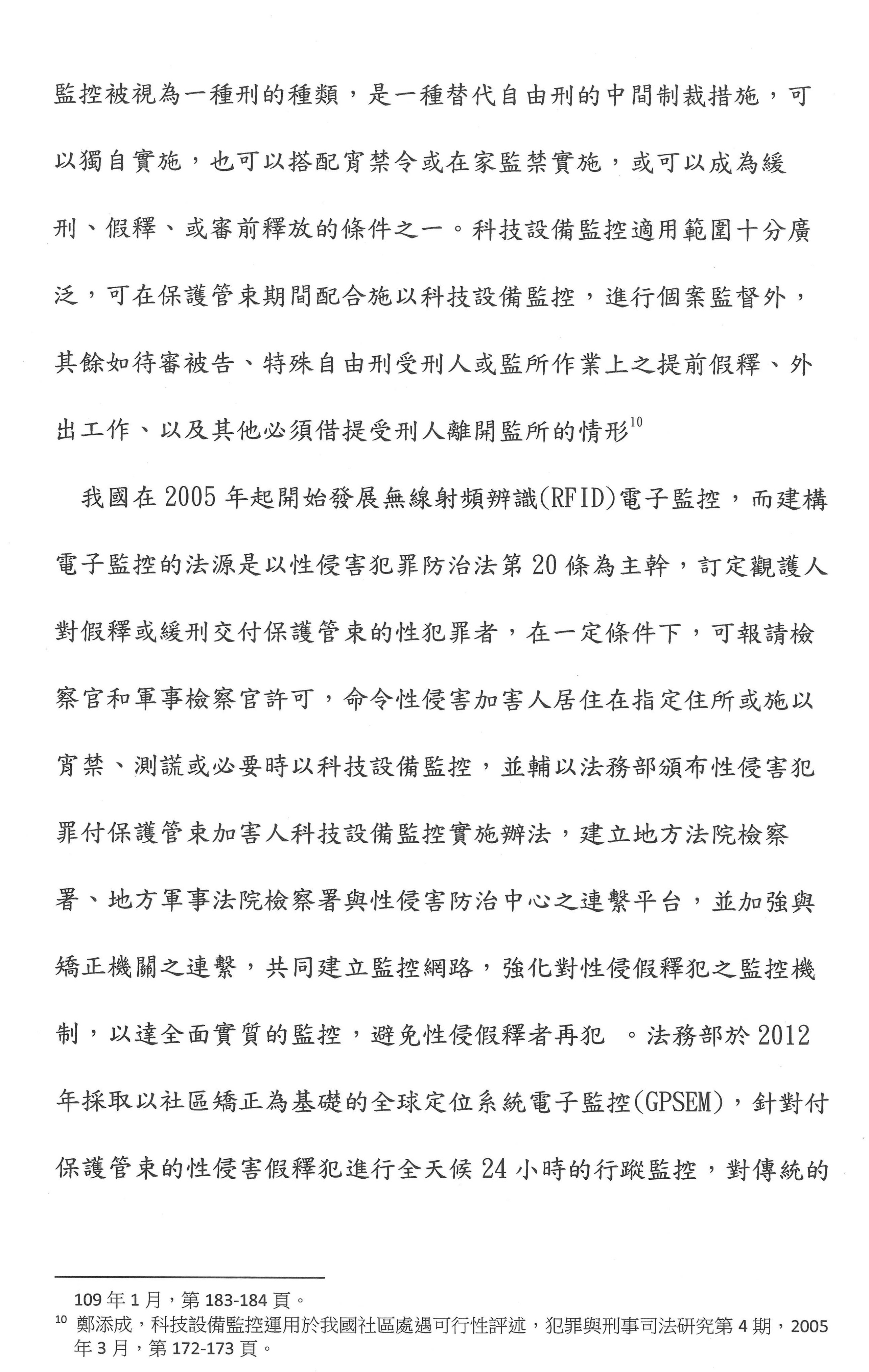 其次,要不要電子監控?依目前臺灣的刑事政策,電子監控只適用於性犯罪者的刑後治療,但是在國外,德國符騰堡裡面用了很多。它是美國設計出來的,他們很多是用在違反保護令,或者緩刑交付保護管束、假釋交付保護管束的人。雖然我們用電子腳鐐進行電子監控,但是第一個,我們可以設計,想想看自由刑易服居家監禁,這部分我們可以用易服的方式取代;第二個,用於釋放前的準備階段,包含假釋交付保護管束的人;第三個就是在開放式機構的人離開監所的時候,我們可不可以用GPS的電子監控系統?如果這三種可以使用的話,就能夠讓監獄不要處於這麼擁擠的狀態。我們剛才所講的開放性監獄其實就是在第三種。我認為電子腳鐐是一種監控的性質,但是在國外成功的方案都是監控加輔導、諮商。剛才有委員提到我們要設計一些心理師、社工師這個部分,我們不是把它框在腳上而已,雖然我們的科技很發達,我們的台積電很厲害,但是我們不是把人當作一個課題在監控而已,我們要給他一個心理的治療。