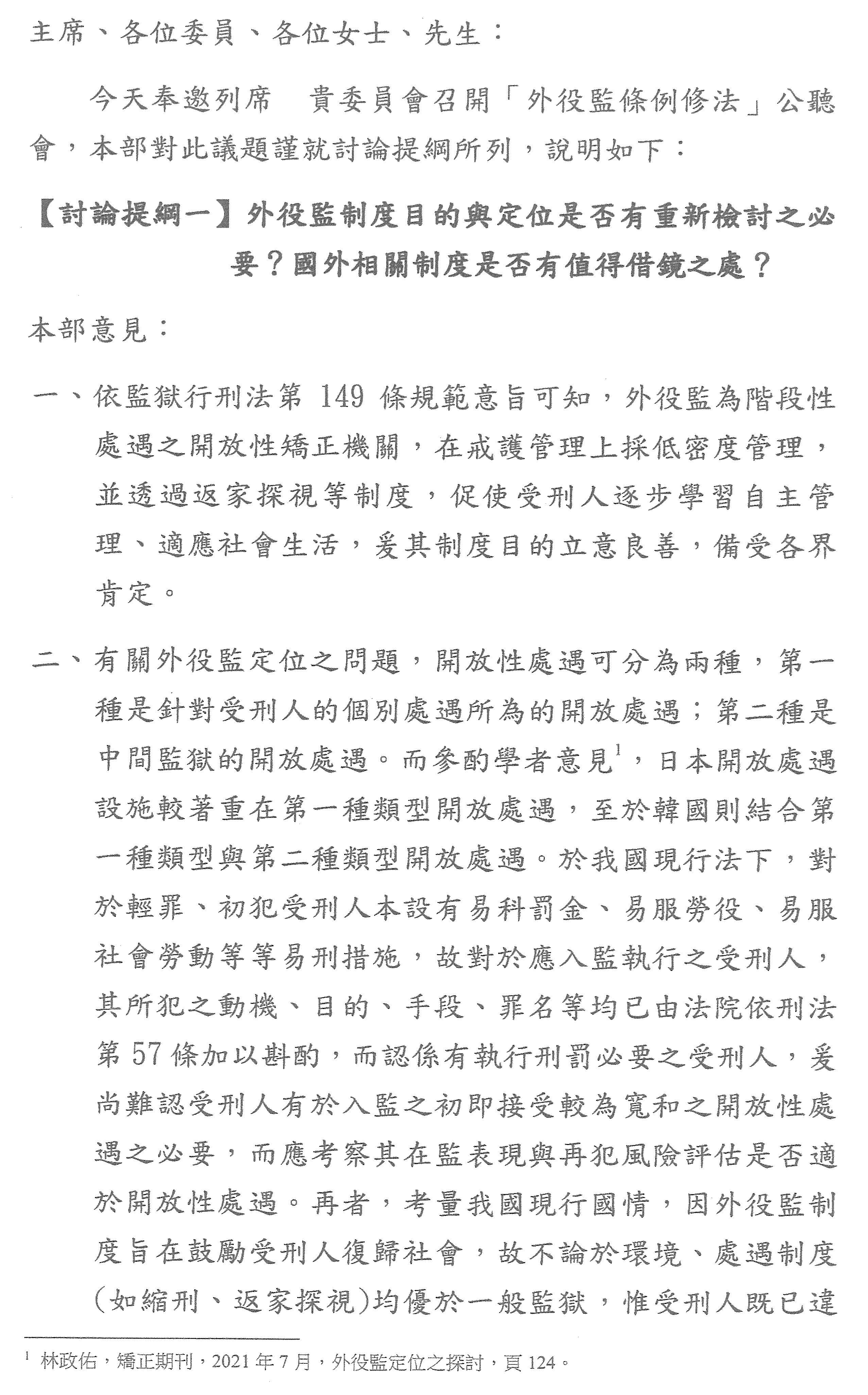 基本上,設置外役監的想法是希望某一些人在他要回去銜接社會時,在這個過程中,先有一個過渡時期;甚至某些犯罪,也許不需要科以那麼嚴格的刑度,讓他們能夠更早去銜接社會等等,也就是說,這是原始的立意,也是一個不錯的想法,但現在就是在執行端慢慢開始出現了疏漏、出現了問題,包括這次脫逃造成的問題等等,這也讓大家質疑,這中間到底是怎麼遴選的,所以認真來講,其實在法制上就是要想辦法來避免只是頭痛醫頭、腳痛醫腳,或是今天挖了東牆,反而西牆就有問題。換言之,我覺得這當然是在法制設計上的一個衡平點,是必須先想清楚的,甚至直白來說,包括今天很多學者專家的高見,我們都聽到了,就是把外役監條例真實的定位先講清楚,這個我們認為是重要的。