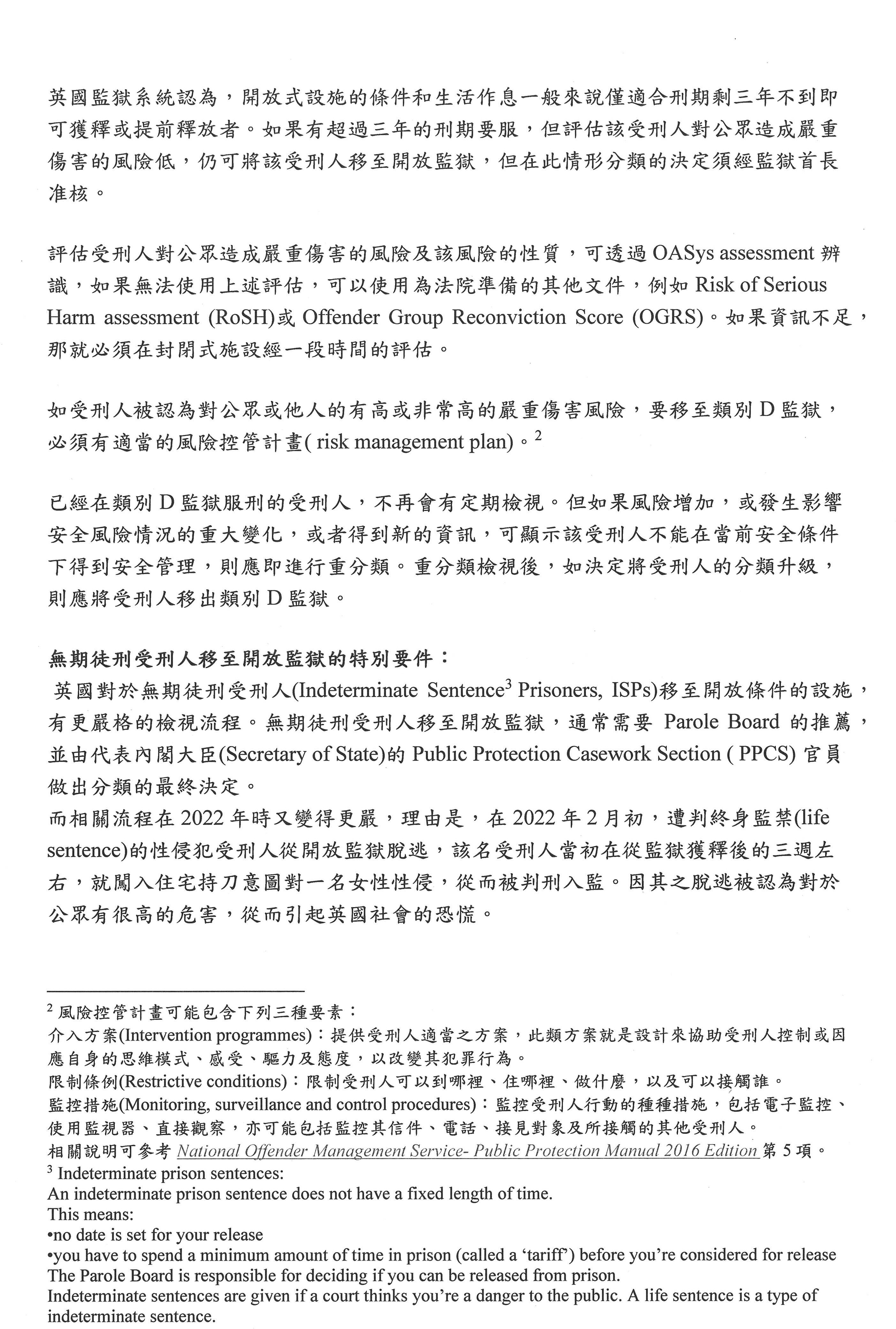 在2022年也是今年的時候,因為英國也一樣發生一些重大受刑人的脫逃事件,即有性侵犯受刑人脫逃,然後被認為是高度風險,他們在綜合考慮其他脫逃事件以及本脫逃事件後,新加了一個要件,就是如果該受刑人移到開放監獄可能會破壞公眾對刑事司法系統的信賴的話,內閣大臣就可以基於此非處遇的理由來拒絕,只是這是比較限於少數的狀況。