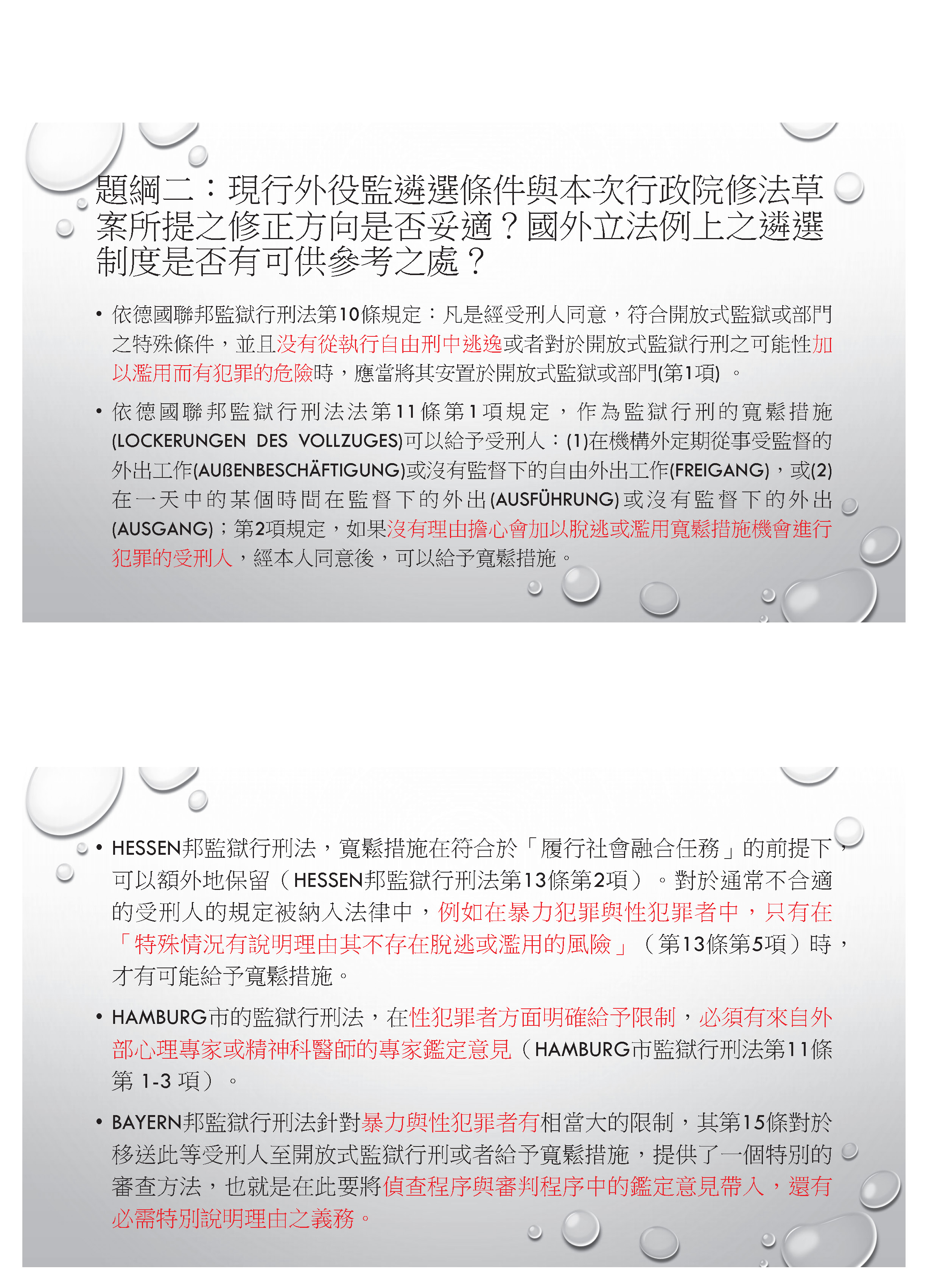 再來我要提到,德國因為在2006年之後,有關監獄行刑的事務就放到各邦權限底下,所以我也找了各邦的規定,像Hessen邦就規定涉及暴力犯罪及性犯罪的人會受到限制,不可以進入開放式監獄,但是如果有特殊情形且能夠說明理由,並不存在脫逃或濫用的風險時,還是可以去開放式監獄。漢堡市一樣也是規定性犯罪者原則上不可以被選進入開放監獄,但是需要引進外部的心理專家或精神科醫師做專家的鑑定。在Bayern邦也是規定暴力犯罪跟性犯罪會受到限制,但是在選擇的程序中,要求要引進當初在這個犯罪偵查跟審判中的鑑定人員的意見,來評估他有沒有這樣的風險。