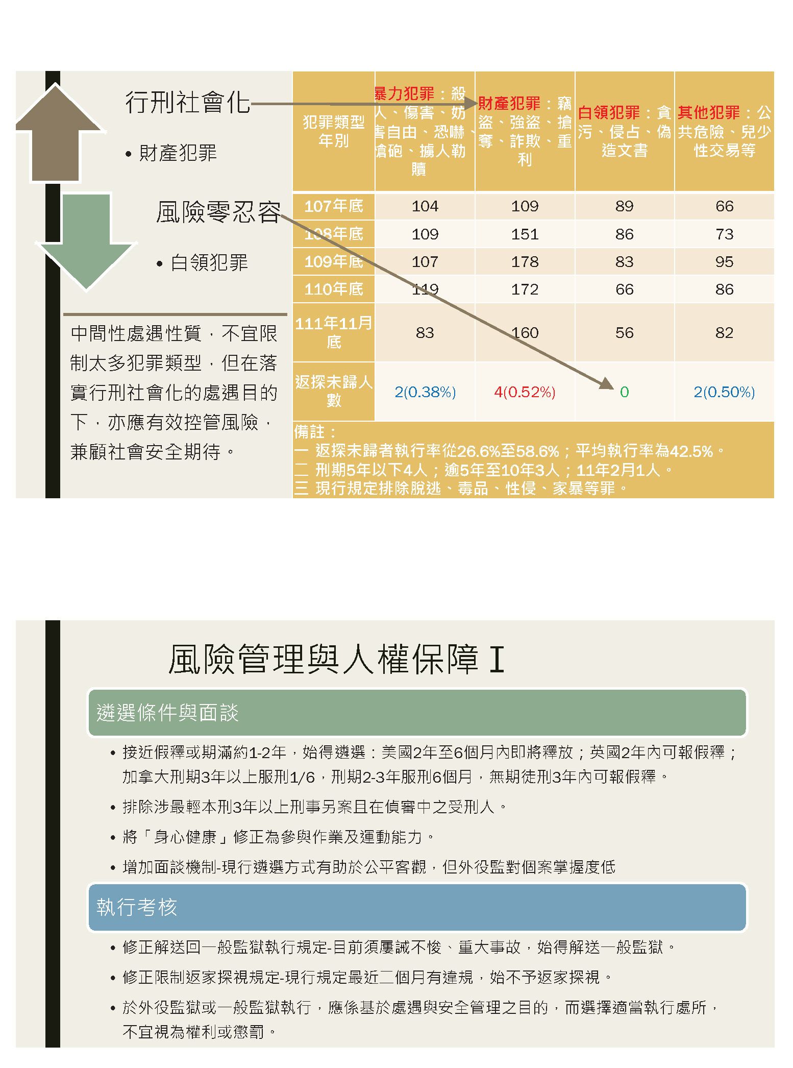 從犯罪類型來看,其實財產犯罪的部分要特別注意的是,我們常常講「飢寒起盜心」,所以這樣犯罪的人通常有比較高的再犯率,然後有比較低的復歸社會能力,甚至在返家探視未歸的比例他也是最高的。白領犯罪剛好相反,白領犯罪我們縱使不給他什麼協助,他的復歸社會能力大概也不太有影響,他也是可以很好的復歸社會,他有低再犯率,他返家探視的風險率也是最低的,所以我們假如強調行刑社會化的話,應該以收容財產犯罪為主;如果強調風險零容忍的話,應該以收容白領犯罪為主。不過只強調行刑社會化,不考慮風險,這個也不切實際,但是如果一直堅持風險零容忍的話,這個中間性處遇的效果大概就沒有發揮的空間,所以我個人認為中間性處遇性質不宜限制太多犯罪類型,但是在落實行刑社會化的處遇目的下,應該有效控管風險來兼顧社會期待。