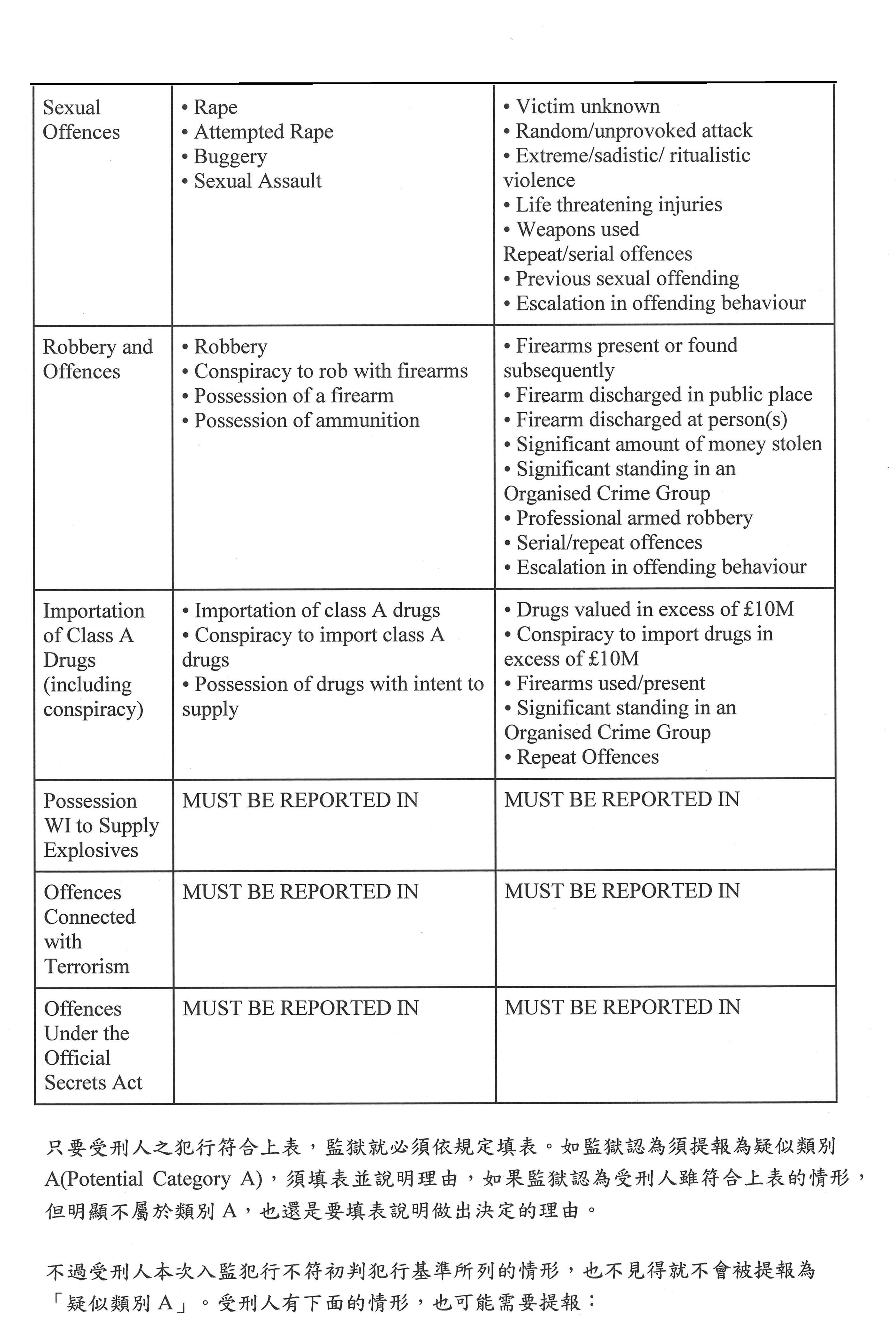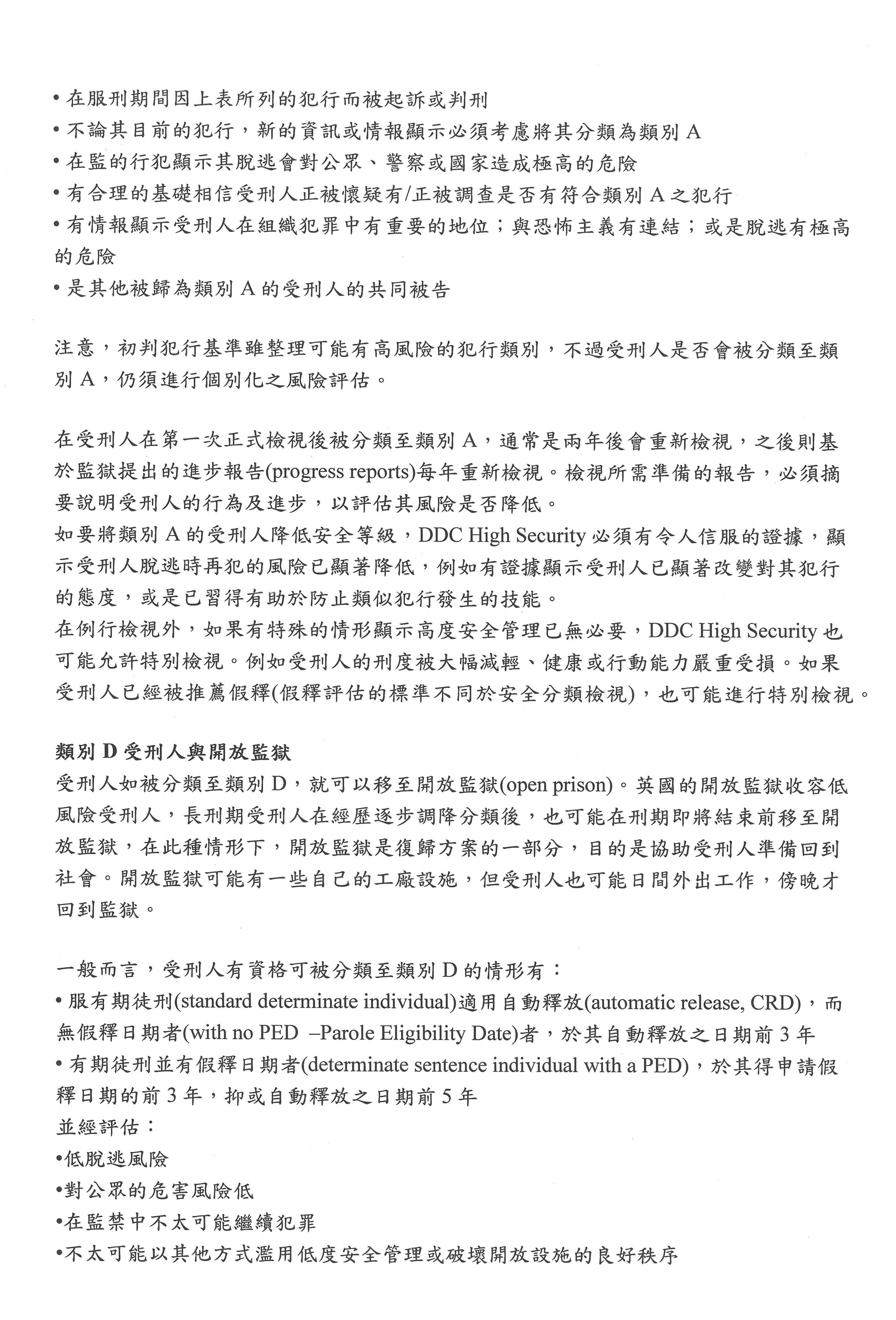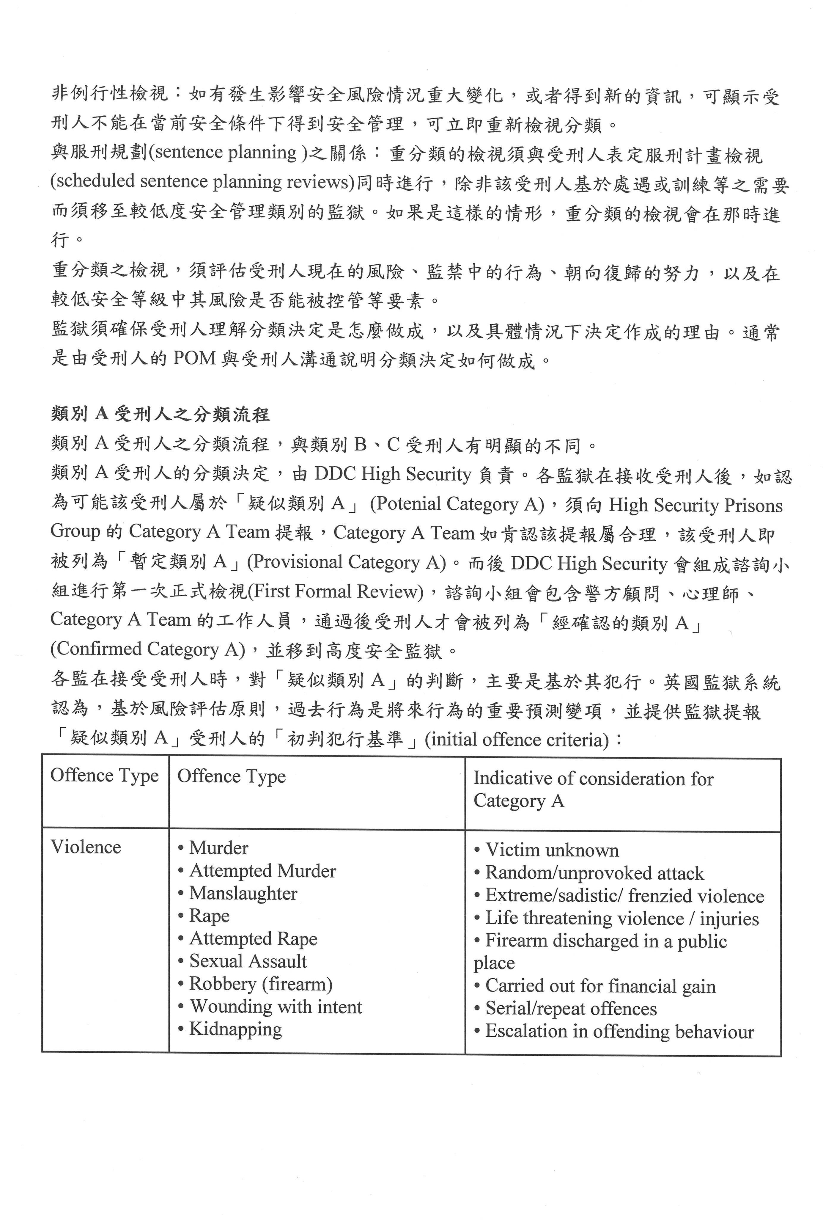 一般受刑人進到監獄,主要大概是分B或C類,C類是最一般性的,就是沒有特別狀況,沒有特別安全,也沒有特別不安全,那就是C類。當他們覺得C類受刑人有一些風險考量時,會把他提高到B;至於A的話,是他的脫逃會對公眾造成高度危險,所以絕對要讓他不會有任何脫逃機會,這部分他們會收容在高度安全管理的監獄內;D類就是低風險的受刑人。在我們這次的提綱中,最需要注意的大概就是A和D這兩種類型,因為現在外役監條例就是把某些他們認為有高度社會危害風險者排除,如果我們看英國制度,他們受刑人類別A的分類流程,就是在新收的時候提報,提報之後,就會有一個特別小組確認,最後再由DDC High Security做最後決定。提報的部分其實跟臺灣現在的草案設計有點類似,就是他們有一個initial offence criteria「初判犯行基準」,這部分他們其實有列表,明列哪些罪刑是有高度危險的。為什麼會有這樣的列表?最主要就是他們認為過去的行為是將來行為的一個重要預測變項,大家可以看一下列表,重點是他們列表的方式跟臺灣目前的遴選規範不太一樣,這個列表大概就是所謂的初判,就是監獄新收受刑人時,可以審視可能有哪種情況時就要特別注意這些人,但不是所有符合這些初判犯行基準的受刑人統統都會被歸到類別A,因為他們還要經過個別化的風險評估,就是前面盧映潔老師提到的機制。同樣一個暴力犯罪,實際上還有其犯行情節、受刑人過去的前科,或者像英國還有一些審前調查報告,呈現出這個人的一些犯罪生涯狀況,這些其實都是不同的,所以在一個比較粗的標準之後,他們還要進行比較個別化的評估,到底這個人是不是確實對社會有比較高的危害風險,然後在這個評估小組裡會有比較專業的風險評估人員,同時也會有心理師的角色,整體評價這個人的狀況。列到類別A之後,受刑人不是就一輩子永遠在監獄都是類別A,因為所謂的類別,他們其實是評估完之後要提供處遇,然後讓他的風險可以降低,這才是整個監獄處遇的重點,所以類別A受刑人之後的檢視就要提出進步報告,就是看他的個別處遇執行狀況、表現如何等等,以及風險是不是降低,如果有明顯證據顯示他的風險降低,就可以降級,最後有可能可以到open prison服刑。