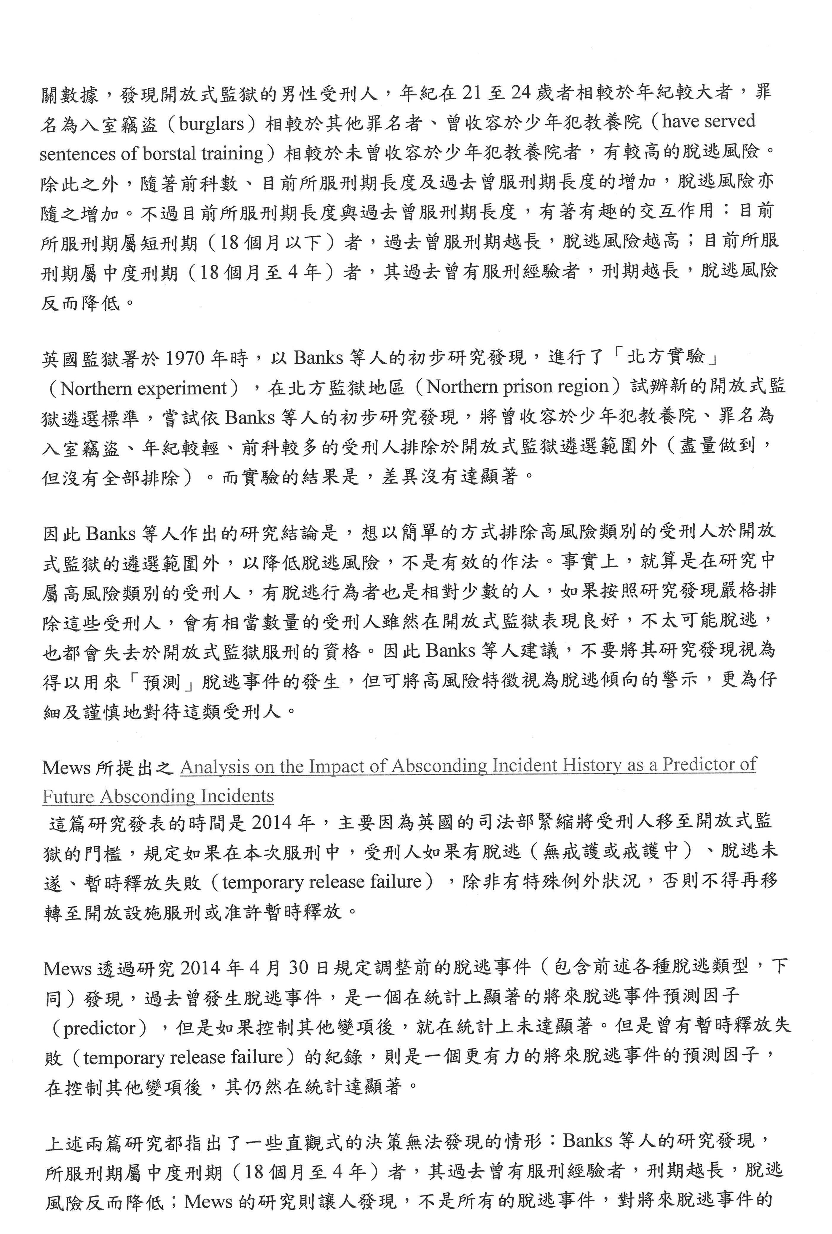 同樣的,我國也有一些除了外役監以外,像是自主監外作業等等,有時候會讓受刑人可以返家或外出工作。我國有些脫逃的事例,如果委員們有興趣可以直接查社會新聞,我們之前為了要寫一些研究案有查過社會新聞,我國的實例,他逃脫或者是未歸的原因,反而是證明了他社會復歸的可能性。例如有一個個案,他逃脫是因為出外工作的時候,在職場裡面覺得好像被貼標籤,他很想融入大家,但大家會一直覺得他是受刑人會貼標籤,並且覺得氣氛對他很不友善。他也曾經打電話或是跟家人反映「我好想回家去」,所以可能是職場上面被欺負,他受不了就真的很衝動回家了,雖然是返家未歸,但動機其實還滿值得同情的。另外一個個案是,他偶然知道太太跟人家跑了,這個事情他突然覺得就算是冒著被判脫逃罪的風險,也要趕快去處理、想要挽回感情。這些反而是一些很人性化的原因,而造成的脫逃或是違規,這也不是在當初審查的時候很容易就能評估出來的,所以我們反而要重視的是,在外役監處遇的階段,要如何去掌握受刑人的狀況?如何去防止一些常發生的因素?這個其實是管理技術上的問題,倒不見得是你在前面把資格弄緊就可以解決的。假設目前法務部已經有考慮要限制,即將提報假釋的受刑人,才讓他進外役監,甚至是搭配電子監控的話,也許這樣子已經不需要對當初的遴選資格設加太多的限制。