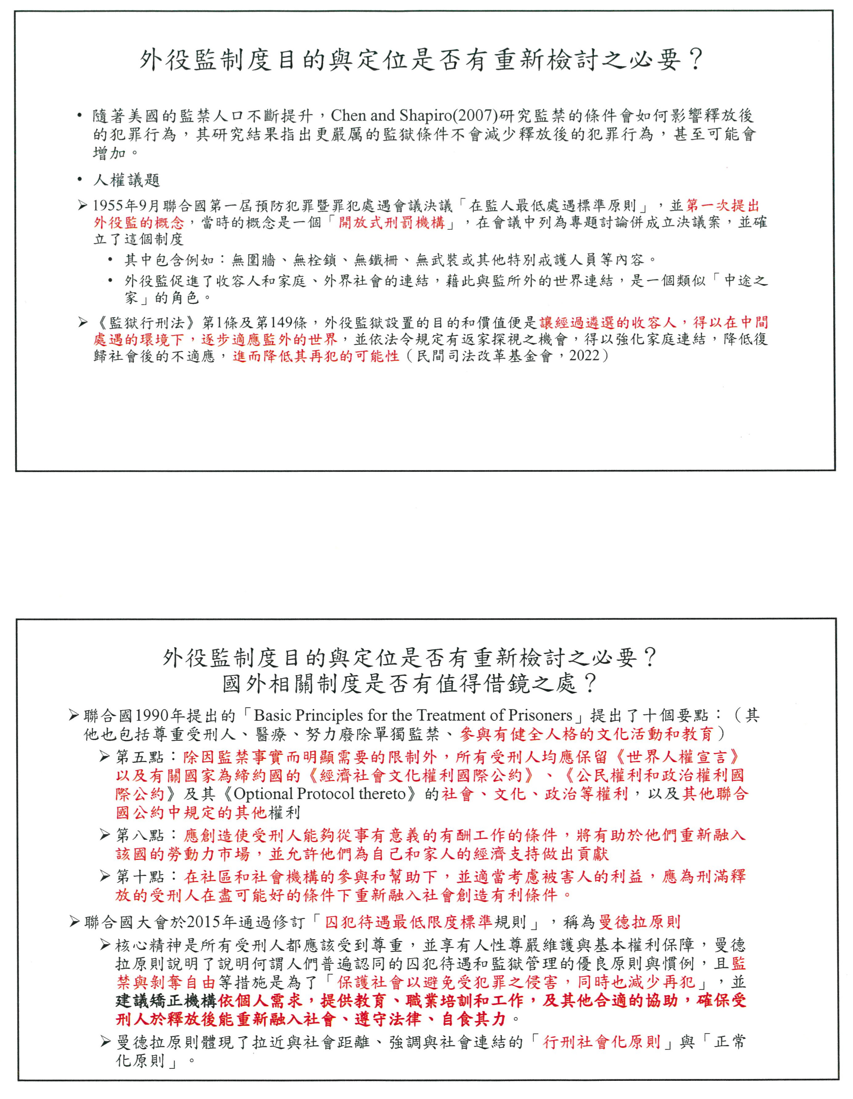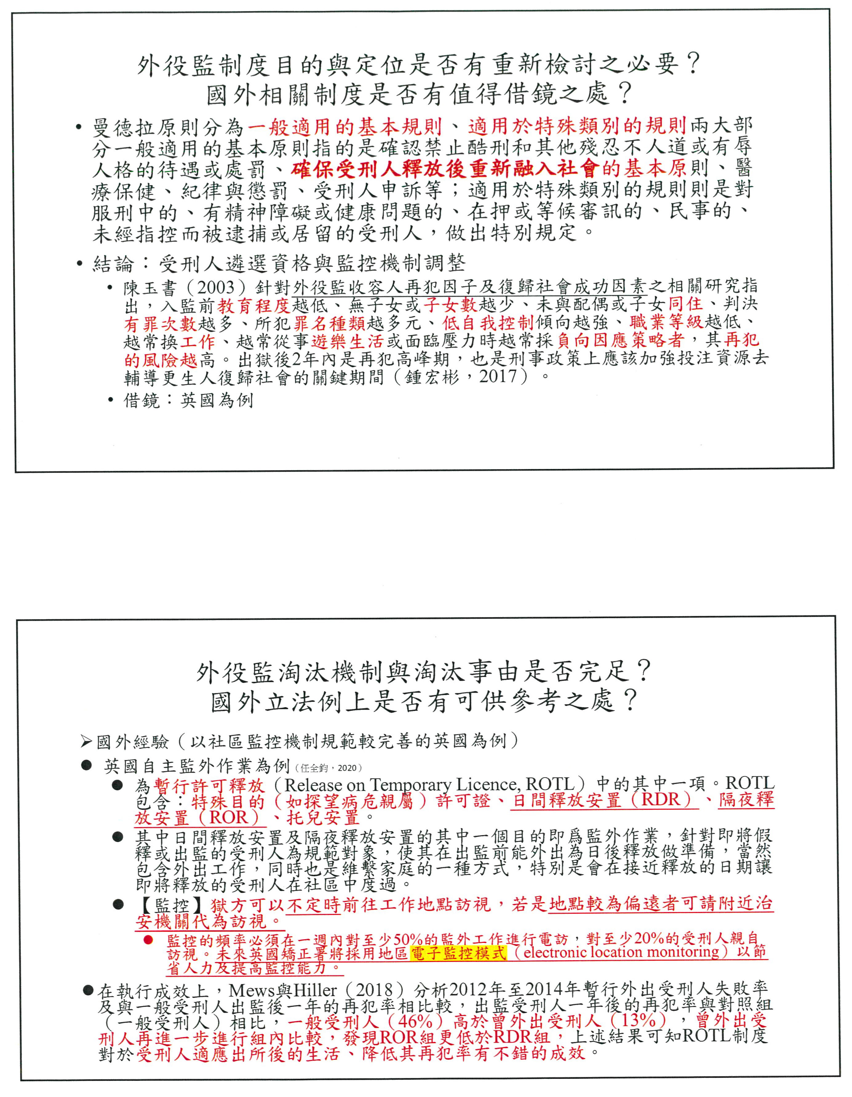 另外參考日本和韓國,對於受刑人外出、返家等有設置委員會或處遇委員會進行審查,透過相關的專業與面談等方式觀察受刑人的狀況,是我們這次修法值得借鏡之處,受刑人遴選到外役監是一回事,而我們准許他返家探視的那個機制又是另外一回事,時代力量的草案版本第四條之一,或許這部分有參考的空間。
