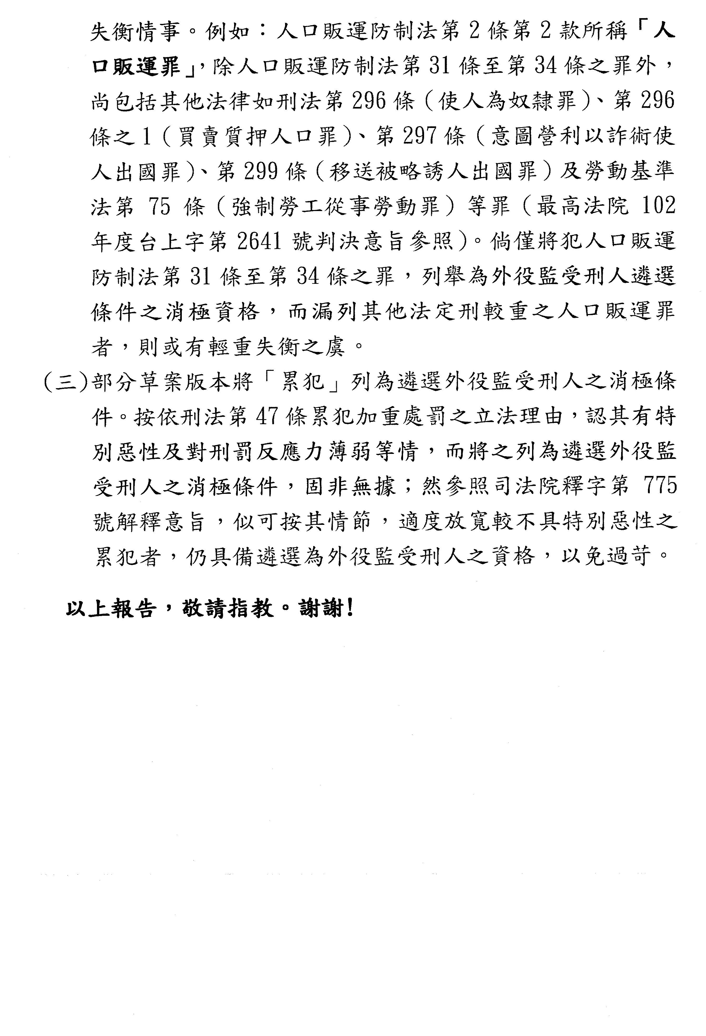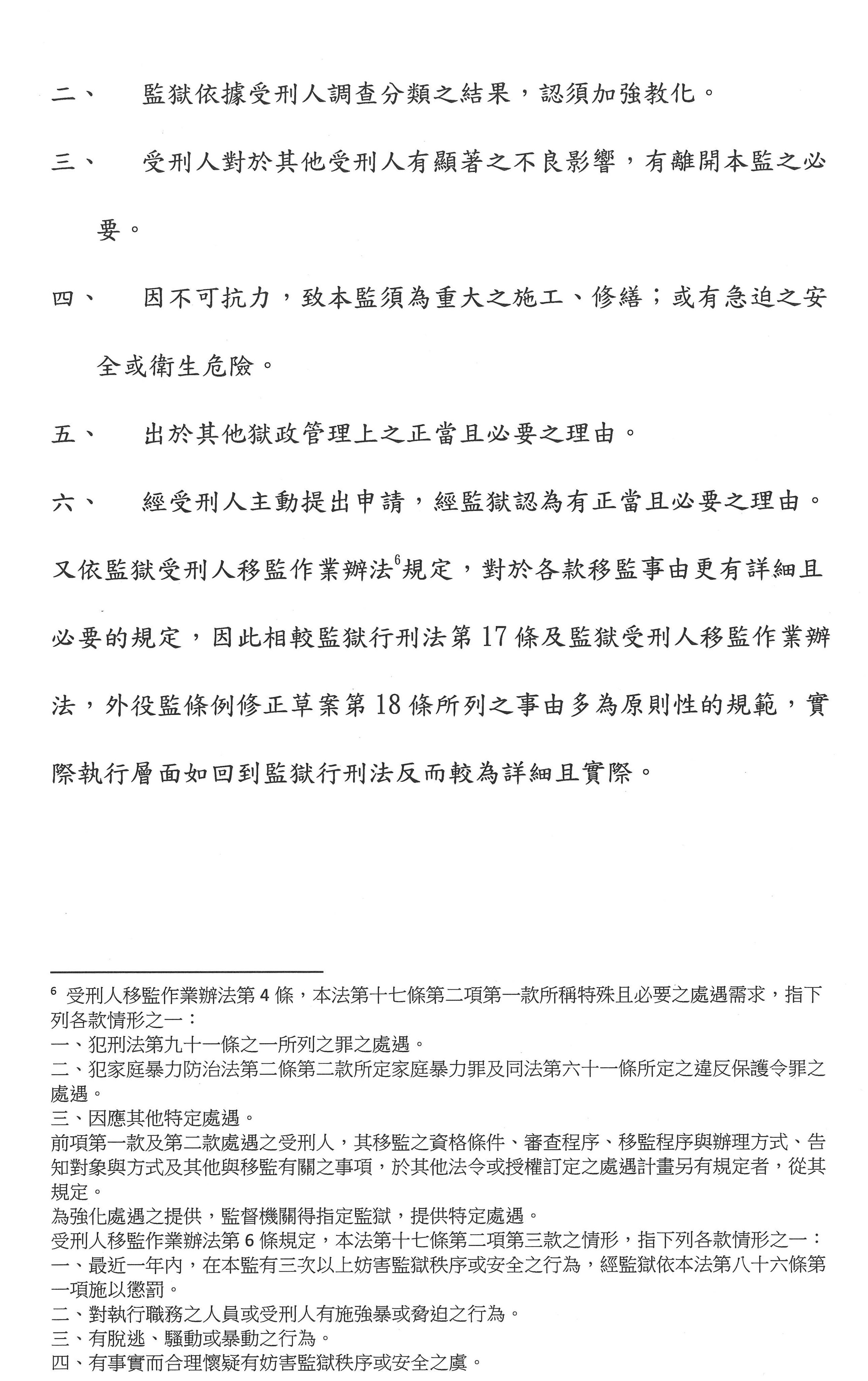 第三個,我們有沒有淘汰機制?如果他到外役監有重大違規的話,列入淘汰的事由。有關外役監條例第十八條的修正案,本來是違反外役監安全、秩序或有其他重大事由,我們又加了違反返家探視情節重大、受傷或罹病,加起來四款。但是我們不如回到監獄行刑法第十七條第二項,它有一到六款,裡面就提到有一些是移監的,或者是一些必要的處遇需求,必須強調教化,甚至他如果在外役監或任何監獄違規的時候,可以把他移到別的監獄。所以我們有沒有必要列這個在外役監條例?因為其實監獄行刑法第十七條就有相關規定,這個是我們可以思考的。