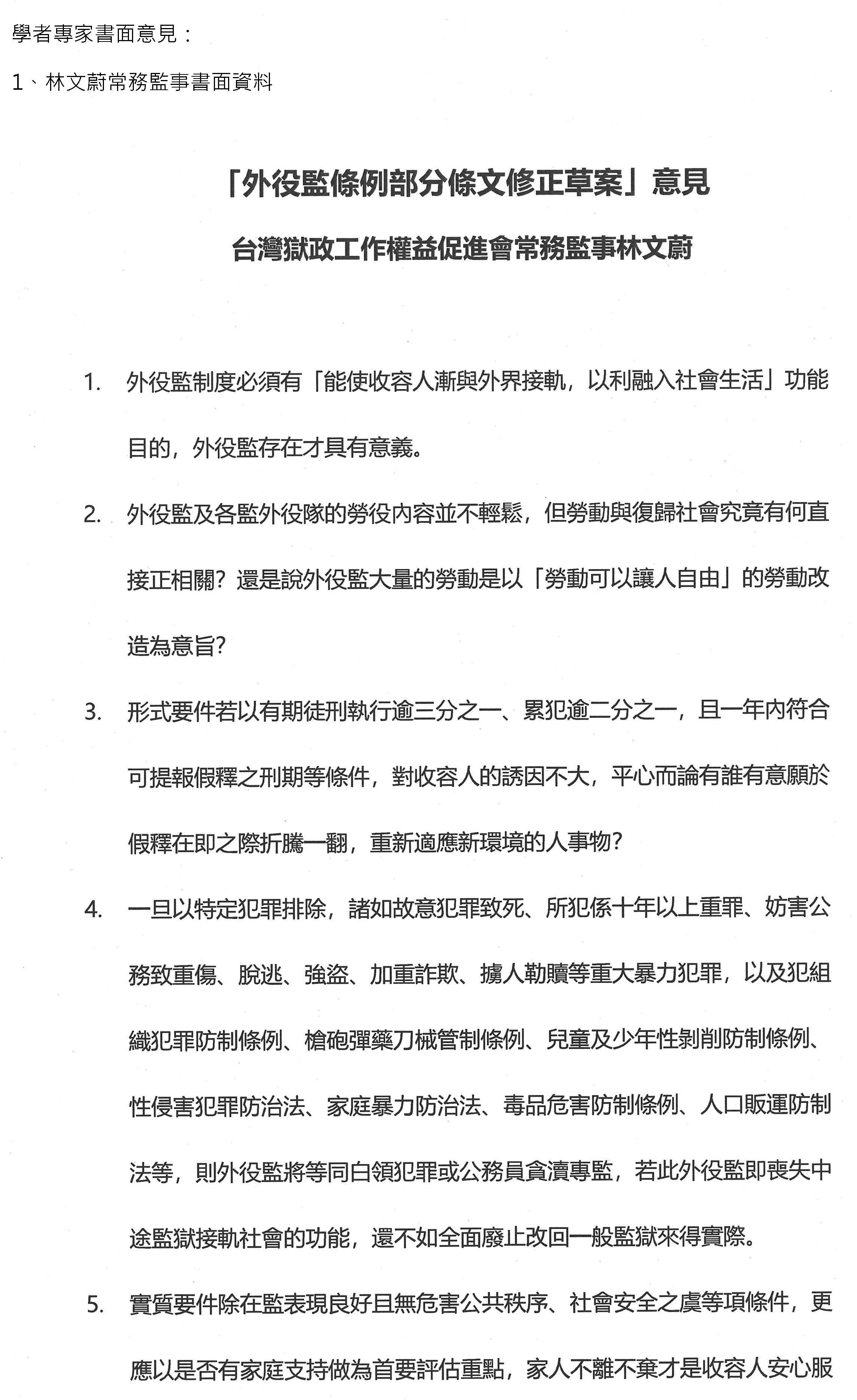 接著請台灣獄政工作權益促進會林文蔚常務監事發言。