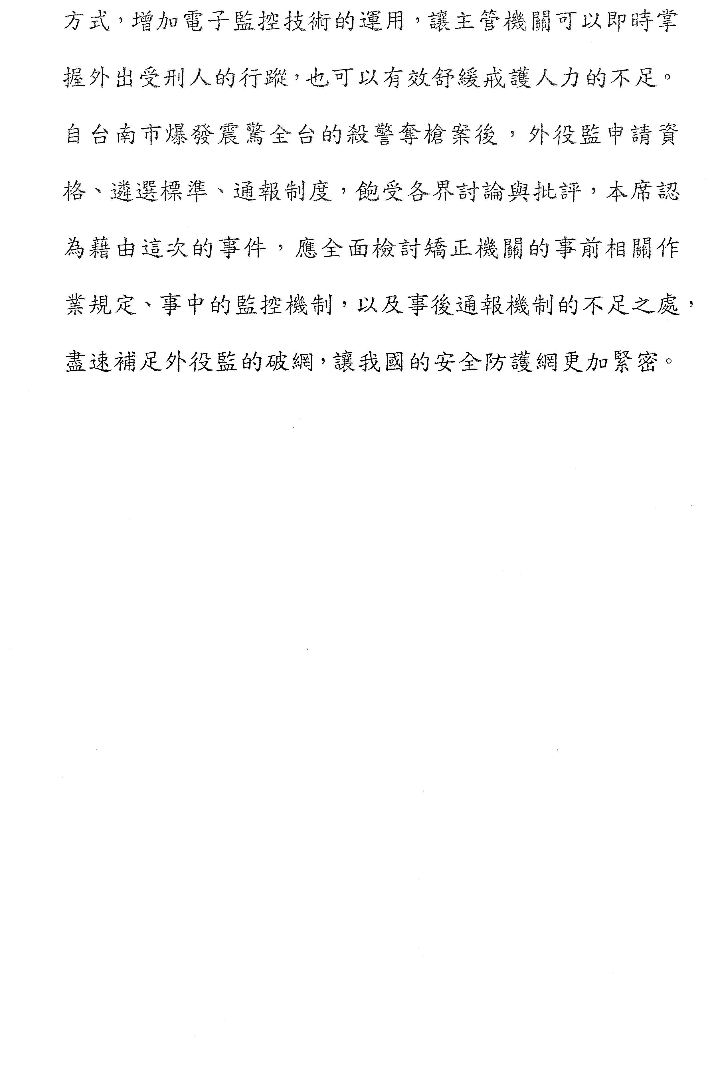從制度面上,我們應不應該放寬遴選標準、遴選標準如何透明化,以及管理面如何增加戒護人力與防止脫逃設備,我們都必須考量,甚至有沒有建立多方即時通報機制,這些都屬於管理面。我們回歸到社會面,包括有無落實到受刑人輔導的處遇,加強受刑人與家庭、社區的聯繫關係等等。簡單講,從制度面、管理面及社會面都需要社會各界凝聚更高的共識,我們再來修法。