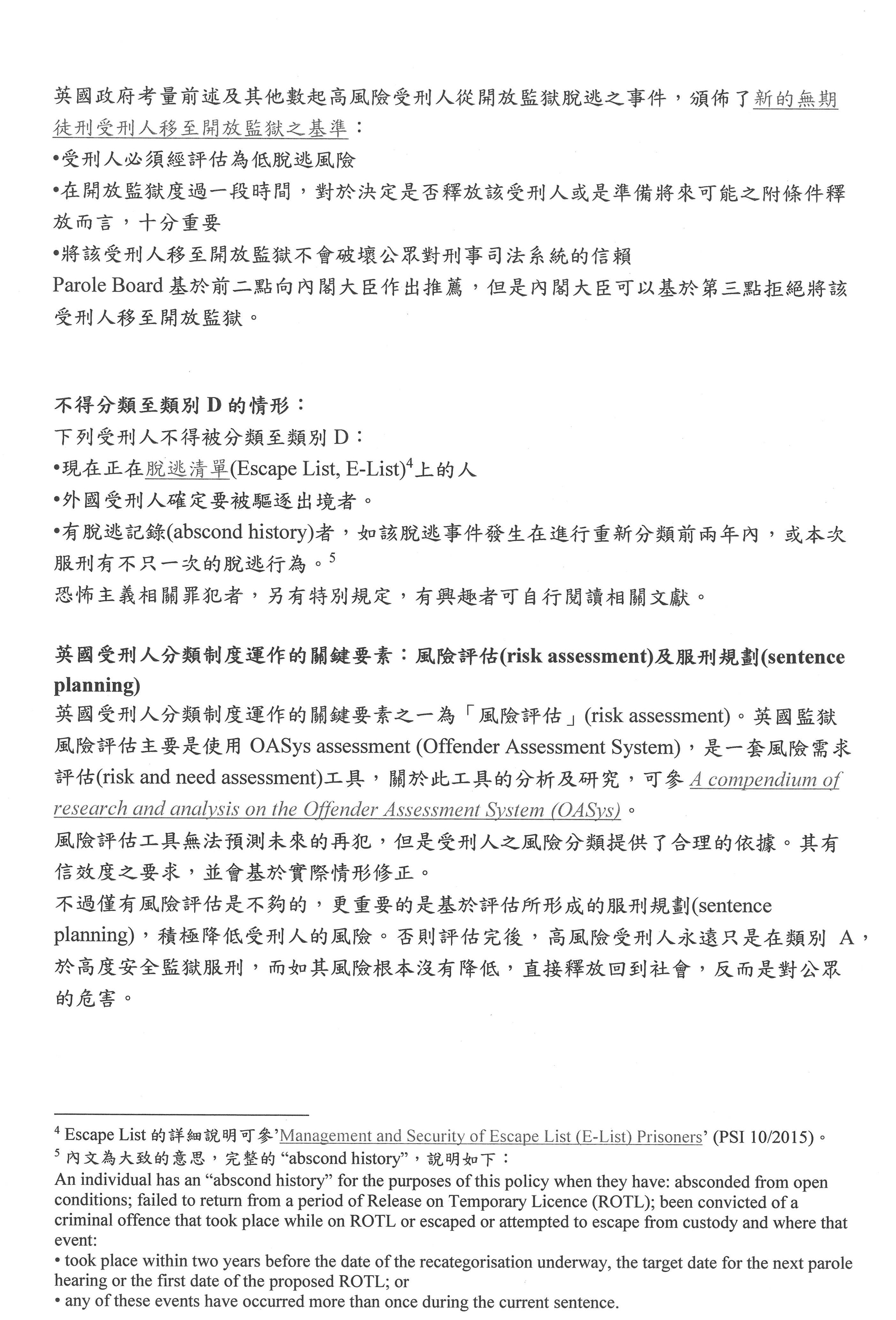 英國的作法是搭配開放監獄,開放監獄其實跟臺灣的外役監相近,基本上就是受刑人處於低度戒護狀態,可能開放監獄本身就設置有一些工廠,或者他可以外出工作,搭配所謂的開放監獄,其實是有受刑人分類制度。他們是分成A、B、C、D四類,D類受刑人是可以移到所謂的open condition的地方,像是開放式監獄或接近臺灣的外役監,或者他們也可以日間外出,所以我在這邊先介紹英國的分類作法。