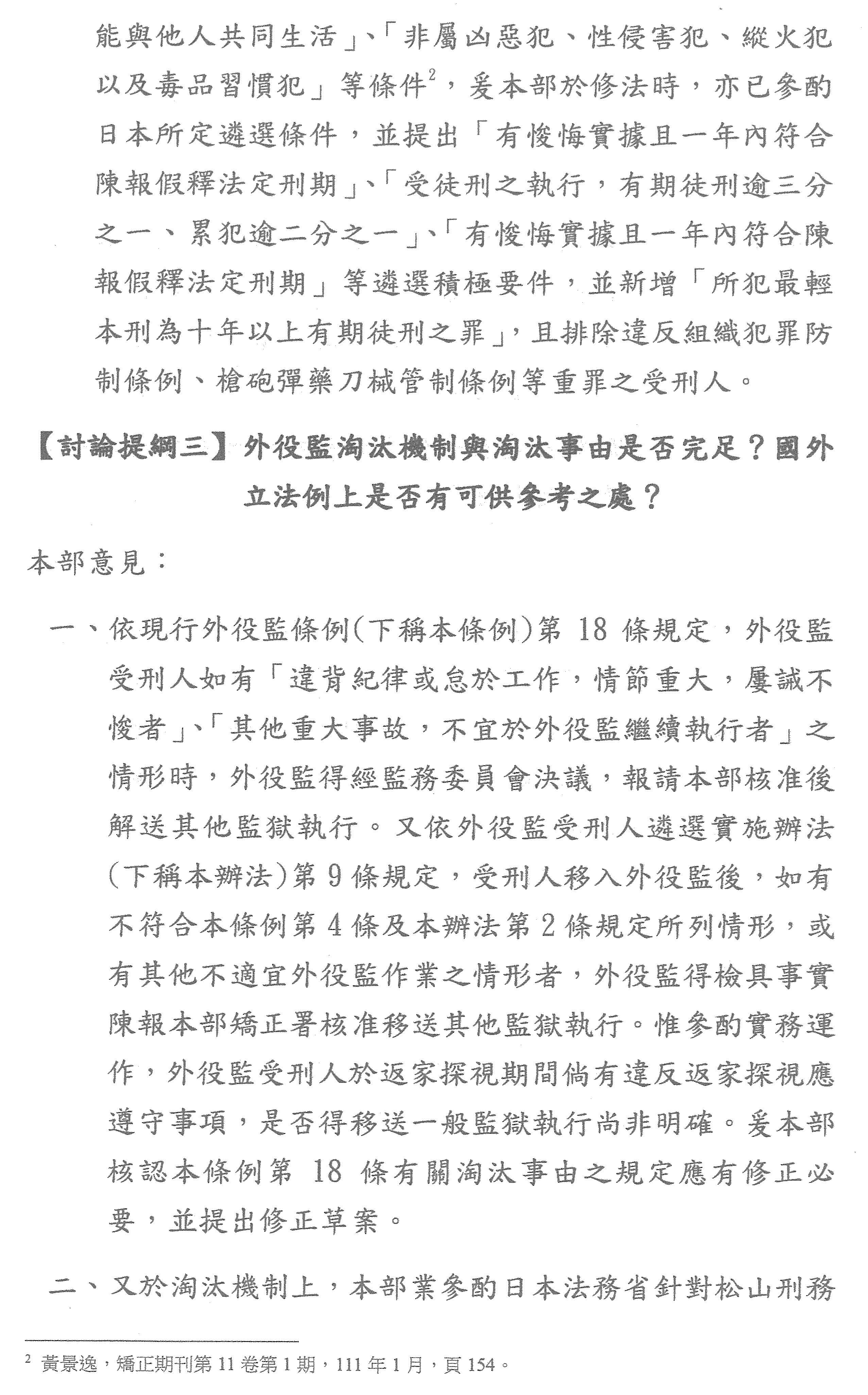 當然各位委員跟各位老師都有提到外役監第二個議題,有關外役監的遴選辦法、返家探視的辦法,其中也有為人詬病的地方,事實上法務部也同步對這兩個辦法,在部長的召集之下提出了內部的構想,當然這要配合母法通過以後,子法一併處理,朝向透明化、公開化並避免脫逃、避免濫用來處理,這一點我們是同步進行。