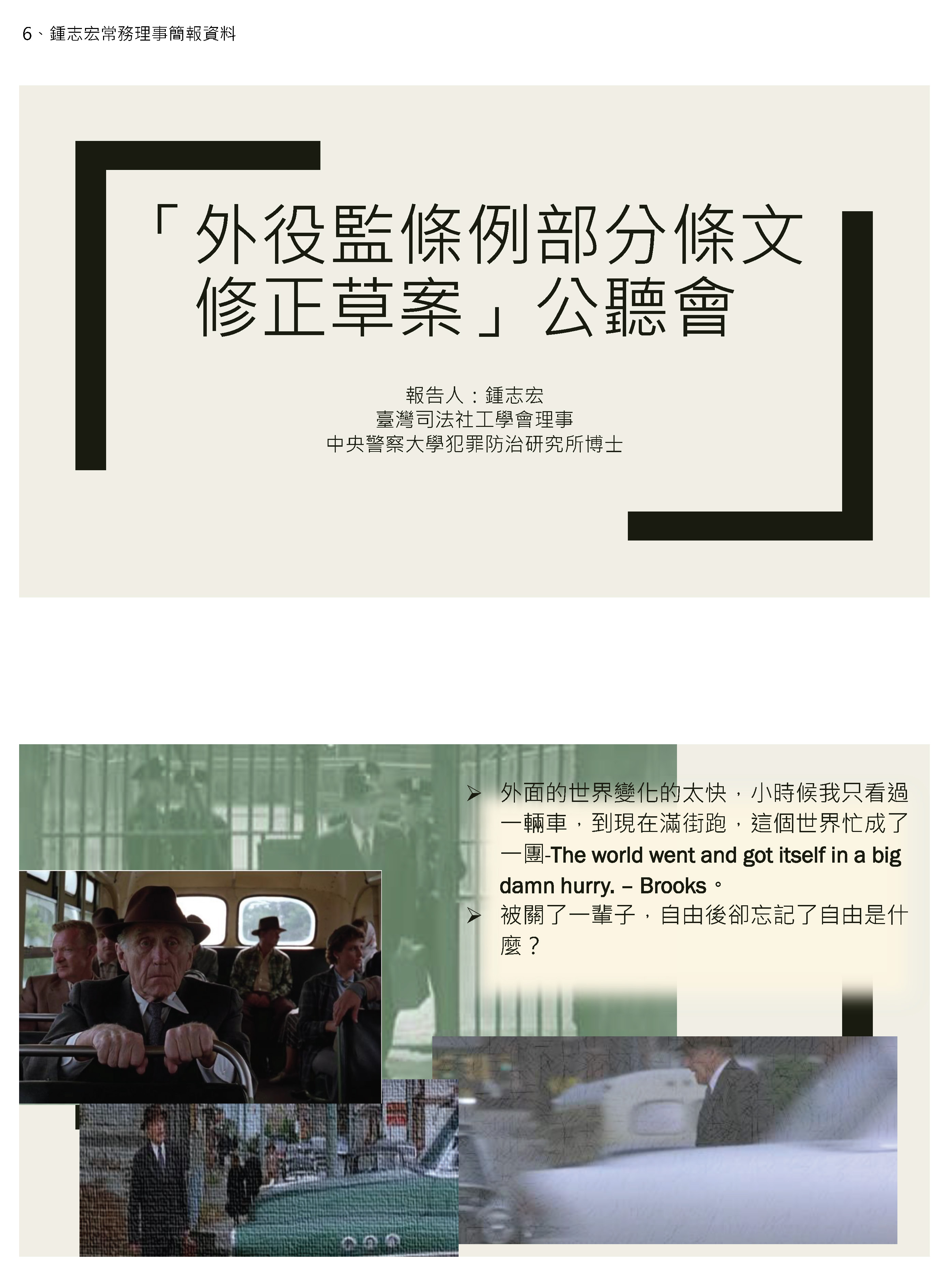 鍾志宏常務理事:主席、各位與會學者專家、先進,大家好。我是臺灣司法社工學會理事鍾志宏,今天就外役監條例部分條文修正草案的議題進行一些分享,各位看簡報上面的主角叫老布,他是一個在長期監禁之後假釋要回到社區的更生人,當他邁出監獄的時候,他發現這個世界跟他想像的不太一樣,他說:外面的世界變化太快了,小時候我只看過一輛車,到現在的滿街跑,這個世界忙成了一團。他被關了一輩子,也渴望自由,可是他自由之後卻忘記自由是什麼。各位看到照片上,他搭公車、過馬路,對我們來說再稀鬆平常不過的事情,對他卻充滿了茫然與恐懼。
