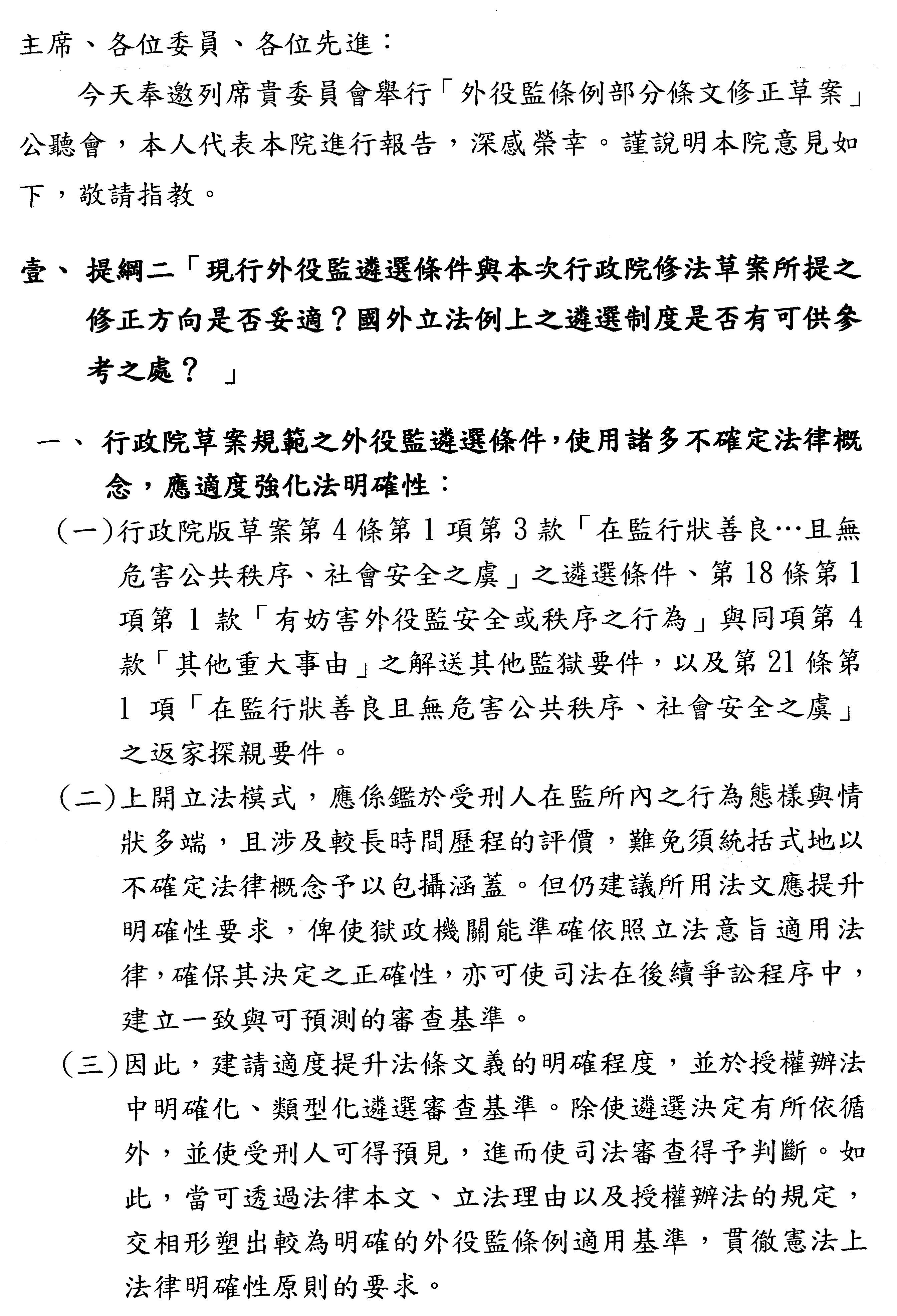 陳彥霖法官:主席、各位委員先進好,以下簡要進行本次的發言,首先是針對草案的外役監遴選條件,草案使用很多不確定的法律概念,本院建議可以適度強化法明確性,譬如行政院版草案第四條第一項第三款,使用「在監行狀善良,無危害公共社會秩序、社會安全之虞」的遴選條件,還有第十八條第一項第一款「有妨害外役監安全或秩序的行為」,然後還有第二十一條也是使用「在監行狀善良」的文字,這些立法模式可以瞭解到是考量受刑人在監所的行為態樣、情狀比較多種,而且涉及比較長時間歷程的評價,難免必須要統括式的涵蓋,但是我們還是建議應該要提升一定的明確性要求,使獄政機關可以準確的依照立法意旨來確保其決定的正確性,也可以使司法在後續的爭訟程序中,建立比較一致和可預測的審查基準。因此,除了法條文意的明確程度之外,我們也建議在授權辦法中要明確化和類型化遴選的審查基準,可以使遴選決定在決定的過程中有所依循,也使受刑人可以預見,最後也使司法審查可以比較明確的判斷。這樣的比較明確的外役監條例適用基準,比較會符合憲法上明確性的要求。