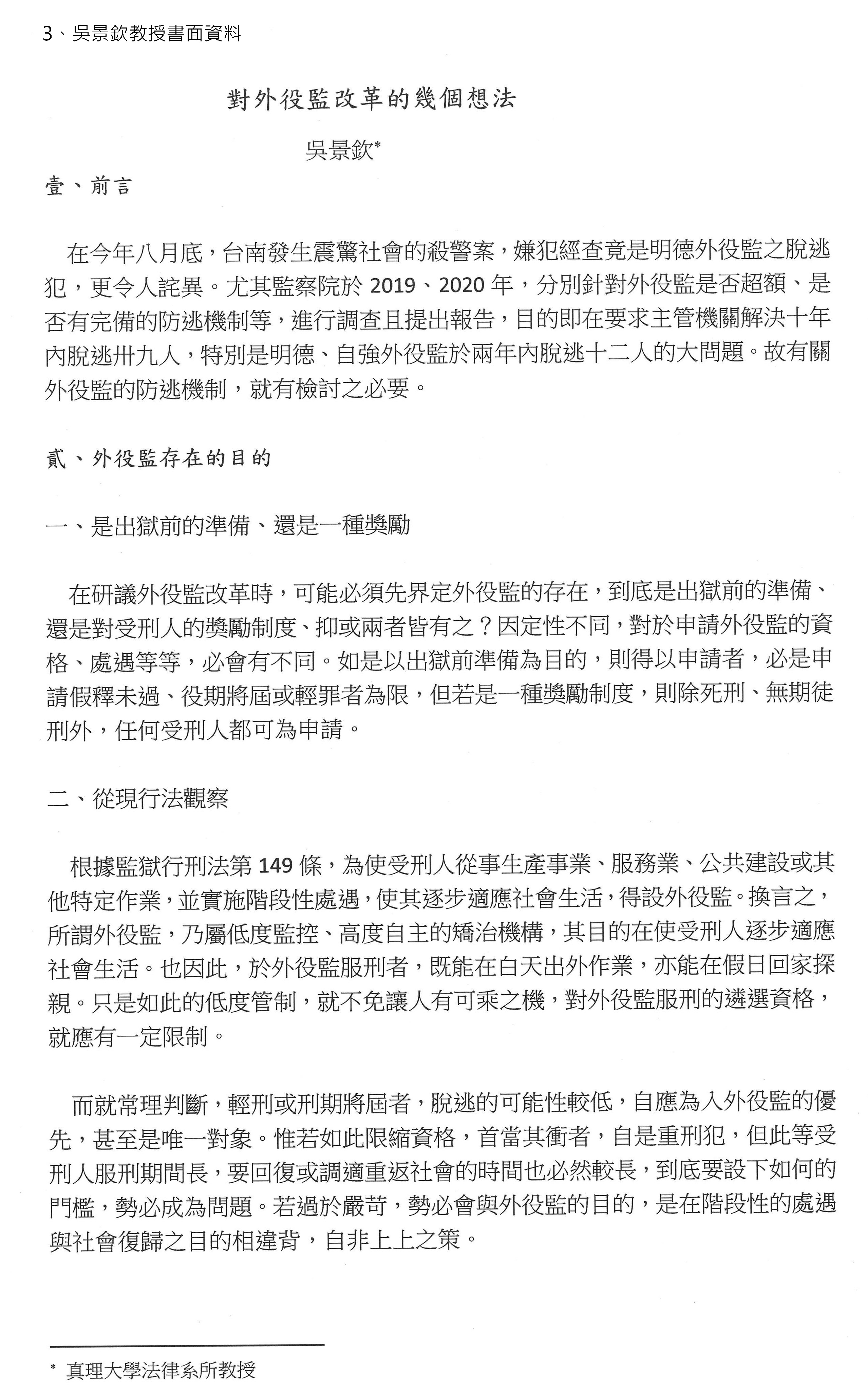 吳景欽教授:各位大家好。關於外役監,剛才主席也有提到,在今年臺南殺警案還沒發生之前,我印象中也認為會進入外役監的好像是貪瀆的犯罪或經濟犯罪,可是在這次發生以後,我去查一下,事實上殺警案的被告有強盜等前科,被判了8年幾個月,所以他不是我印象中可以進外役監的人。後來去查一下外役監條例,我才嚇了一跳,有關可以申請外役監的受刑人門檻,這一條修得還滿頻繁的,事實上從2014年就一直不斷地在放寬,2020年也再放寬一次,所以我們現在又再回來思考外役監條例要怎麼修的時候,可能要先定性一下,就是今天提綱的第一個問題,外役監存在的目的到底為何?