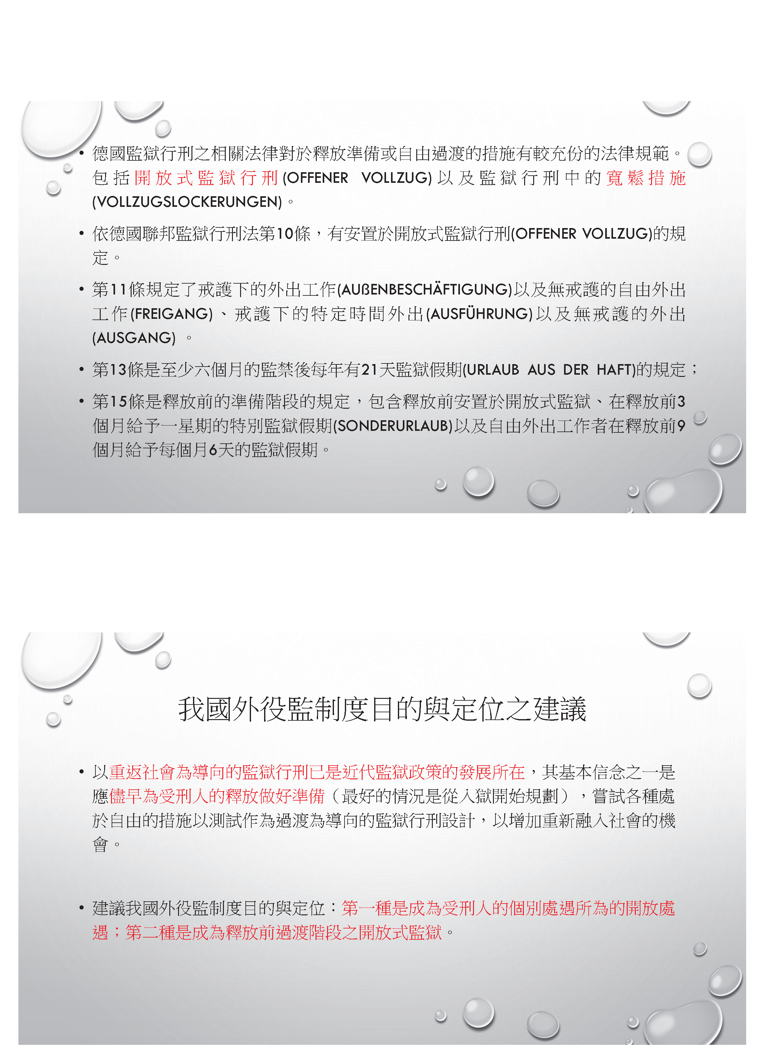 盧映潔教授:各位早安!我今天做了PowerPoint,首先有關提綱,因為我本身是留德的背景,所以今天會跟各位說明比較多我蒐集到的有關德國的相關資料。外役監制度的目的和定位,大家可以看到歐洲的監獄規則,其中提到監獄應該提供各類型的「監獄假期」,其實就是一些開放措施,然後在準備的階段也有規定應該要提供逐步的過渡階段,並且結合有條件的釋放,就像我們的假釋,還有社會有效的支持,這是歐洲監獄規則。然後在聯合國2015年所謂的曼德拉規則也有提到這時候應該給予受刑人有過渡階段的設置,包括他從封閉式的監獄到開放式的監獄,或者給予相當的寬鬆措施。在德國法的部分,根據德國監獄行刑法規定,有採取封閉式監獄跟開放式監獄二種監獄類型;另外在他們的聯邦監獄行刑法第六十一條規定了各式的寬鬆措施,包括戒護下的外出工作,還有沒有戒護下的自由外出工作,還有戒護下的特定時間外出跟沒有戒護的日間外出;另外他們也有所謂的「監獄假期」,就是可以比較長期的外出等等制度。