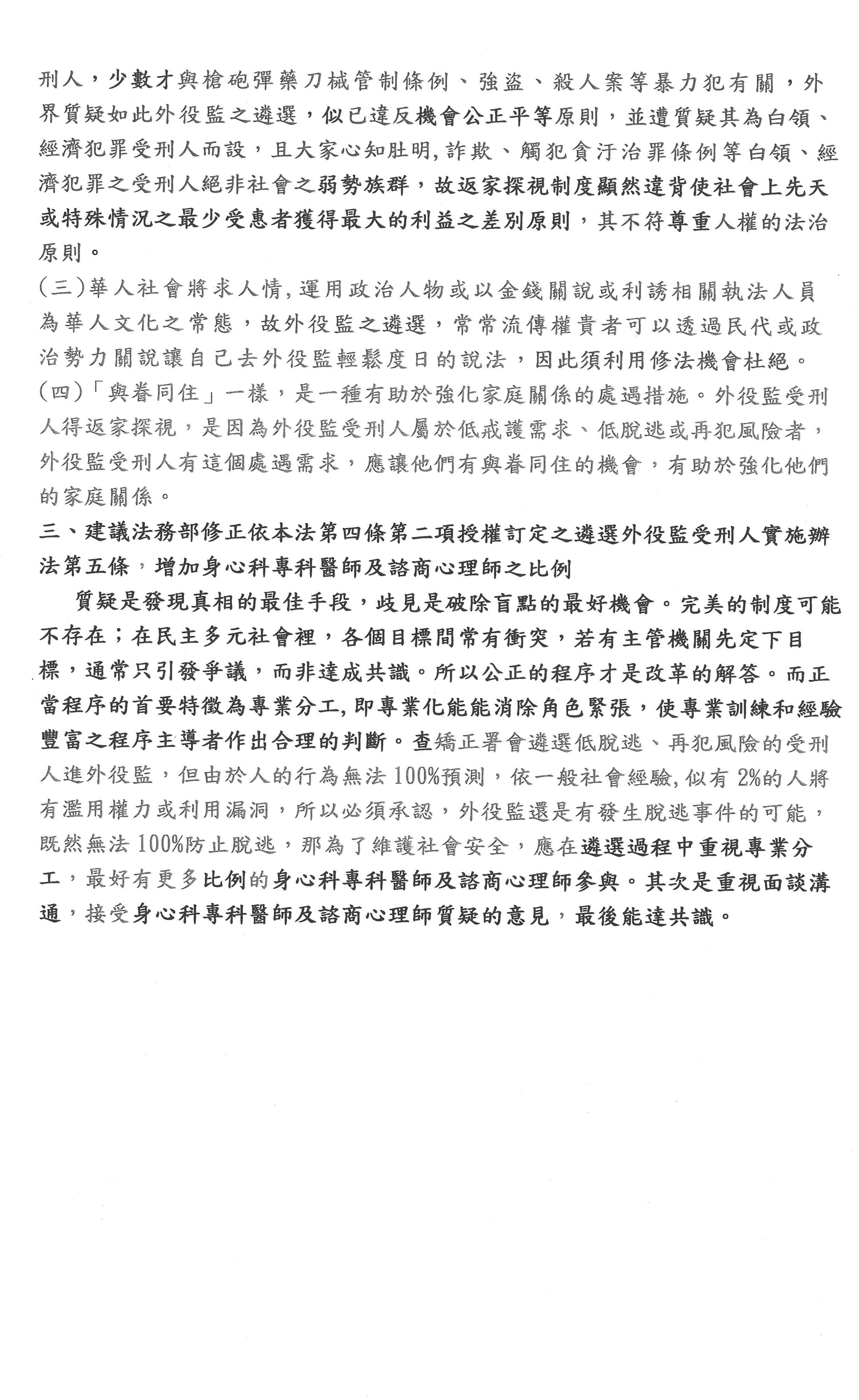 第三個問題,立法學上還有一個很重要的觀點,就是立法當然講求公正、公平,但是還有提到一個差別待遇,就是對人權尊重要有差別待遇。要尊重哪些人呢?即社會上先天或特殊情況之最少受惠者要獲得最大利益,譬如離島人民、原住民、身心障礙者、兒童、罕見疾病者等弱勢族群,我們給他們立法上的特別優惠。但今天我們討論的是外役監受刑人,他們的罪名大部分是詐欺、觸犯貪污治罪條例等白領階級、經濟犯罪者比較多,這些人並不是社會所認定的弱勢族群,假如是弱勢族群,依照對人權的尊重,我們給予差別待遇是應該的,但他們都是白領階級或經濟犯罪者,當然暴力犯並不多,所以外役監遴選制度就違反了機會公平原則,也違反人權尊重原則,對此我表示質疑,這部分應該改善。