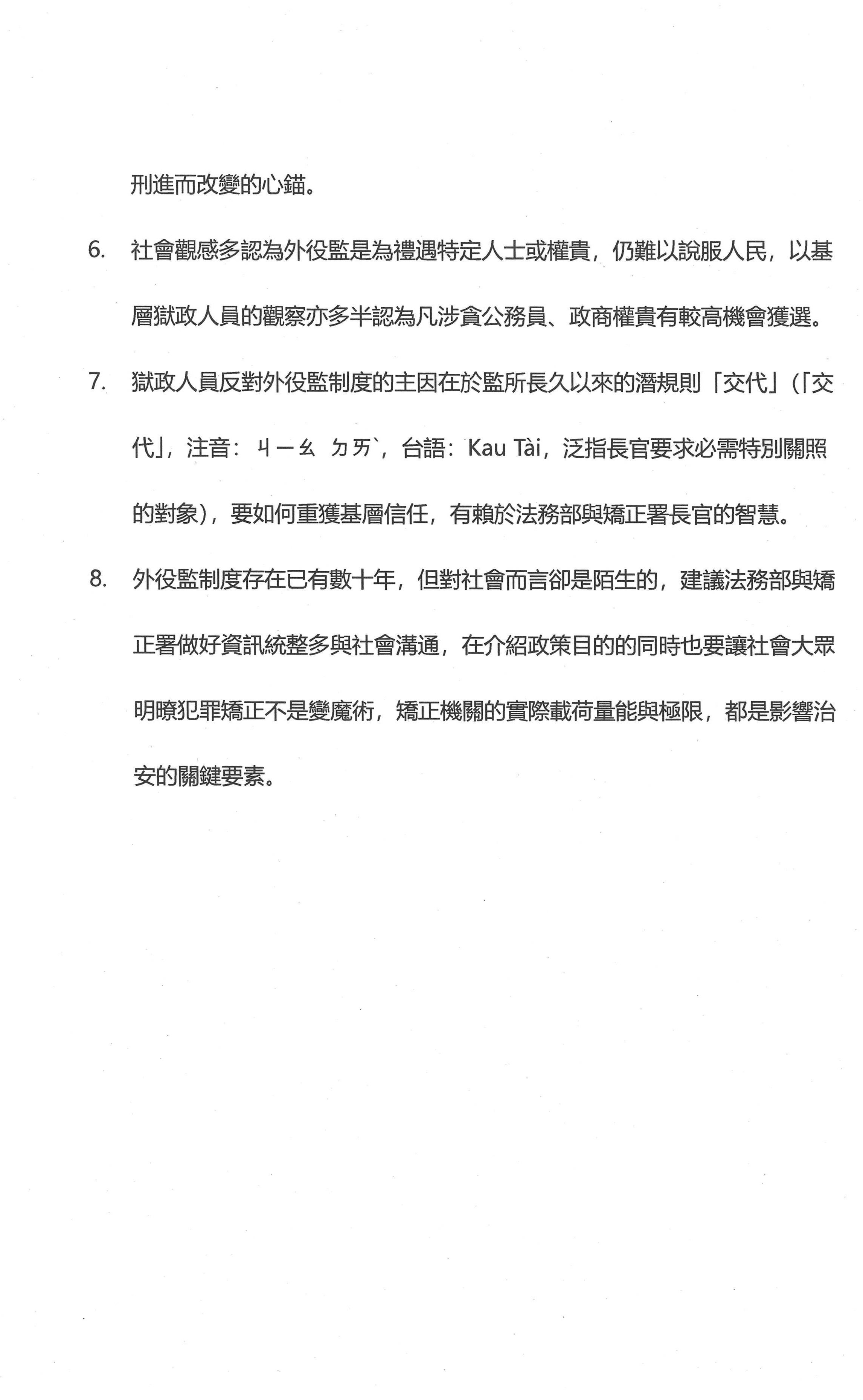 還有另外一個大家心知肚明的問題,就是華人社會講究人情,而有關中華文化的古書裡並沒有相關人權記載,所以我們是人情重於人權。人情大家都會運用,社會上的運用大概就是利用金錢、關說、利誘等等誘惑執法人員,這是我們社會文化的常態。針對這樣的社會常態,我們要特別注意,在外役監遴選時,難免也會有利用金錢利誘或政治人物關說的情形出現。「返家探視」的目的是為了強化受刑人家庭關係的一種處遇制度,我認為可以以「與眷同住」替代,所以建議應該把「返家探視」的制度刪除,設置民宿等來強化他的社會關係,也可以達到家庭功能的目的。所以這個目的是有替代方案,這部分就要由監所、矯正署去研究。