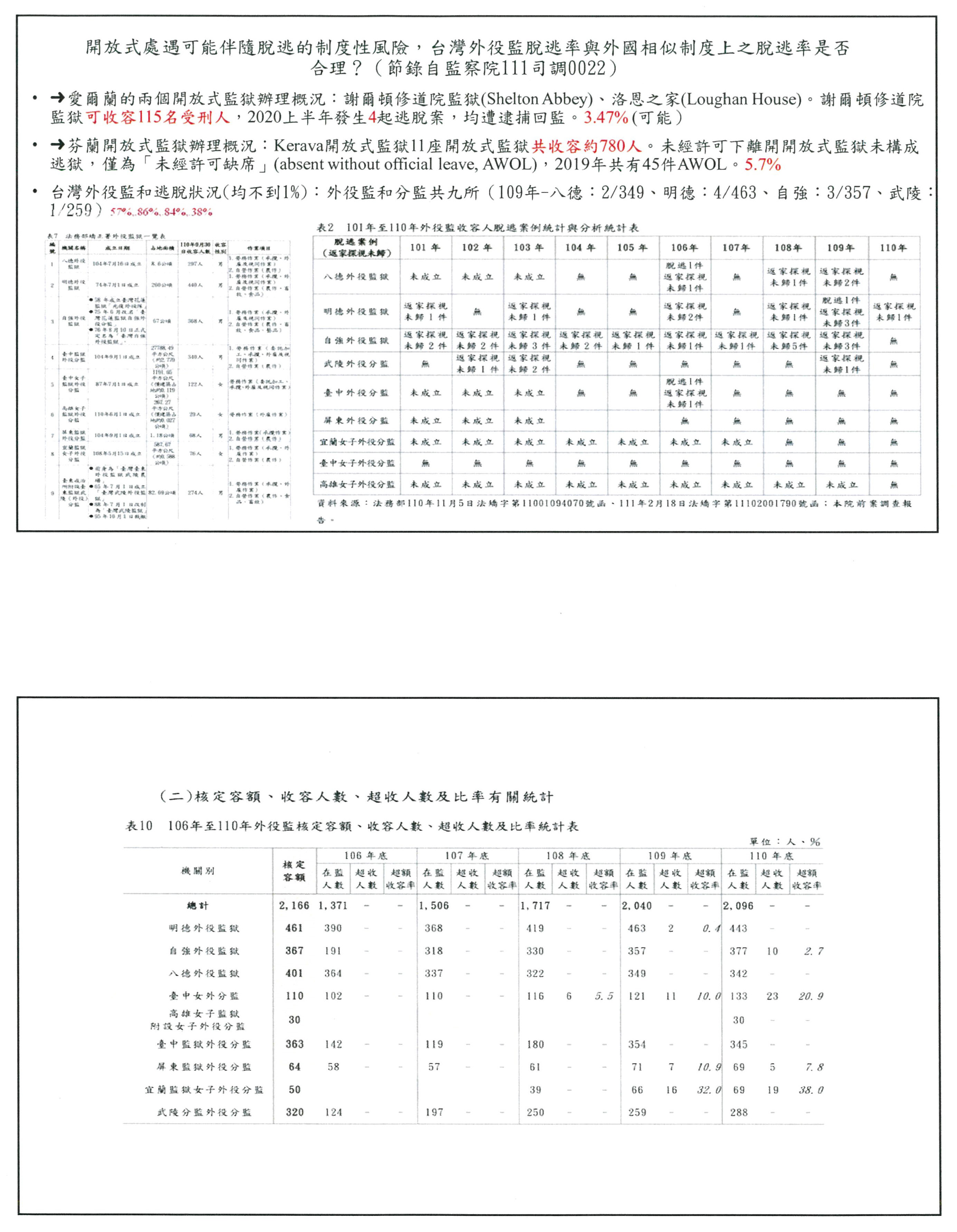 再來我要提到的是提綱五,跟大家說明一下,我查到德國的資料,德國Bremen市的開放式監獄在2009年到2012年,平均每年有20次的脫逃或濫用紀錄,占所有受刑人的0.05%。以開放式監獄受刑人總數衡量,1.9%的受刑人沒有自願返回監獄,其中有25件涉及會再次犯罪,占0.02%比率。