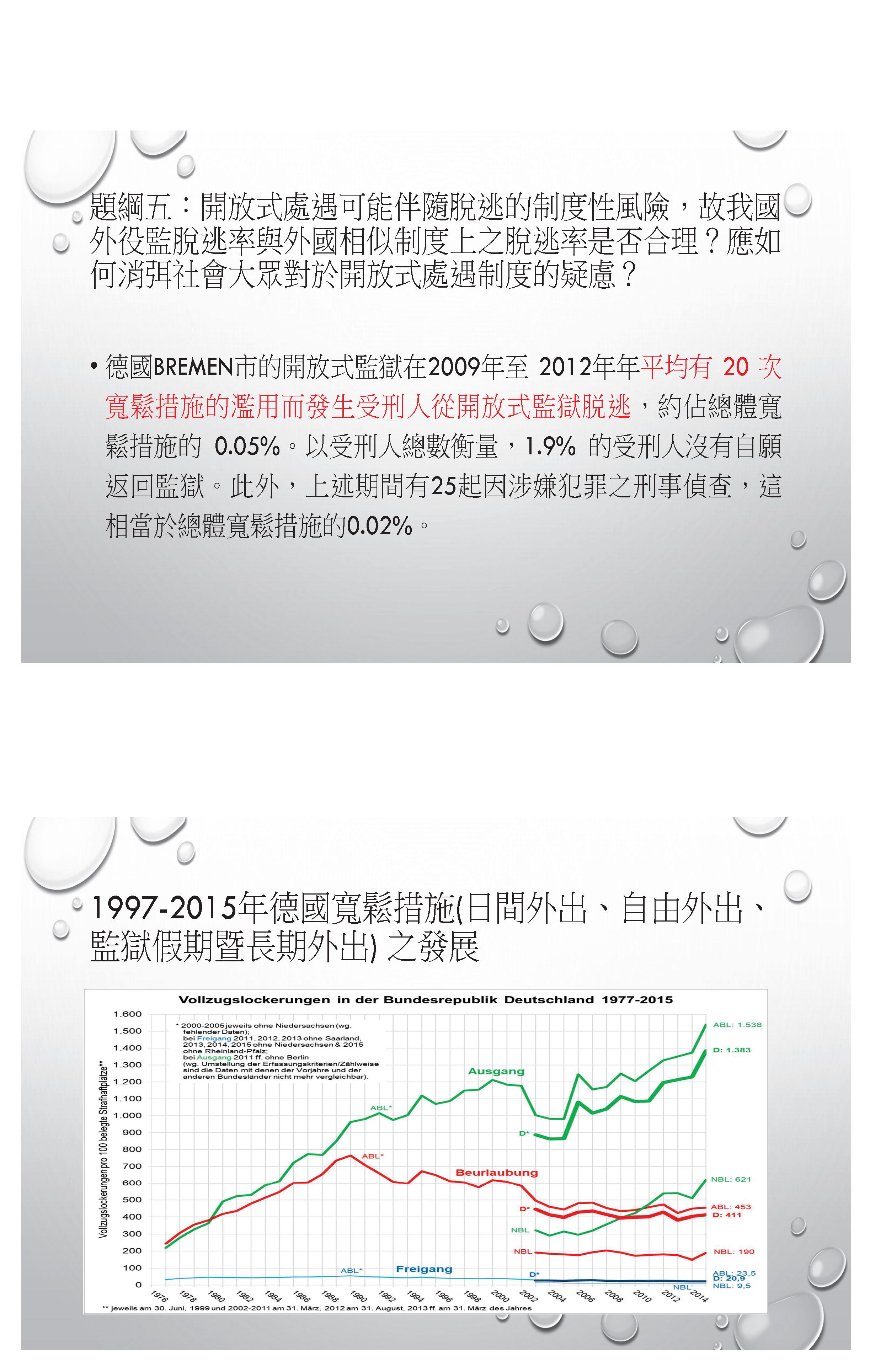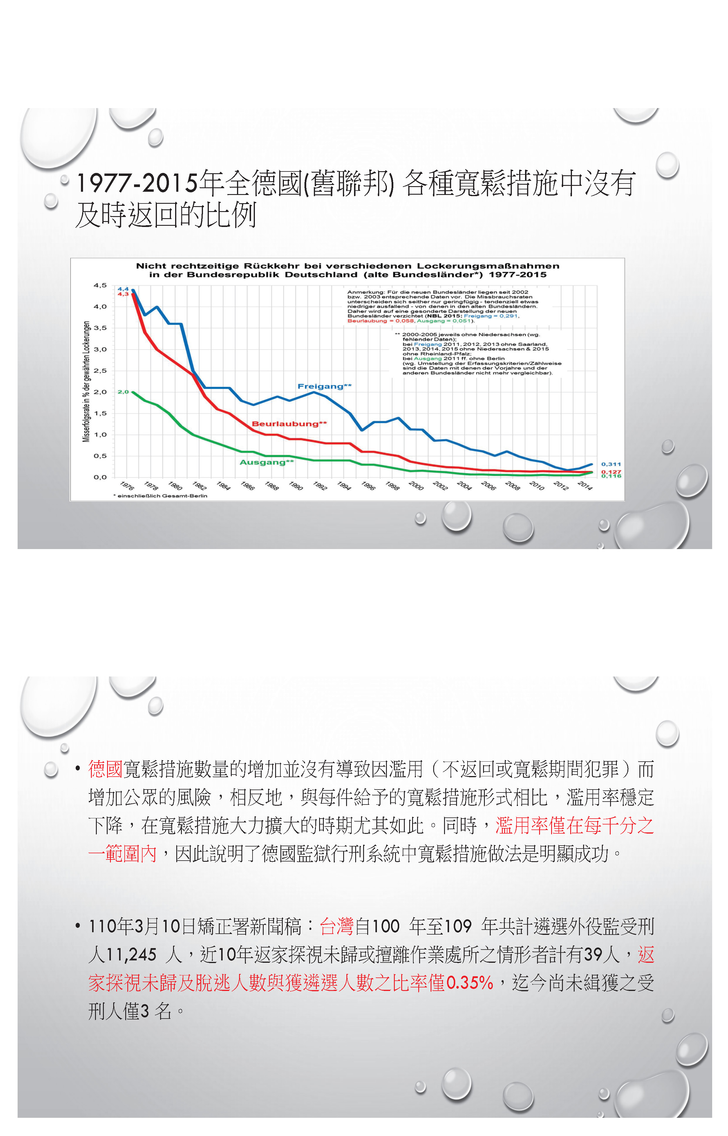 再來,這裡有兩張圖是跟大家說明我找到的統計數字,是有關德國給予所謂日間外出、自由外出以及長期外出的一些數據發展,大家可以看到,綠線的部分是日間外出,紅線的是所謂的監獄假期,就是比較長期可以外出,然後藍線是可以外出工作,也是比較長期的,我們可以看到他們的數據其實是一直成長的,而他們的濫用比率,可以看出來是一直下降,所以在德國會認為實施開放式監獄或寬鬆措施的數量增加,並沒有導致增加濫用的風險,濫用率僅在千分之一範圍內,所以他們認為開放式監獄跟寬鬆措施其實是成功的。