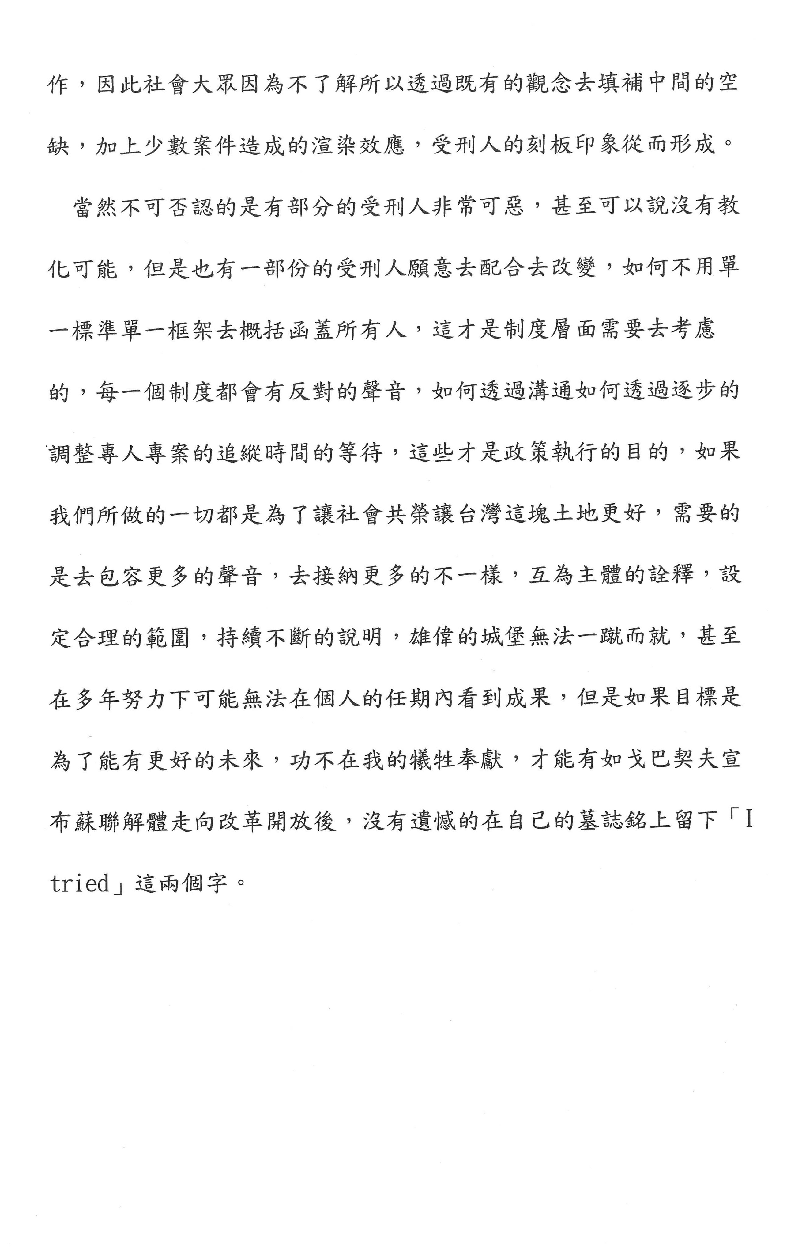我覺得還是要回到剝奪自由,就是自由刑與監禁的本質,希望大家能夠透視刑罰的意義,我覺得自由刑之後要接教育刑還有很多努力的空間。我在這裡真的非常地呼籲大家認真地去思考,讓一個犯罪的人回到社會的時候不是我們社會的危險,而是我們社會的一分子,這才是降低社會危險唯一可能的方式,絕對、絕對不是讓他一直成為我們一直預期他的壞人,這個是不行的。我們的矯正系統其實是可以工作的,人在監獄裡,我們可以做很多事,我們可以讓他出去後能夠回來我們的社會,這其實是非常困難的。刑罰結束以後,並不是就結束了,還有很多、很多事情要做,所以真的呼籲大家可以比較審慎地再去考慮,謝謝。