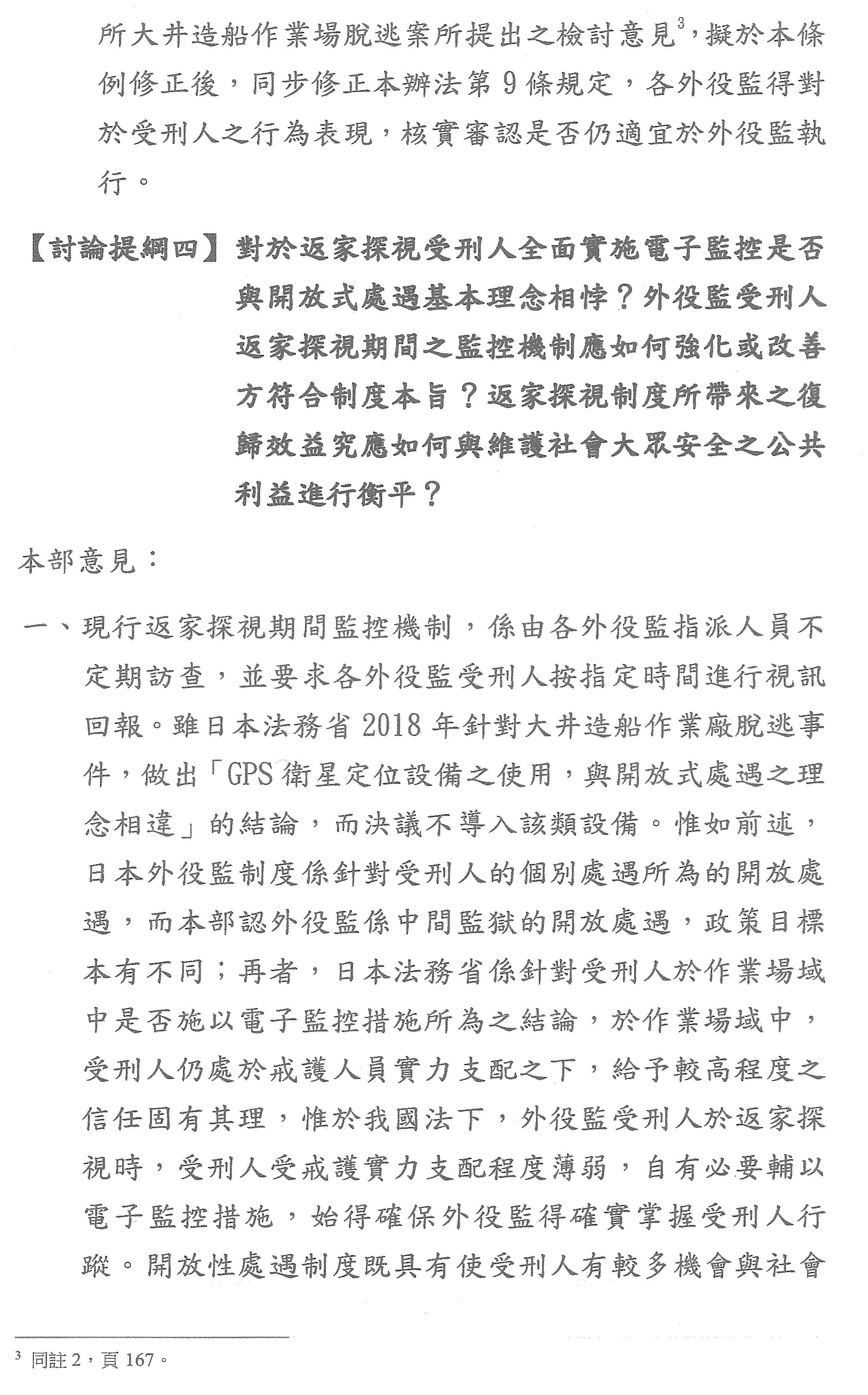 再來是提綱四的部分,日本法上對於受刑人外出外泊的情形有提供位置把握裝置,有點像是GPS以瞭解他們在哪個地方。日本的開放設施裡面,網走刑務所開放農場的受刑人在外工作時也有裝置GPS。外出外泊的部分是因應其必要性,而且他們必須向受刑人說明要放置GPS,獲得他的同意;如果沒能獲得同意,就不允許外出。不過這樣的作法其實受到日本辯護士協會的批評,所以如果要考慮參考這個制度,也要注意到有可能遭受批評。
