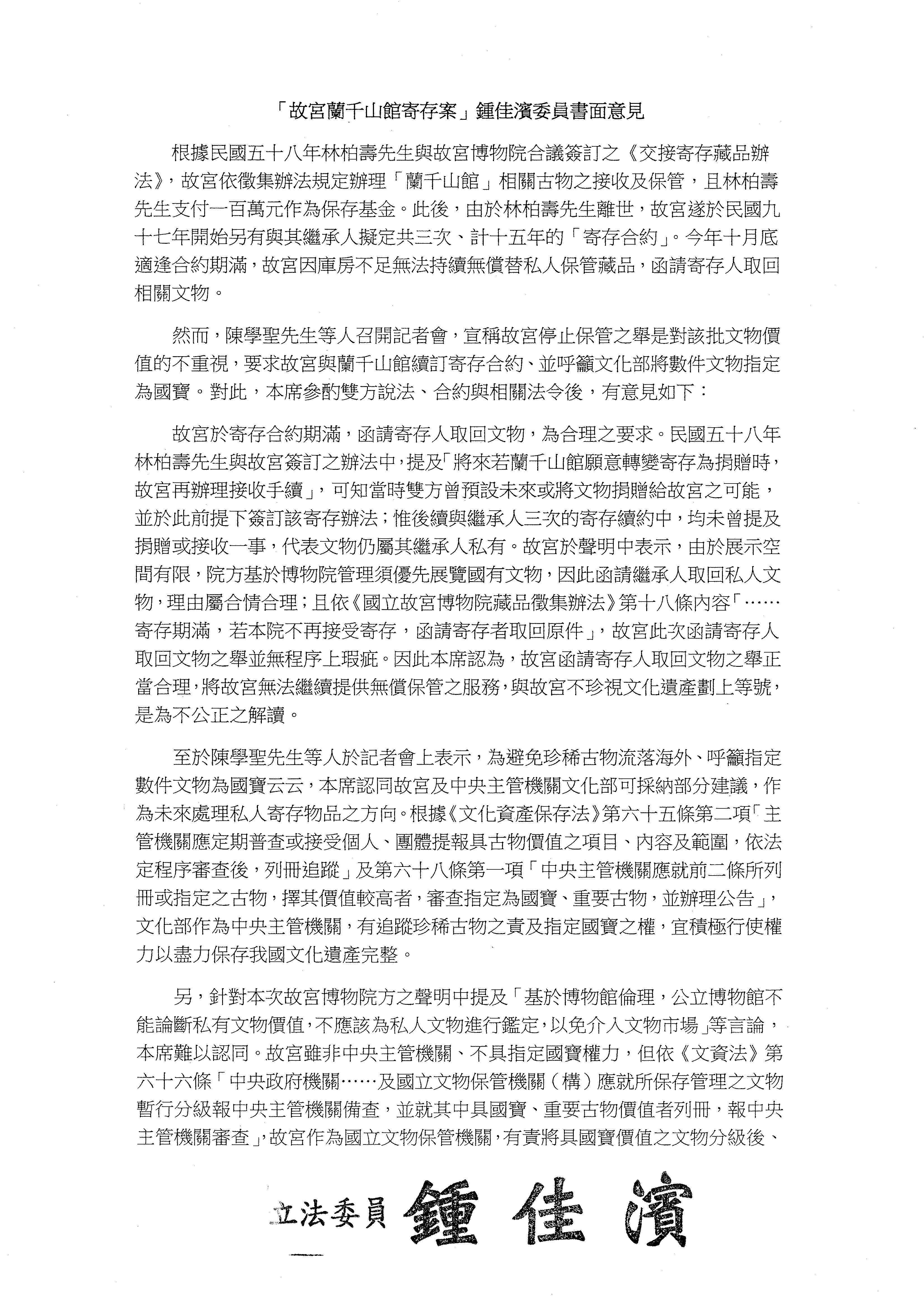 我很感謝剛剛文化部文資局講得非常好,面對這些像褚遂良的蘭亭、懷素的千字文,你應該趕快把它指定,這是你的職掌,甚至如果只列為國寶,不僅它不會離開臺灣,而且依照文資法第七十二條,我沒說錯吧!政府還有責任要出錢補助它、維護它,這才是故宮院長要做的事情,我們要補的是故宮沒有的東西,而蘭千山館所擁有的東西就是故宮所欠缺的,誠如我們故宮以前的同事、現在政大歷史系的助理教授劉宇珍所講的,蘭千山館的收藏是臺灣士紳的驕傲,少了蘭千的故宮將難在展覽中標舉其與臺灣的關係,那麼難得的文物,不希望毀在院長手中,可長可久的制度已經建立了,請院長好好遵循,以上,謝謝。