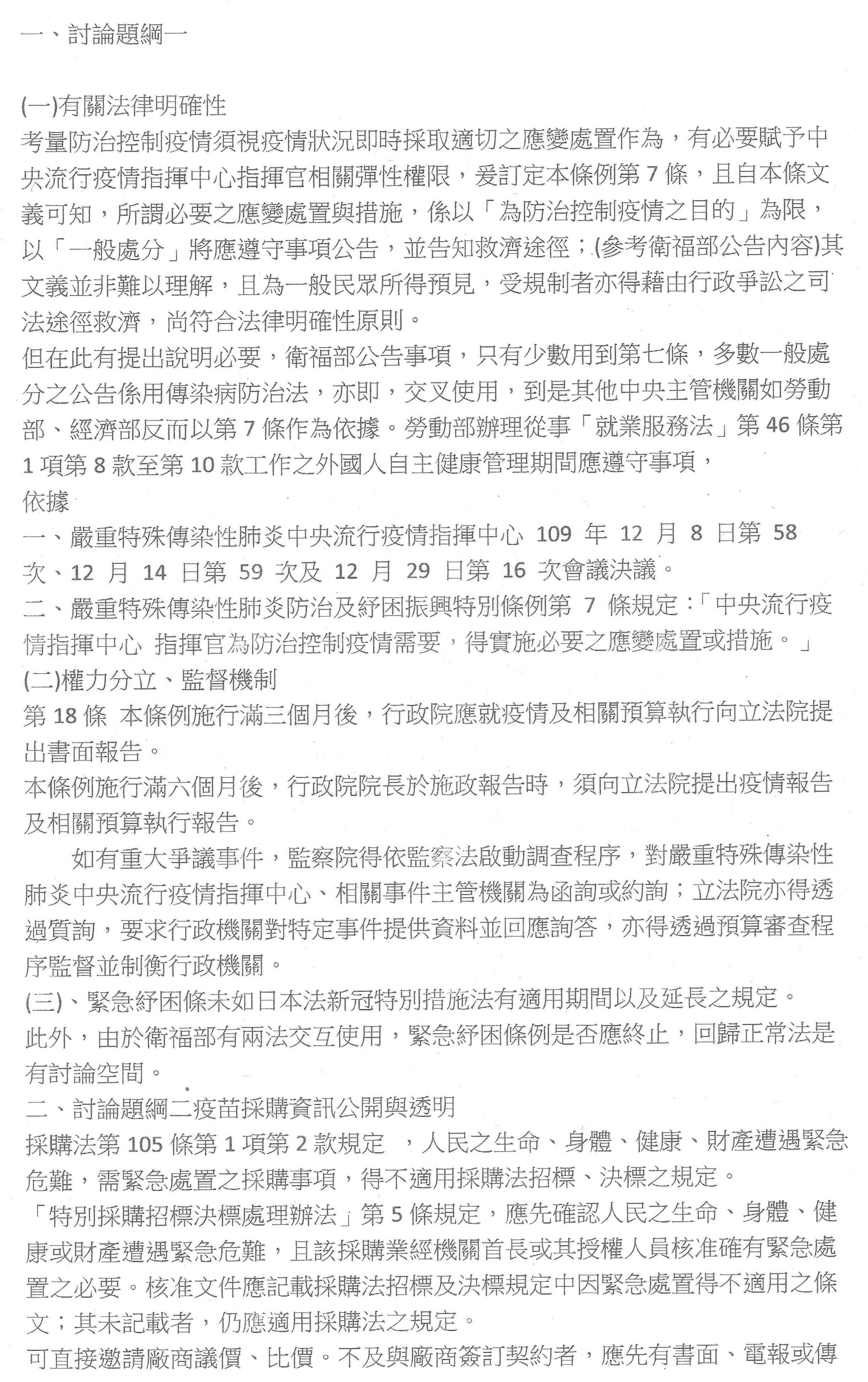 討論提綱一、嚴重特殊傳染性肺炎防治及紓困振興特別條例第7條所定「防治控制疫情需要」、「必要之應變處置或措施」是否有違法律明確性原則?本諸權力分立,監督與制衡機制之設計與界限為何?