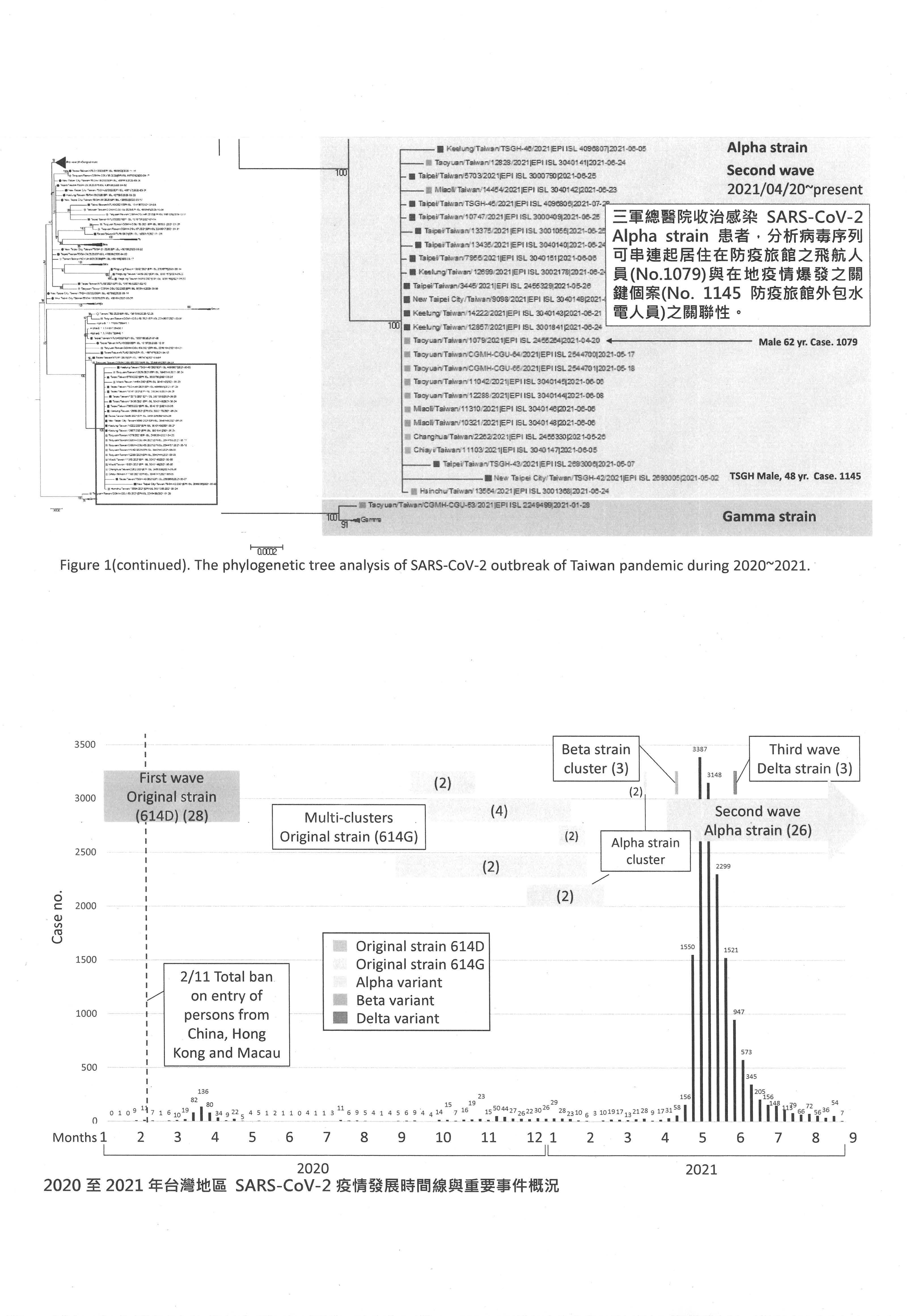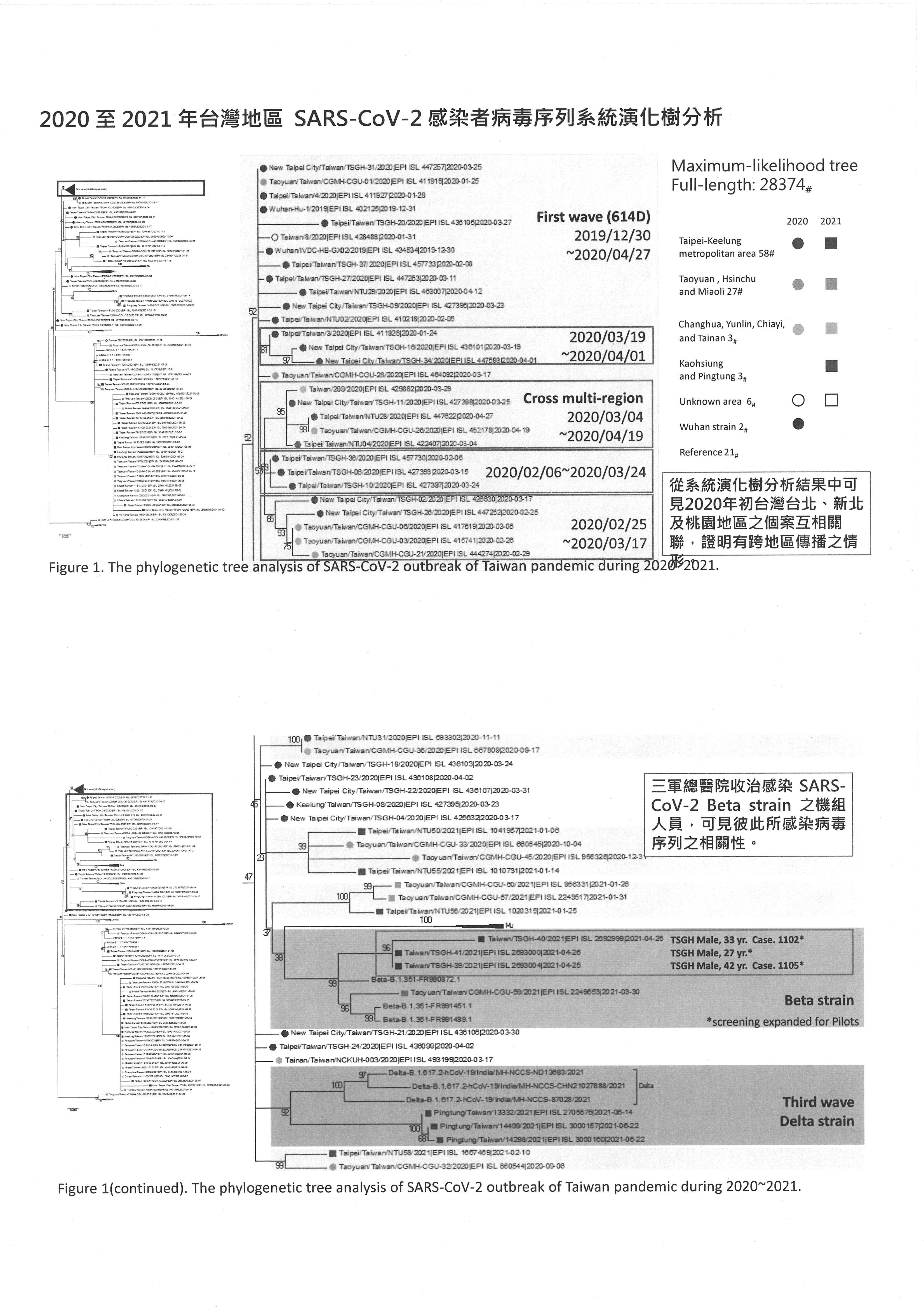 我們這個研究採選的個案來自於三軍總醫院國醫中心住院的個案,總共有二十幾位病人,大部分是來自於新北跟臺北,也有基隆的病例;另外,我們在做基因演化樹分析的時候,也採用了已經上傳到資料庫的臺灣地區八十幾條基因序列,根據總共超過一百條臺灣本土的全基因COVID-19基因定序,我們畫了這個演化樹。主要我給大家看的這個方法是Maximum-liklihood,整個基因演化樹的左邊其實是非常複雜的狀況,但是我們把它放大到中間的地方,就可以看到在2020年開始的第一波、第二波流行,已經開始有一些個案是在臺北、新北跟桃園地區互相傳播的情況,之後Beta、Delta株也是一樣,都有聚集的情況。當然最重要的是從三總收治的病人裡面,我們看到個案的全基因定序,其中1079就是貨機機師感染的個案跟1145在諾富特工作、住在蘆洲的水電工,還有後來造成新北、臺北跟基隆地區大流行的,全部都是cluster,全部都是在同一個演化樹,那這個演化樹就是Alpha strain的演化樹。換句話說,由這個基因定序還有演化樹的分析,很清楚的看到他們的聚集是有意義的聚集,是100%的cluster在一起,然後很清楚看到感染的源頭是1079這個個案。在諾富特那個污染的環境中,因為監控的不良造成了餐廳員工都有感染,然後水電工在餐廳用餐,感染之後又因為地緣關係,在蘆洲造成爆發,之後大家就很清楚整個源頭。換句話說,整個臺灣在2020、2021年這幾波的流行中,從這邊蓋棺論定,就是2020、2021年的Alpha strain的流行是諾富特這邊因為「3+11」政策的問題,然後外溢出來的。