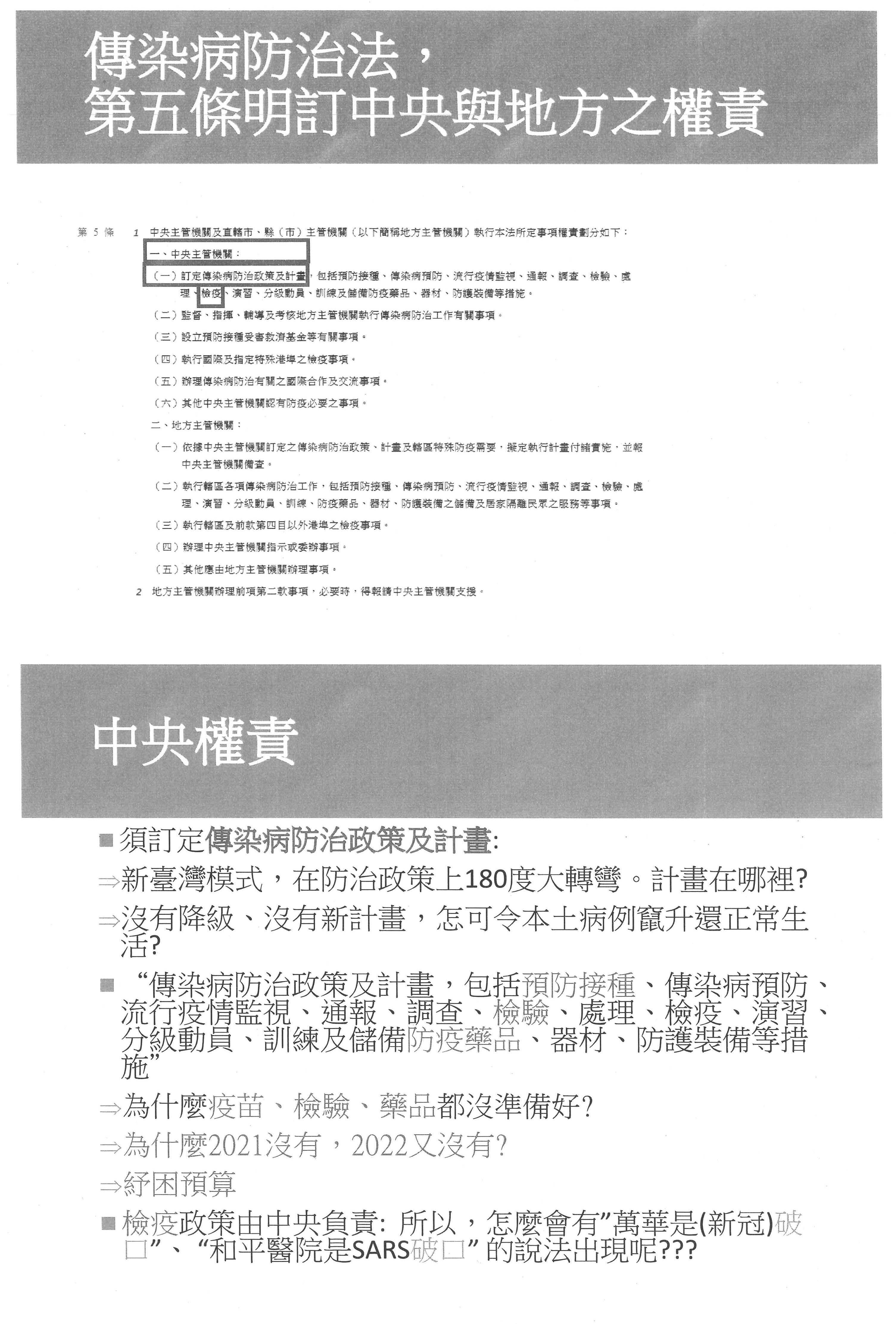 更令人不滿的是,我曾經在司法及法制委員會的防疫措施法制爭議公聽會表示,這些問題在法制方面的明確性、機關權責等問題,一點都沒有改善。除了嚴重特殊傳染性肺炎防治及紓困振興特別條例的第七條,傳染病防治法第三十六條、第三十七條是經常被濫用的條文,目前法院已經有若干判決糾錯,但是權責不明確就會造成推諉卸責,比如沒收投票權就是衛福部跟中選會的互推,還有許多諸如查緝口罩、八大行業,法定權責明明是中央、地方衛政單位,卻在這種不明確的實務作法上被推給地方的警察,造成警察負擔無限增加。