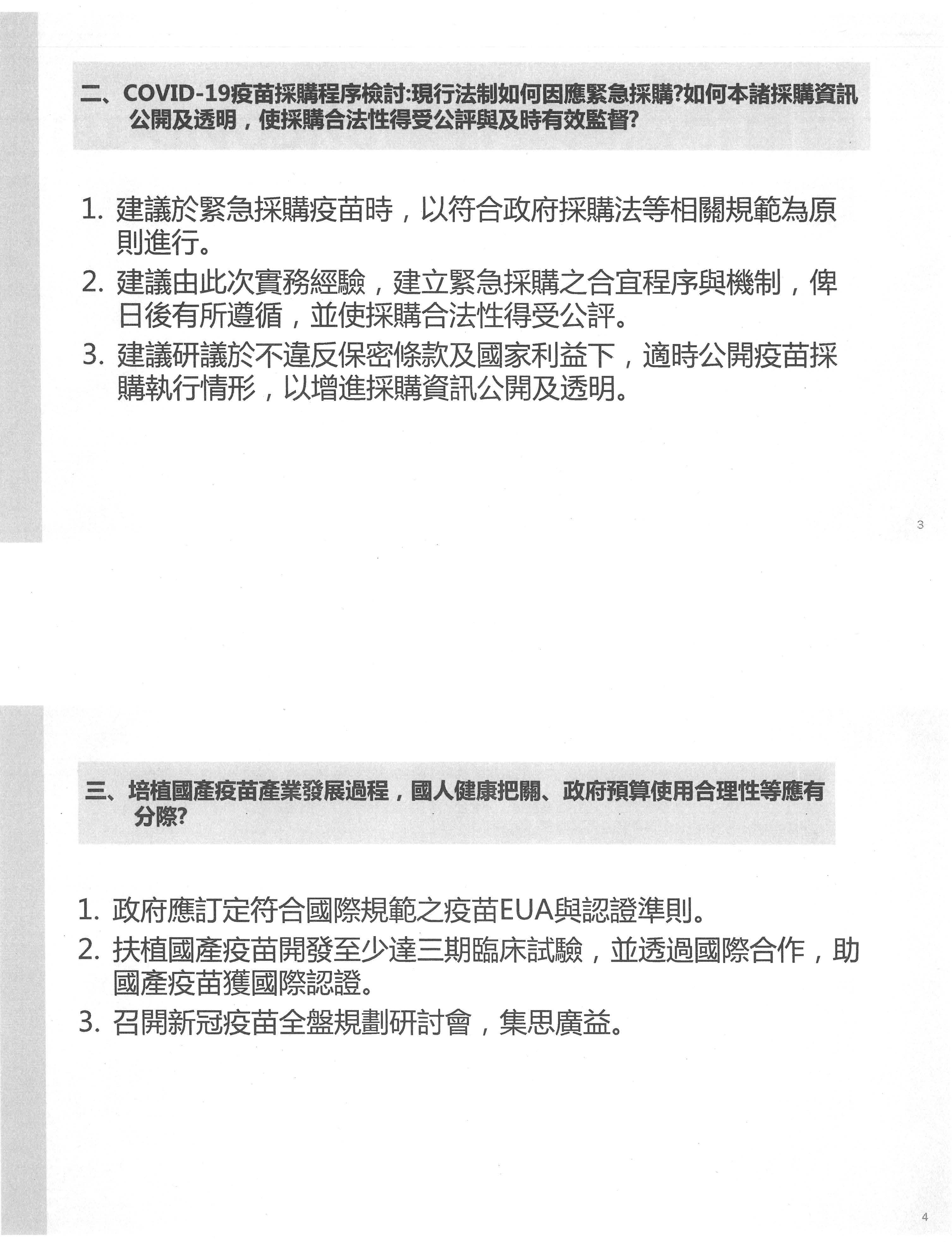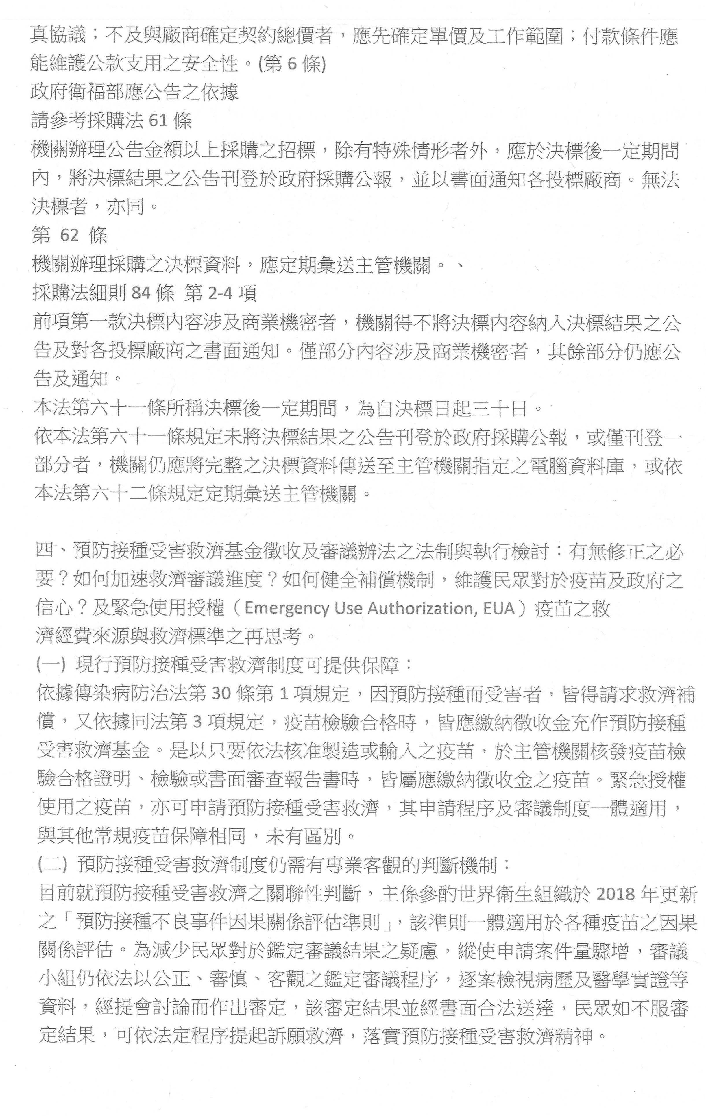 我還是做一些內容說明,在疫苗緊急採購部分,既然是法治國家,我們當然依法行政,根據與工程會的討論,用現行採購法還是足以因應相關措施,只是未來實際上要怎麼執行這一點還要再討論。另外,商業保密期限是否可以縮短、內容可不可以再縮小?這其實是滿好的方向。